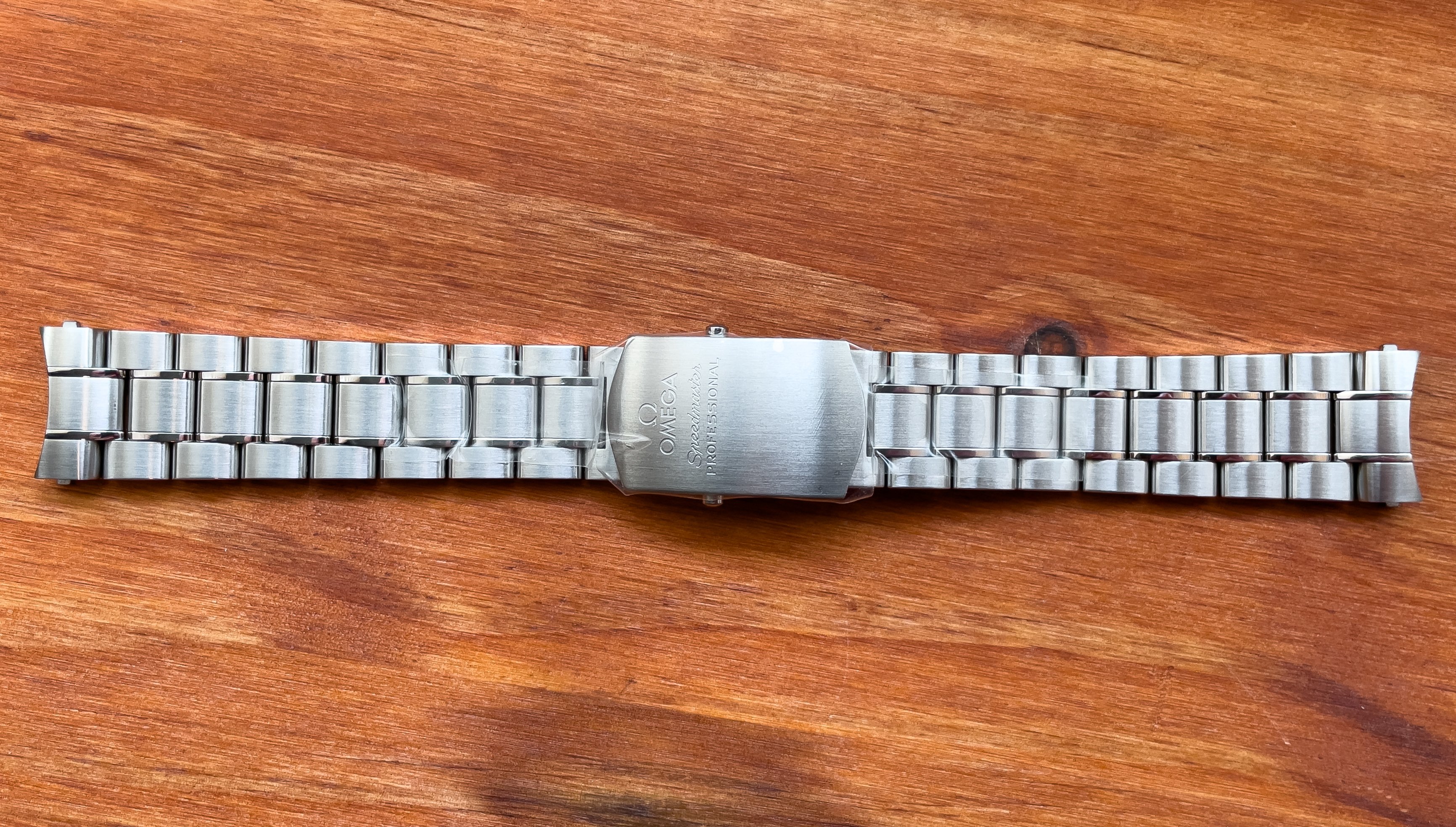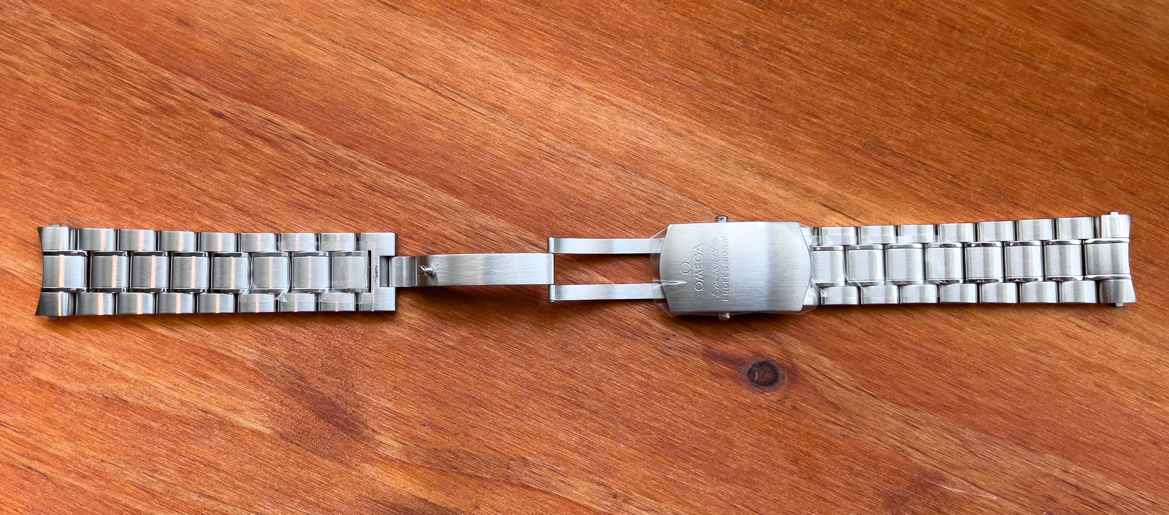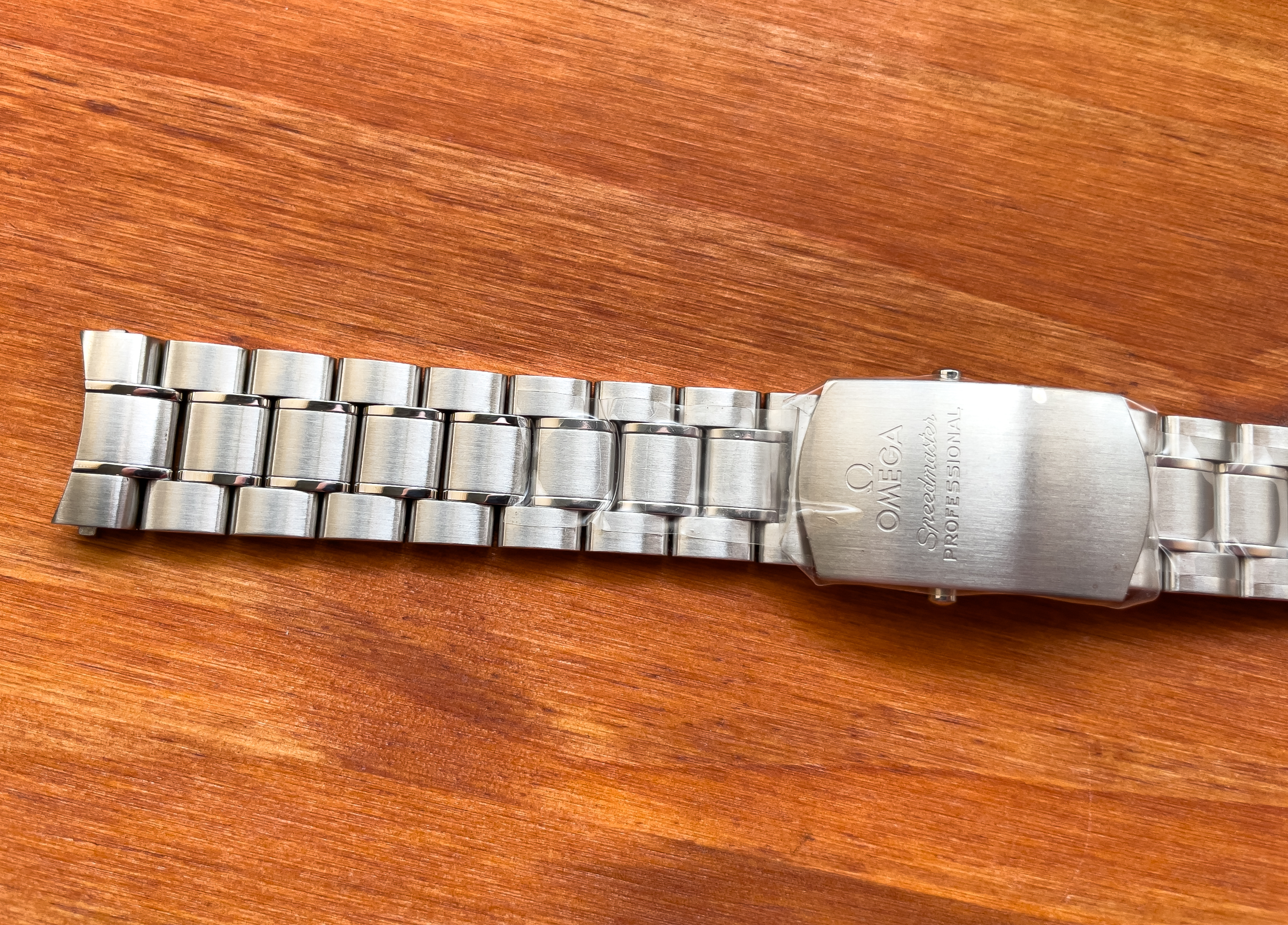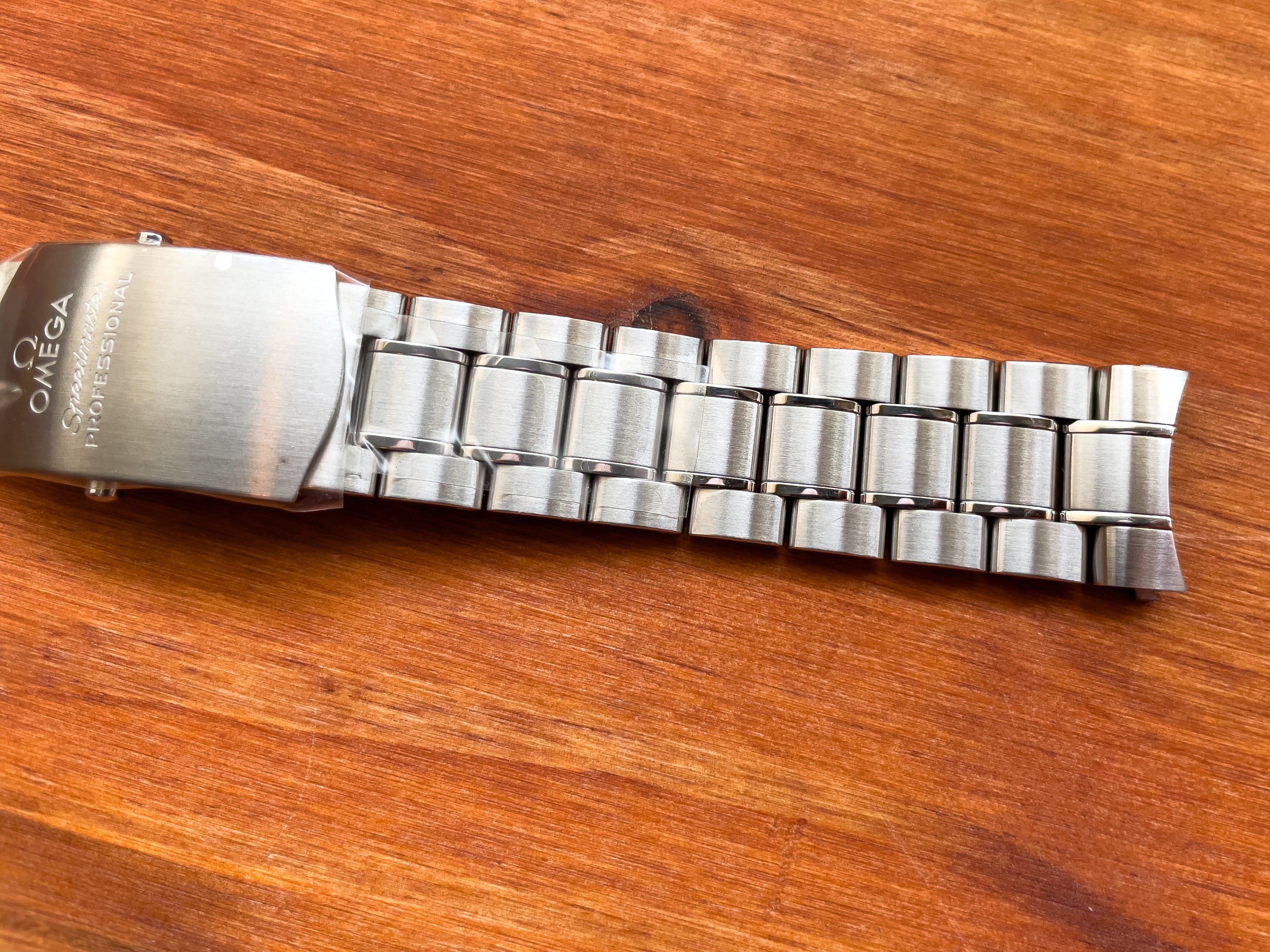 For sale is a brand new, unworn, and never resized bracelet pulled from my 1861 Speedy that I had purchased this year. I am the first owner of this watch, and as soon as I signed for the shipment and pulled the watch out of the box, I removed the bracelet and left if in the box. All the original protective stickers are still in place and have never been removed. As it has never been worn or resized, all the links are in place and in new condition. In image #6, you will see a small rub mark on the link that attaches to the clasp. I'm going to put this down to the bottom side of the clasp rubbing against said link during shipment to me from Omega. It's superficial and remains unseen when the clasp is closed.