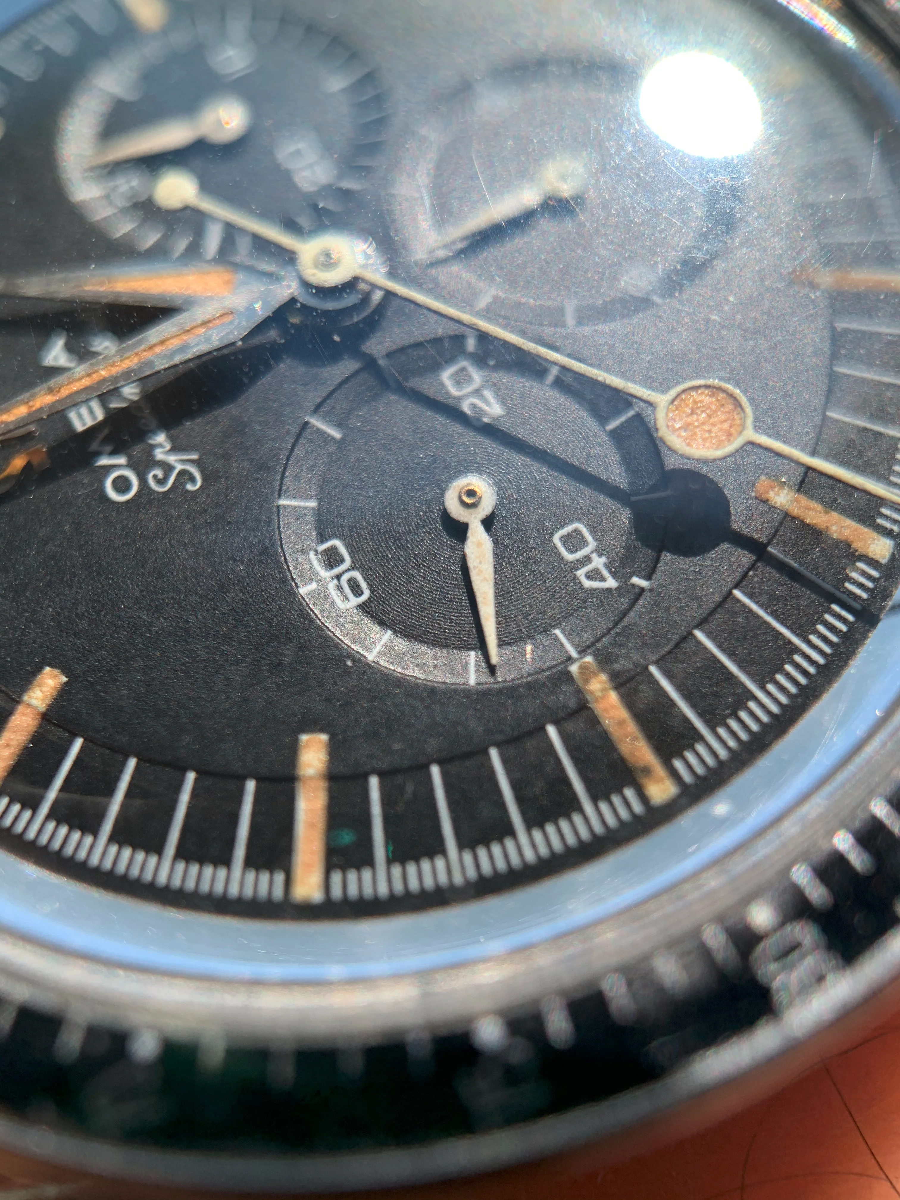 These hands have been relumed at my instruction. I did this, because they were previously relumed in the early 1990's...and looked horrible when I took custodianship of this watch ... pond-muck-green ... yuk ... mind the wrist cheese ...