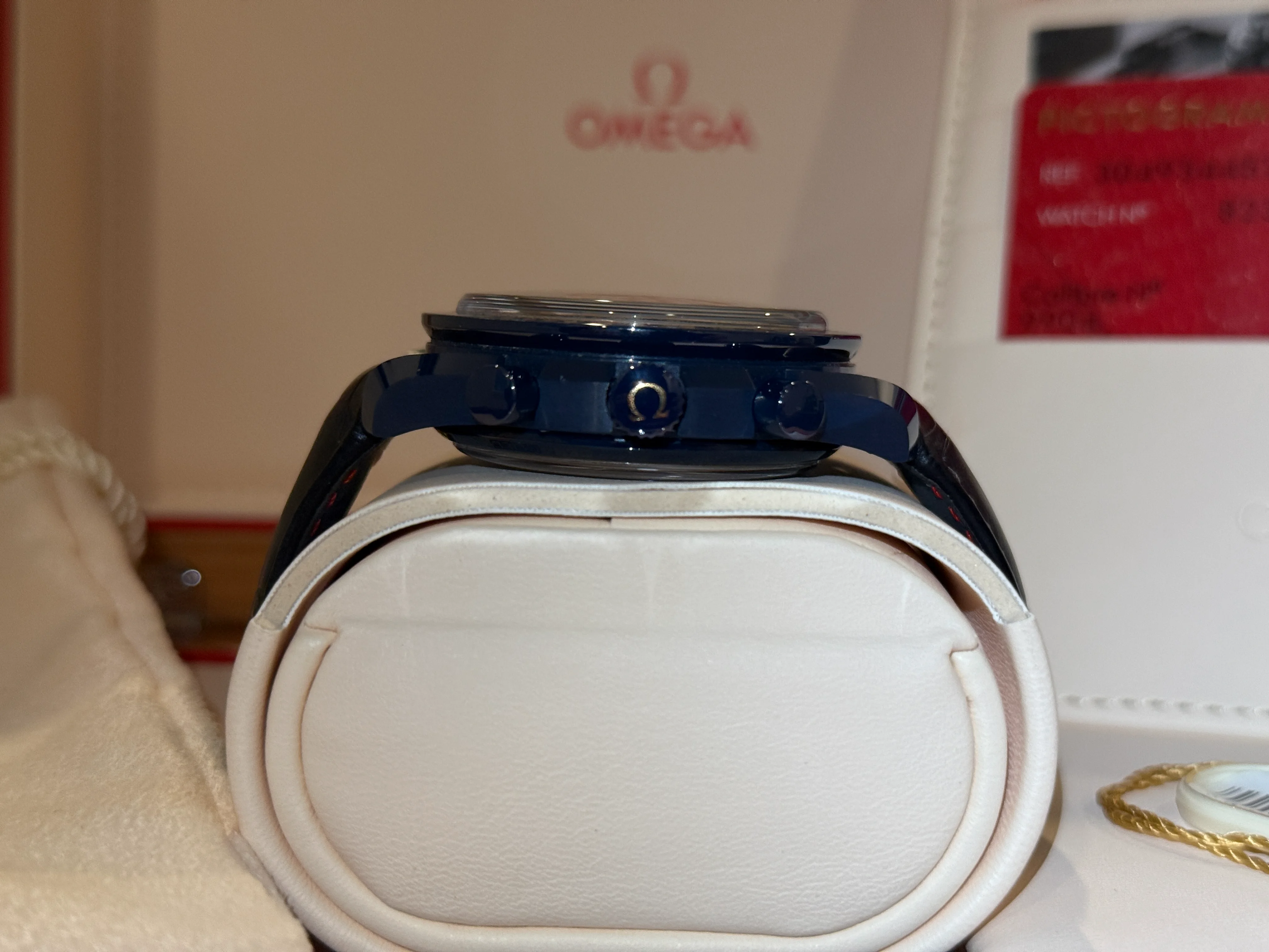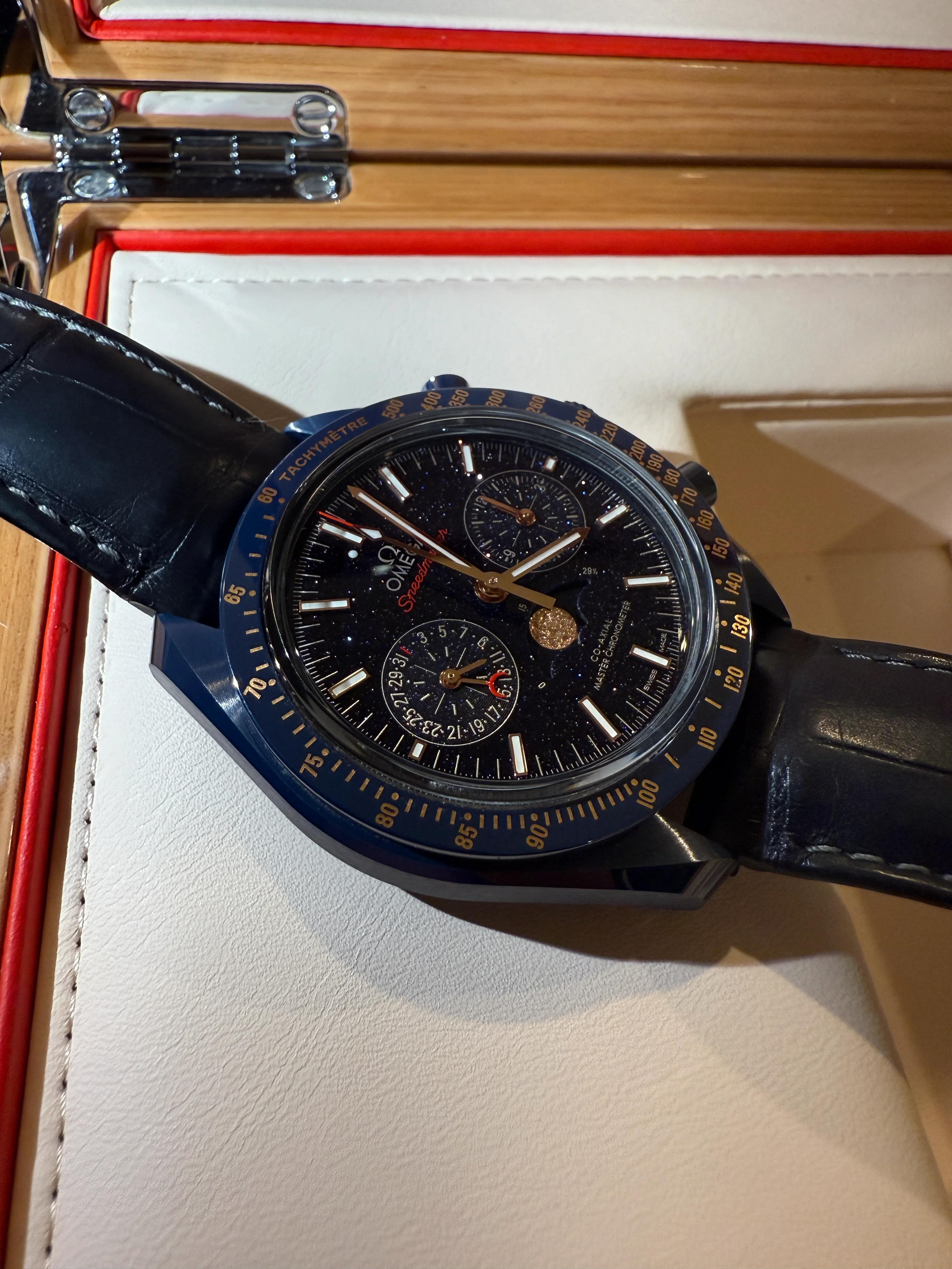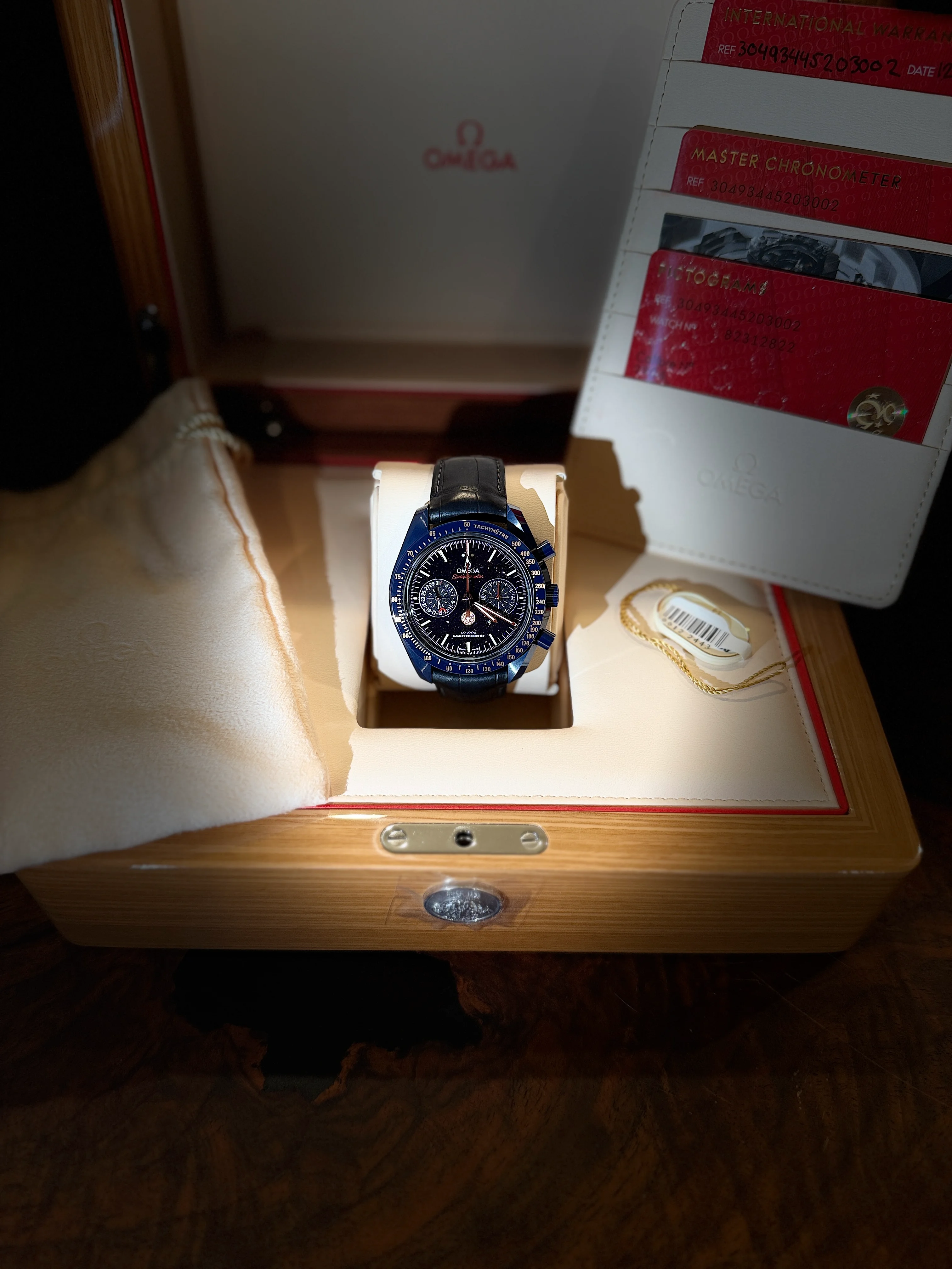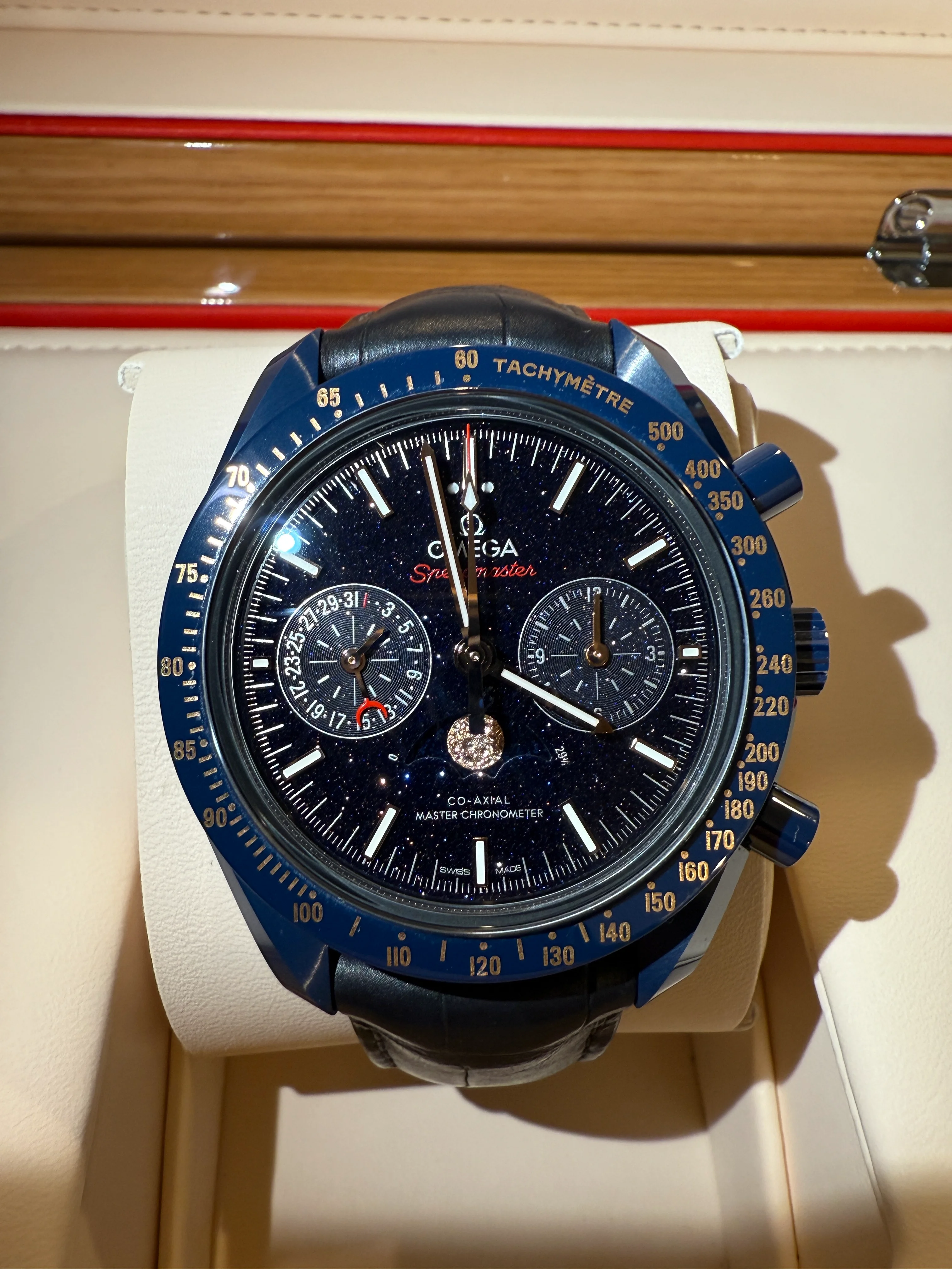 ·Up for sale is an Omega Speedmaster 44.25MM Co-Axial Master Chronograph MoonPhase Caramic Blue Side Of The Moon Aventurine Dial 304.93.44.52.03.002 on Leather Strap Box with International Warranty Card. The timepiece is in excellent condition.
