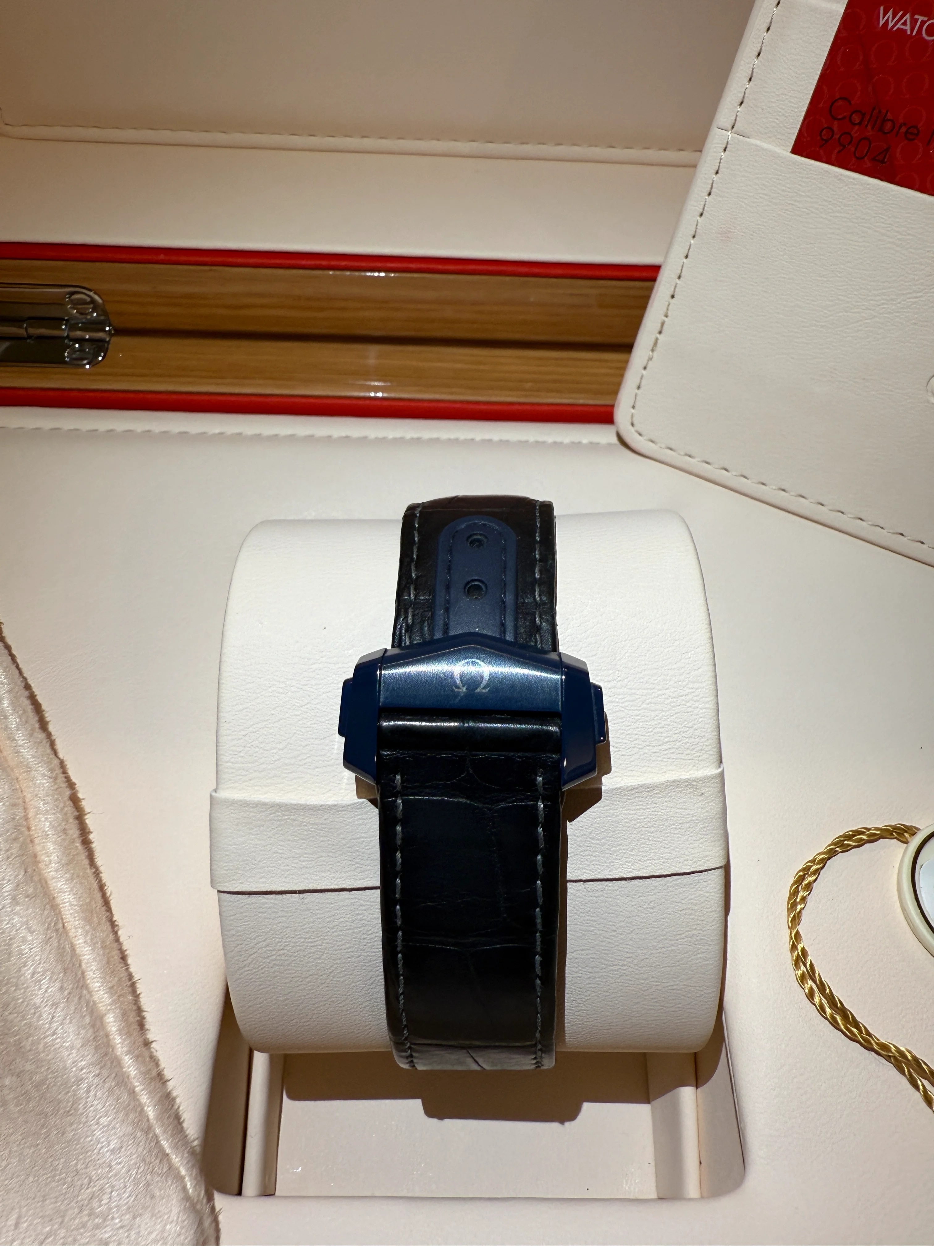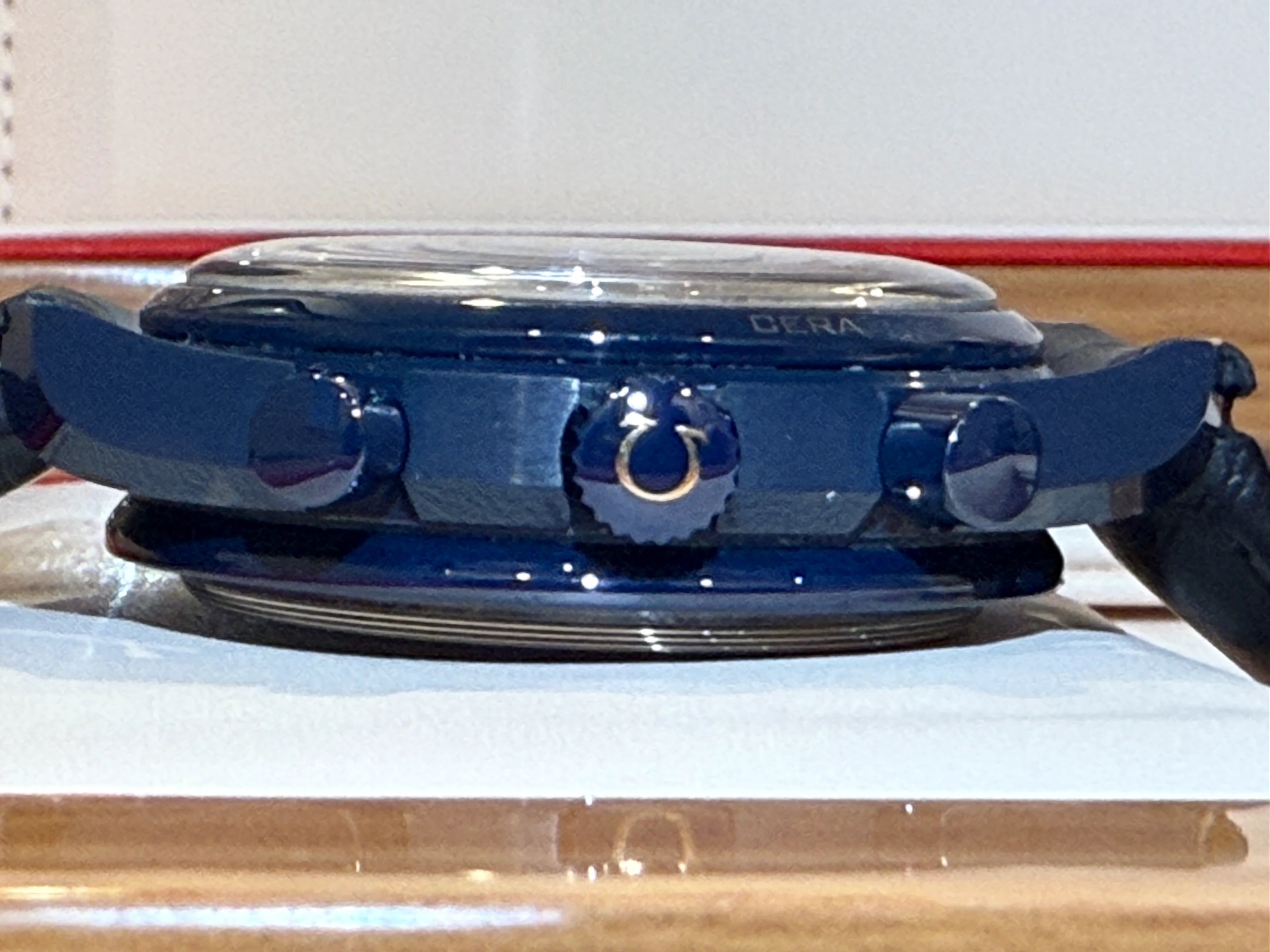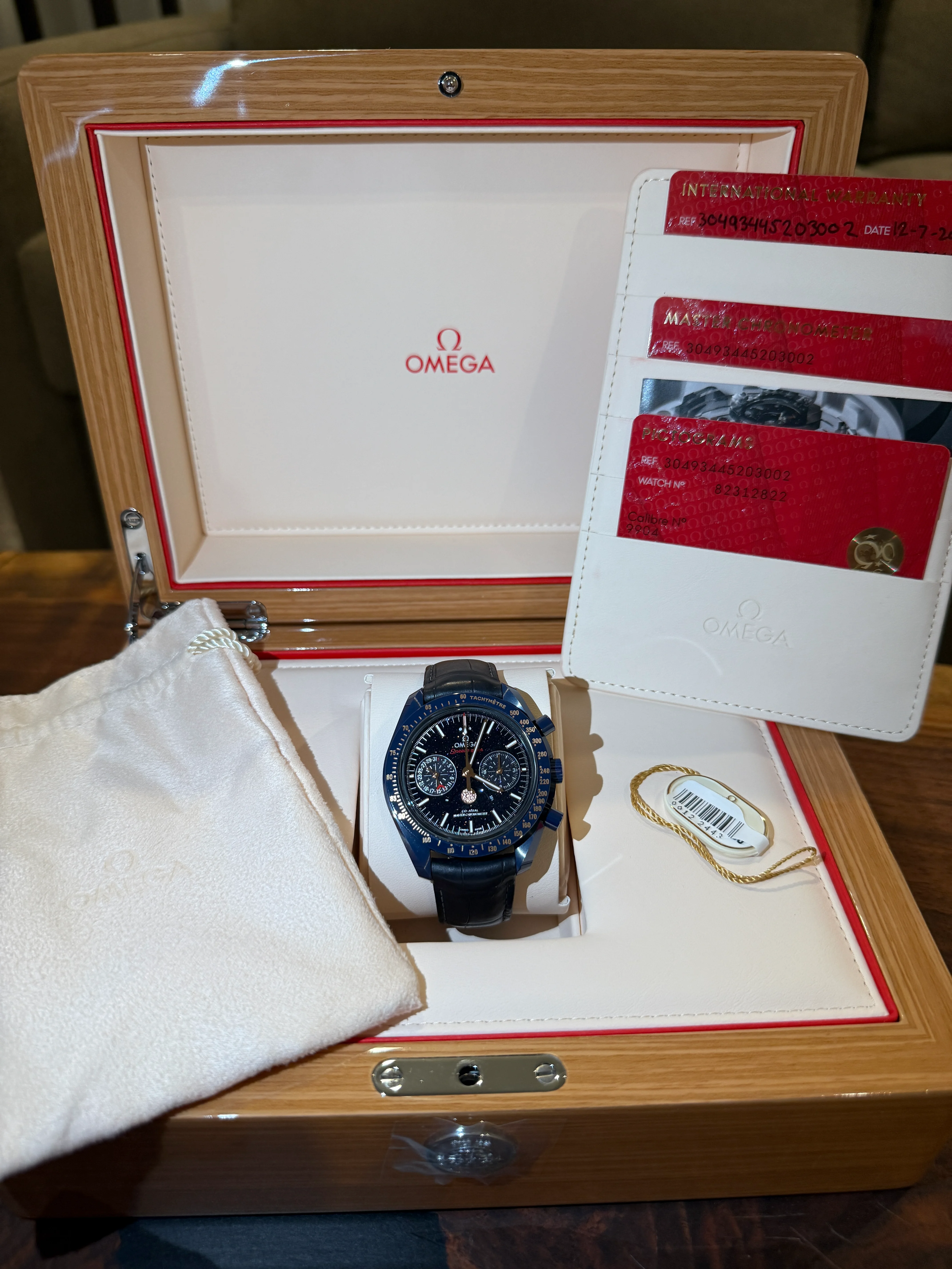 ·Up for sale is an Omega Speedmaster 44.25MM Co-Axial Master Chronograph MoonPhase Caramic Blue Side Of The Moon Aventurine Dial 304.93.44.52.03.002 on Leather Strap Box with International Warranty Card. The timepiece is in excellent condition.