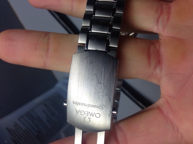 Domed Sapphire crystal is flawless, Chronograph works perfectly. No major dings/dents/scrapes anywhere, though minor swirlies periodically. The clasp has a minor desk diving mark that cannot be felt with the finger, and could easily be polished off if you so desired. Pics show the condition. you can see on the second to last picture that the red dot is still in tact.