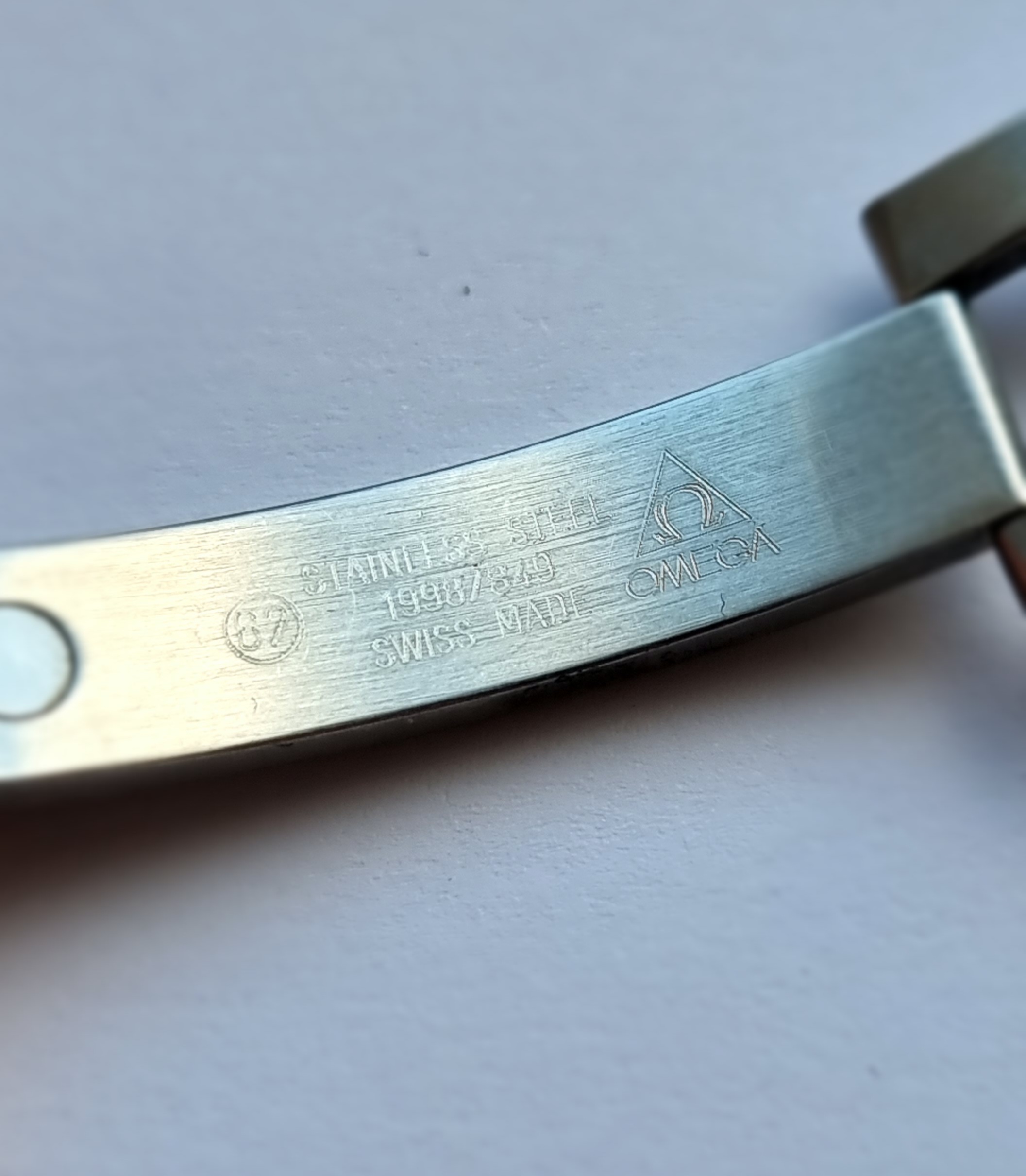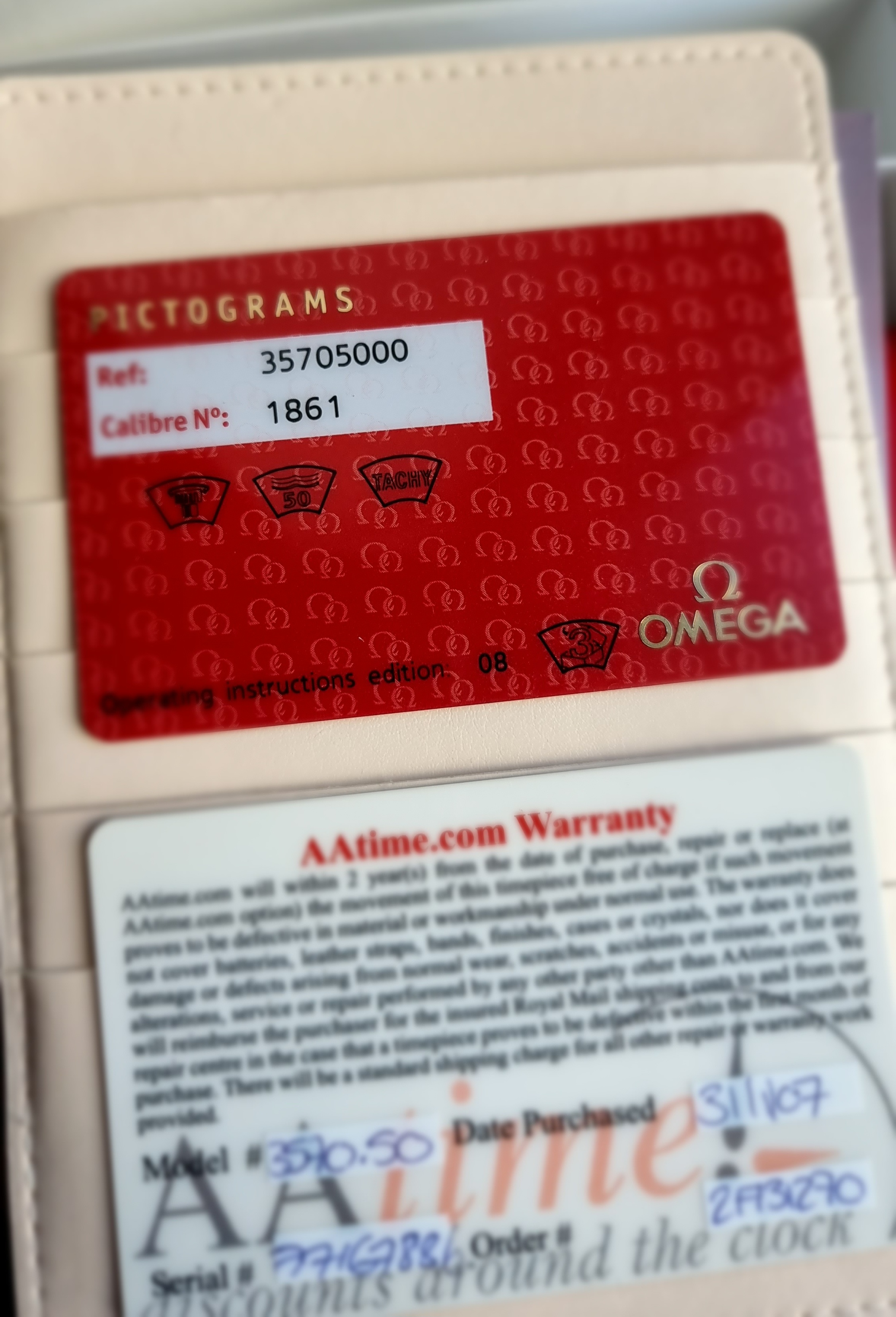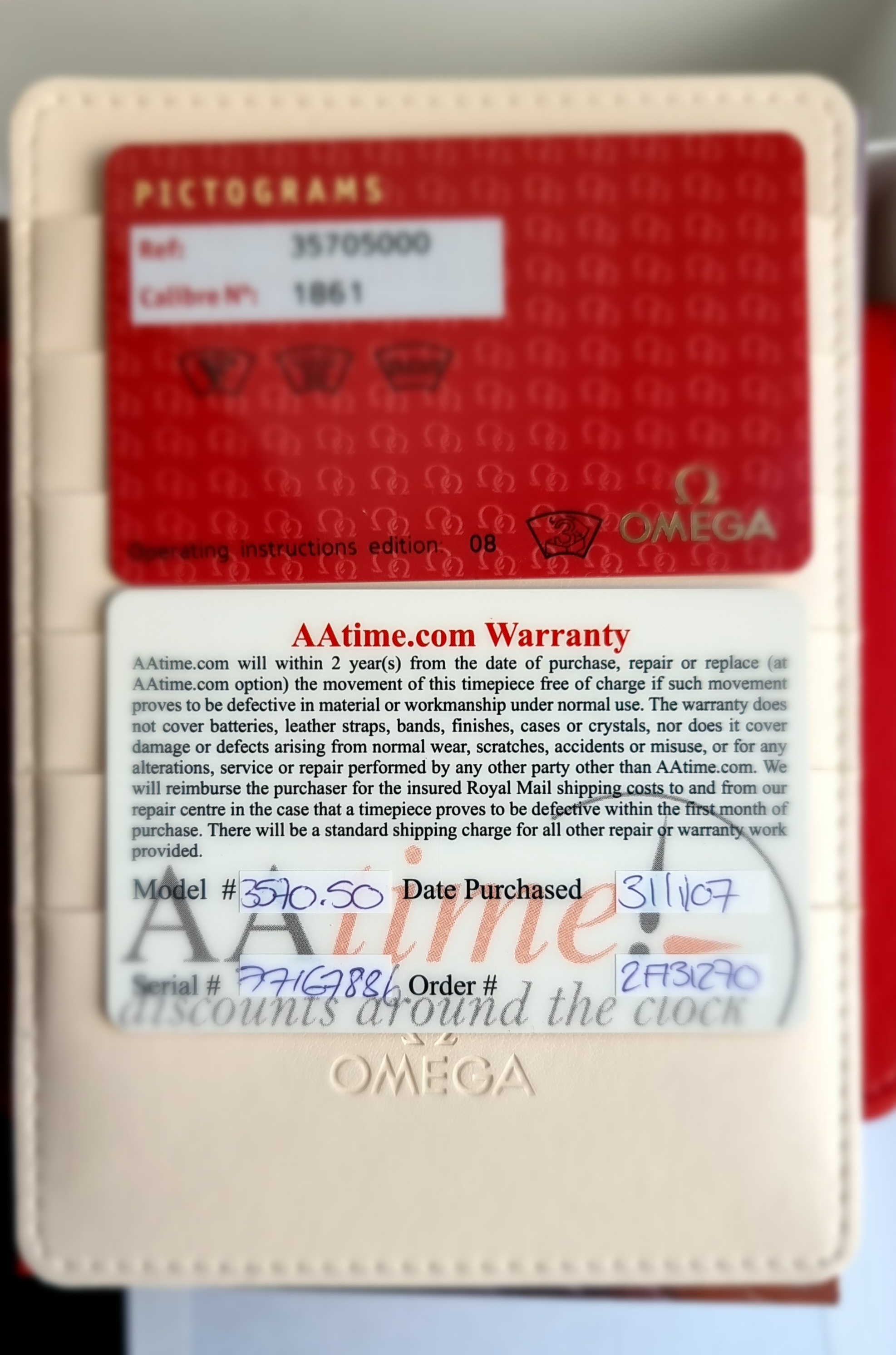 The watch comes in its original inner/outer box, cards are in the original Omega leather wallet and the Omega instruction book is present. The original hang tag is also included with matching serial number. The warranty card is from A.A Time Jewellers and is dated 31/01/2007. The original Omega pictogram card is there. I would assume the original Omega card lost, and the jewellers card was included at this point of sale. The 77m serial dates to circa 2005, so this was possibly the next time it was sold on.