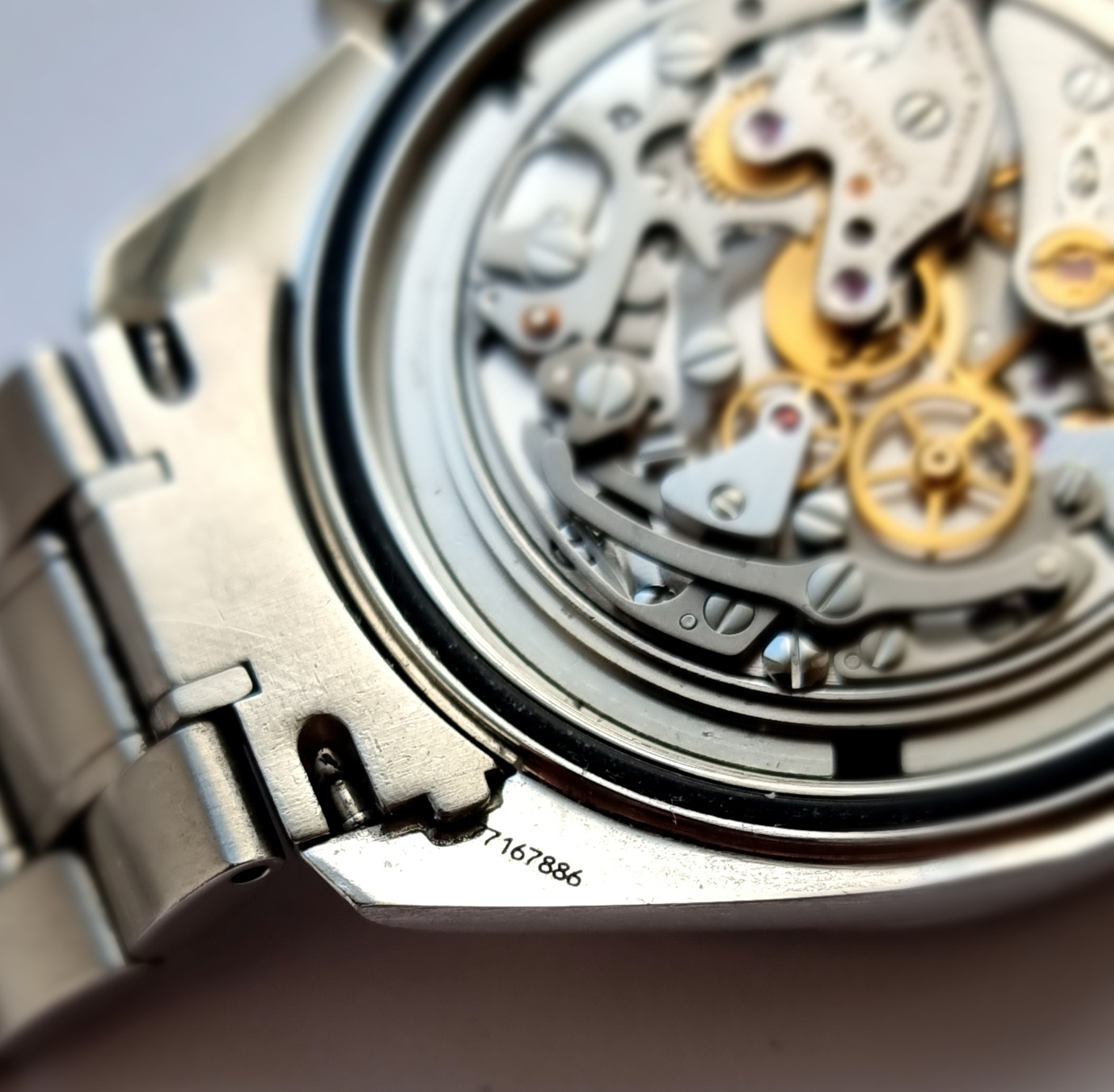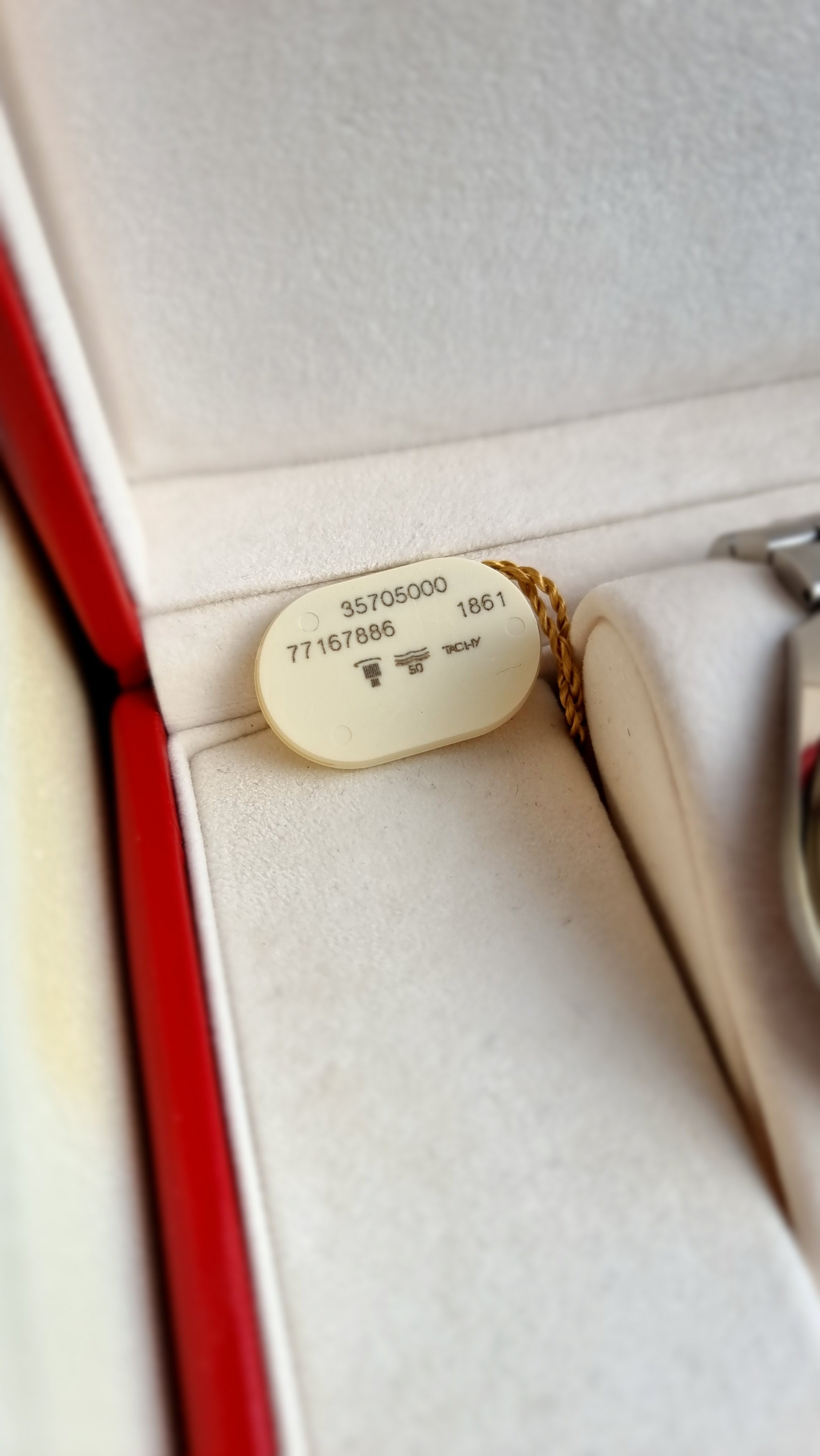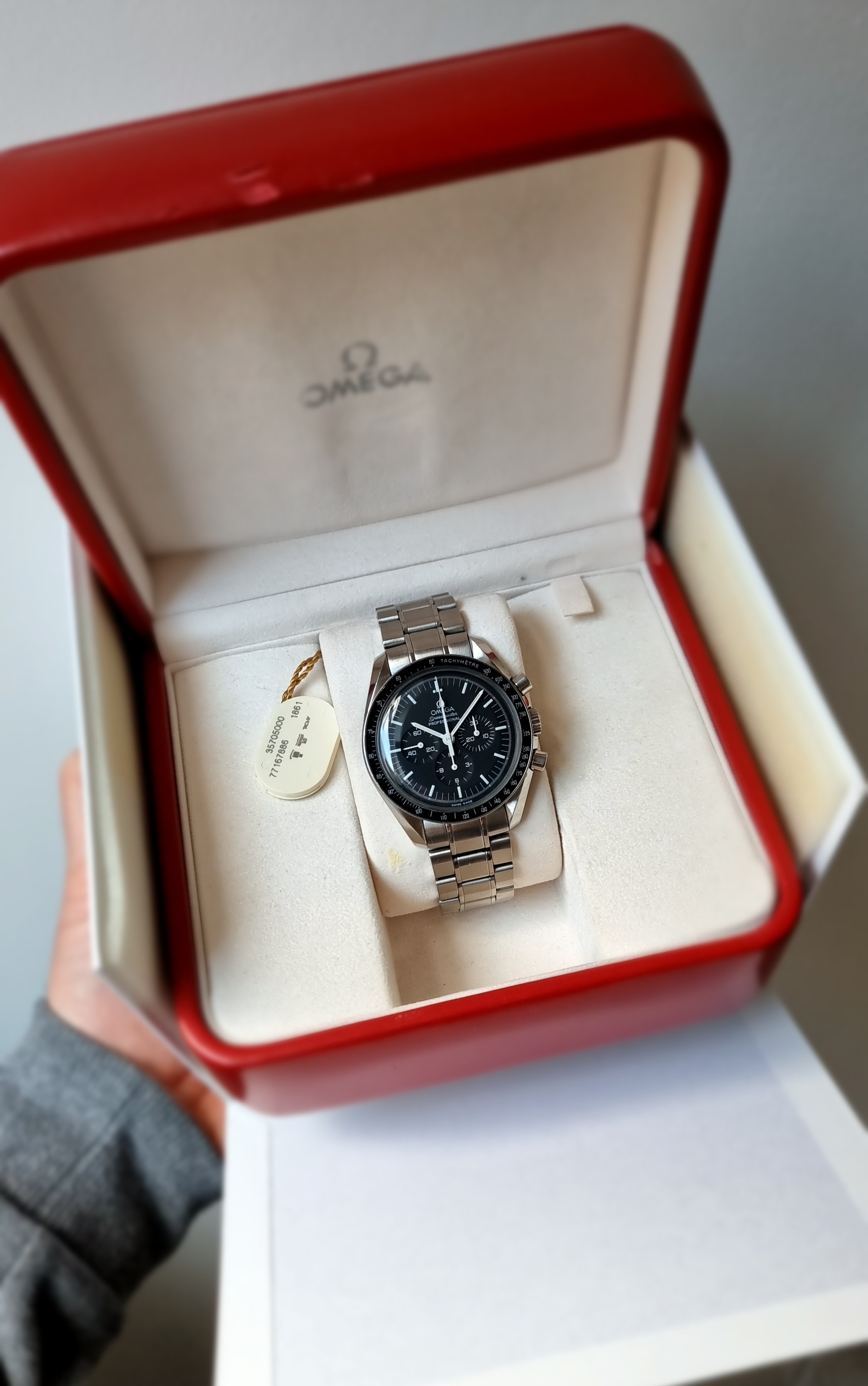 The watch comes in its original inner/outer box, cards are in the original Omega leather wallet and the Omega instruction book is present. The original hang tag is also included with matching serial number. The warranty card is from A.A Time Jewellers and is dated 31/01/2007. The original Omega pictogram card is there. I would assume the original Omega card lost, and the jewellers card was included at this point of sale. The 77m serial dates to circa 2005, so this was possibly the next time it was sold on.