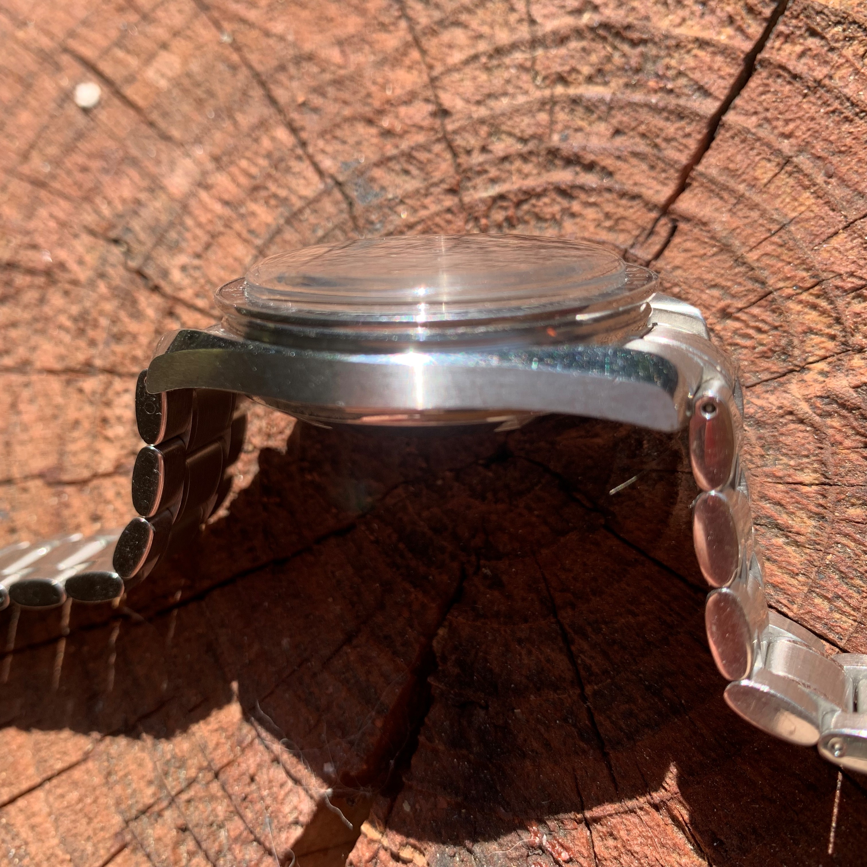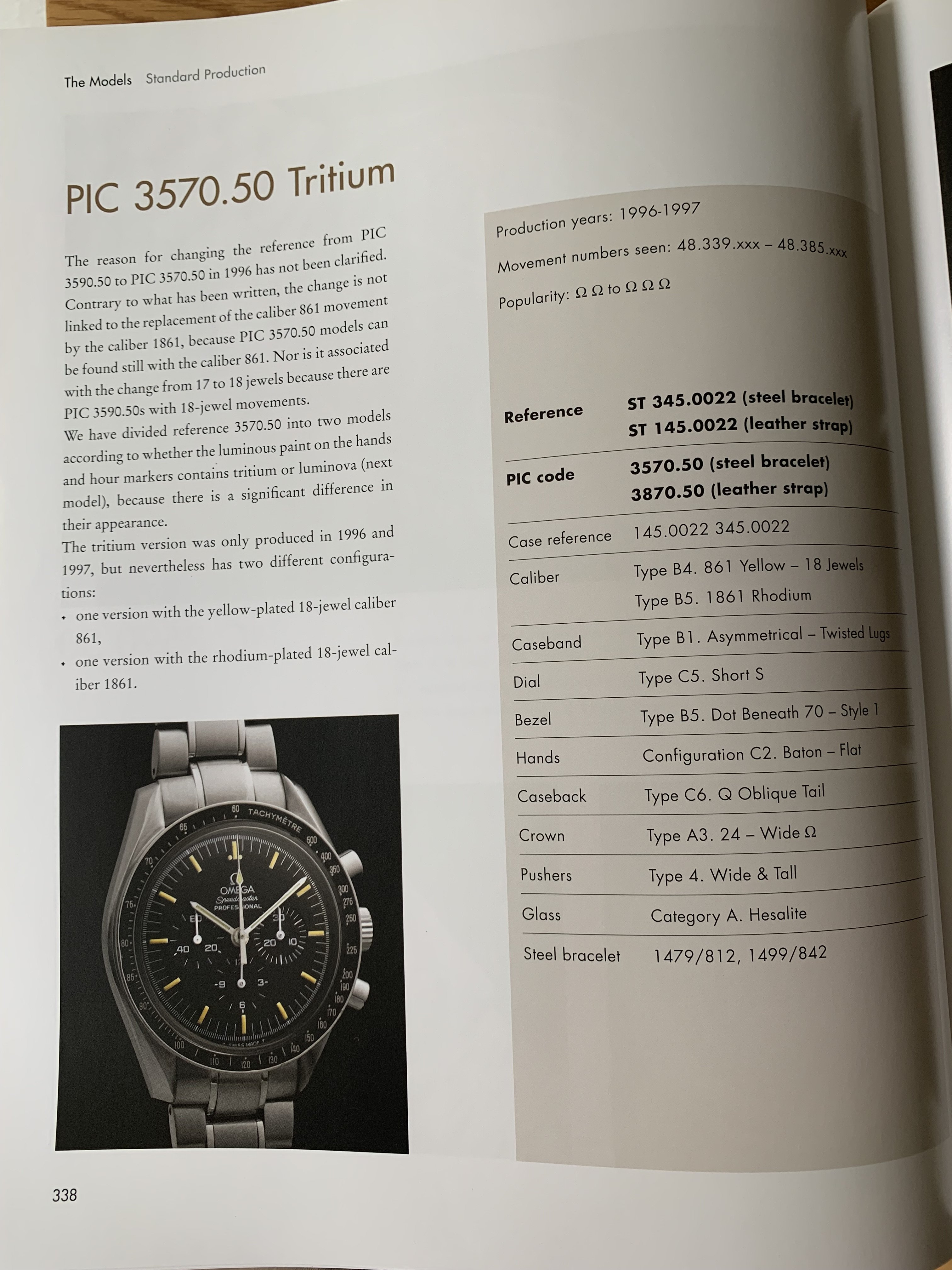 It is well know that in the transition from 3590.50 (Tritium, cal.861) to 3570.50 (Superluminova, cal.1861) that there were some crossover of parts between the two references. This happens to be the case on this one. It has the designation, caseback/pic number, bracelet of the 3570.50's, but with a Tritium dial and handset (instead of a Superluminova dial and handset), and a 18jewel caliber 861 movement instead of a caliber 1861. As such it has one of the newest 861's around, and its quirky, having one extra jewel to all the other 861's that were made for about 30 years prior. This apparently happened for about a year. I am certain Archer can explain why this extra jewel is totally unnecessary.