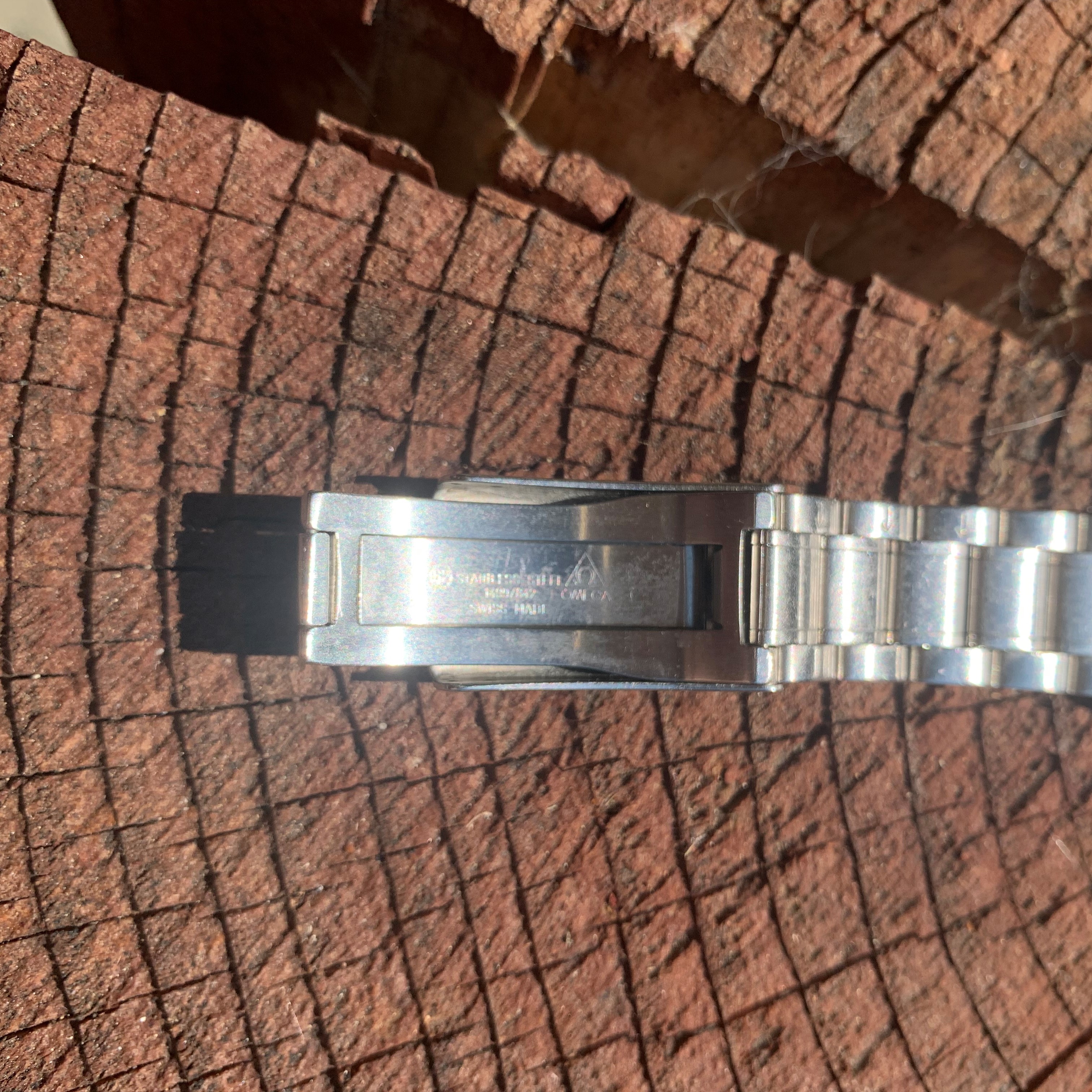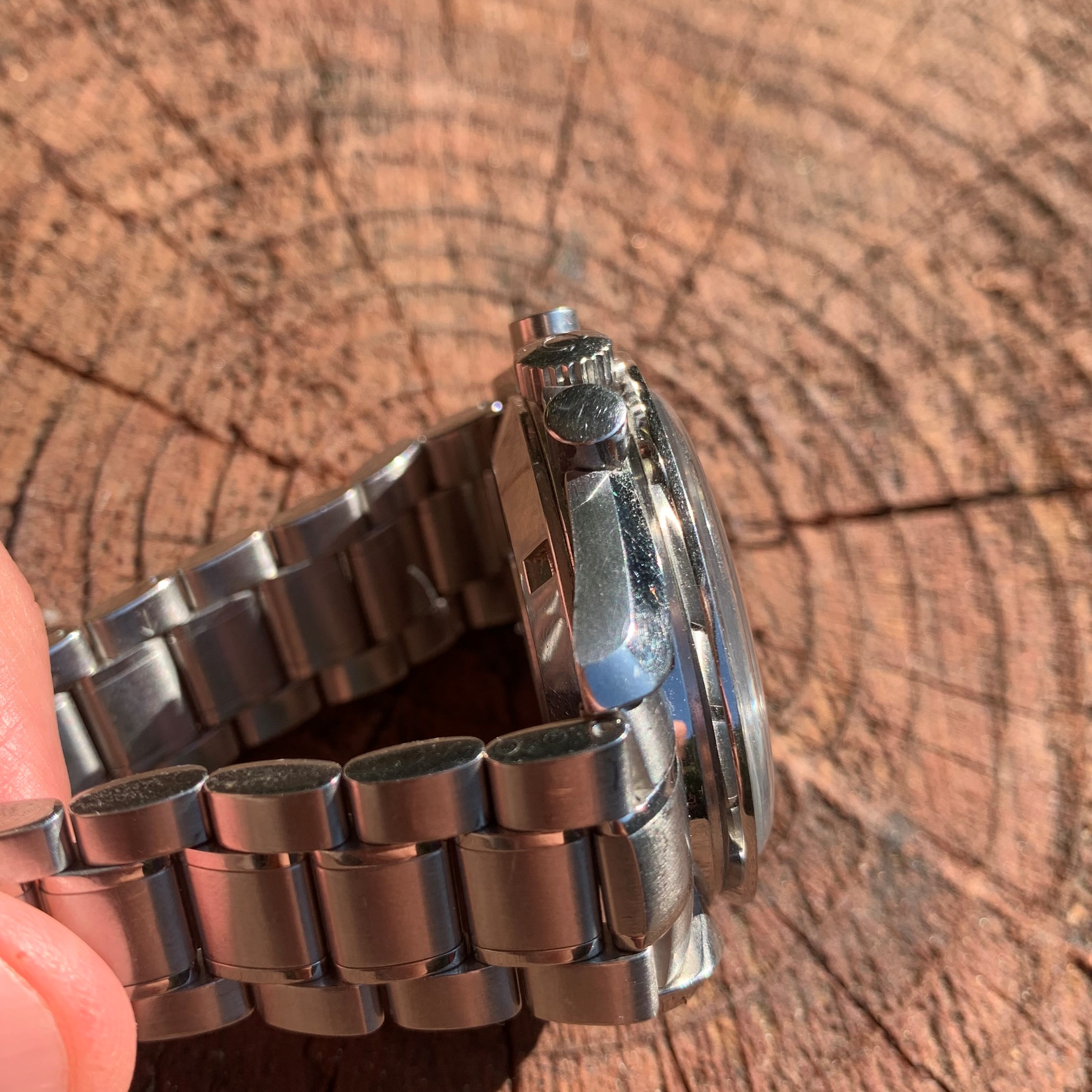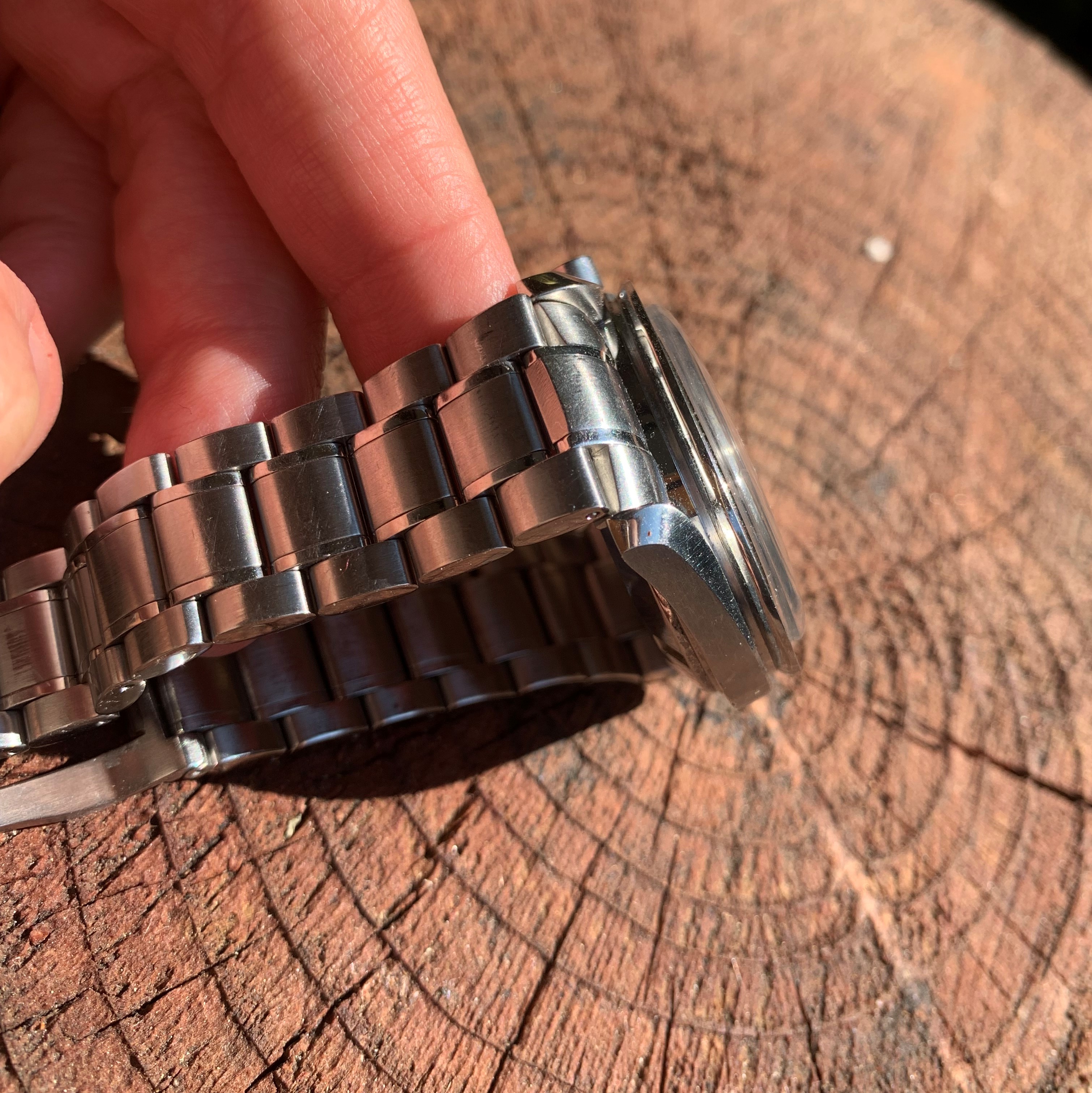 The case is factory original and shows signs of wear, but nothing excessive. Just enough wear to not be self-conscious about. Please see the 'other' set of pictures. I wore this watch sparingly post service, so I did not add any wear to the case or bracelet.