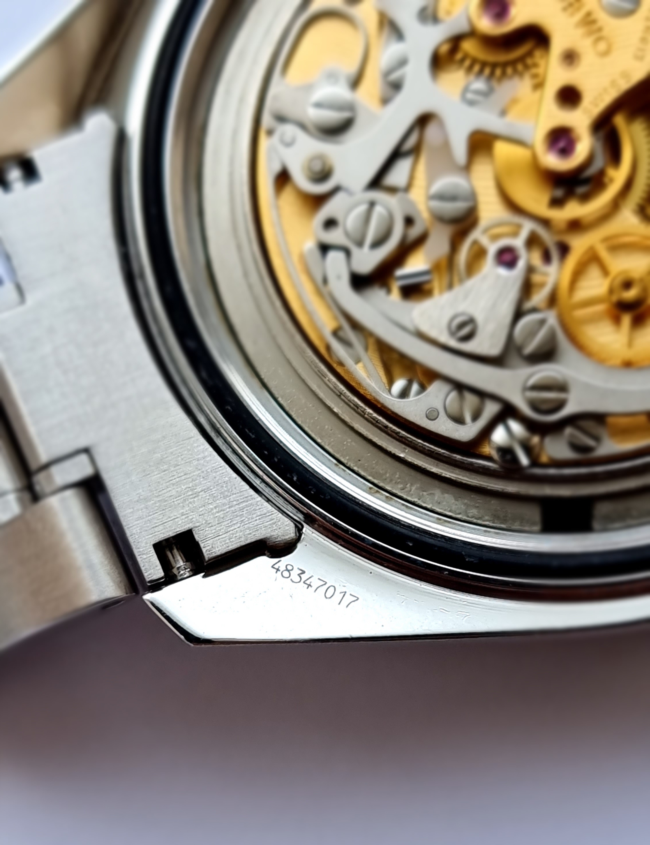 Serial 48347017, tritium dial and hands, 1499-842 bracelet, B4 cal 861 yellow (serviced), dial C5 short S, bezel B5 dot beneath 70 and A3 wide crown.