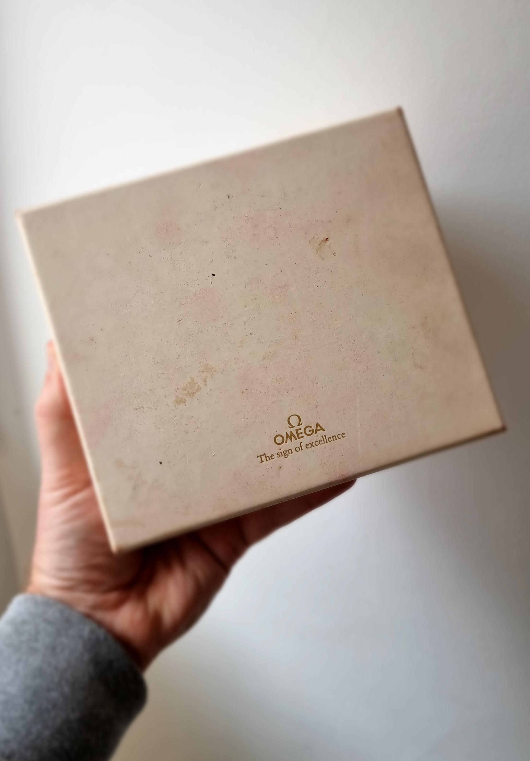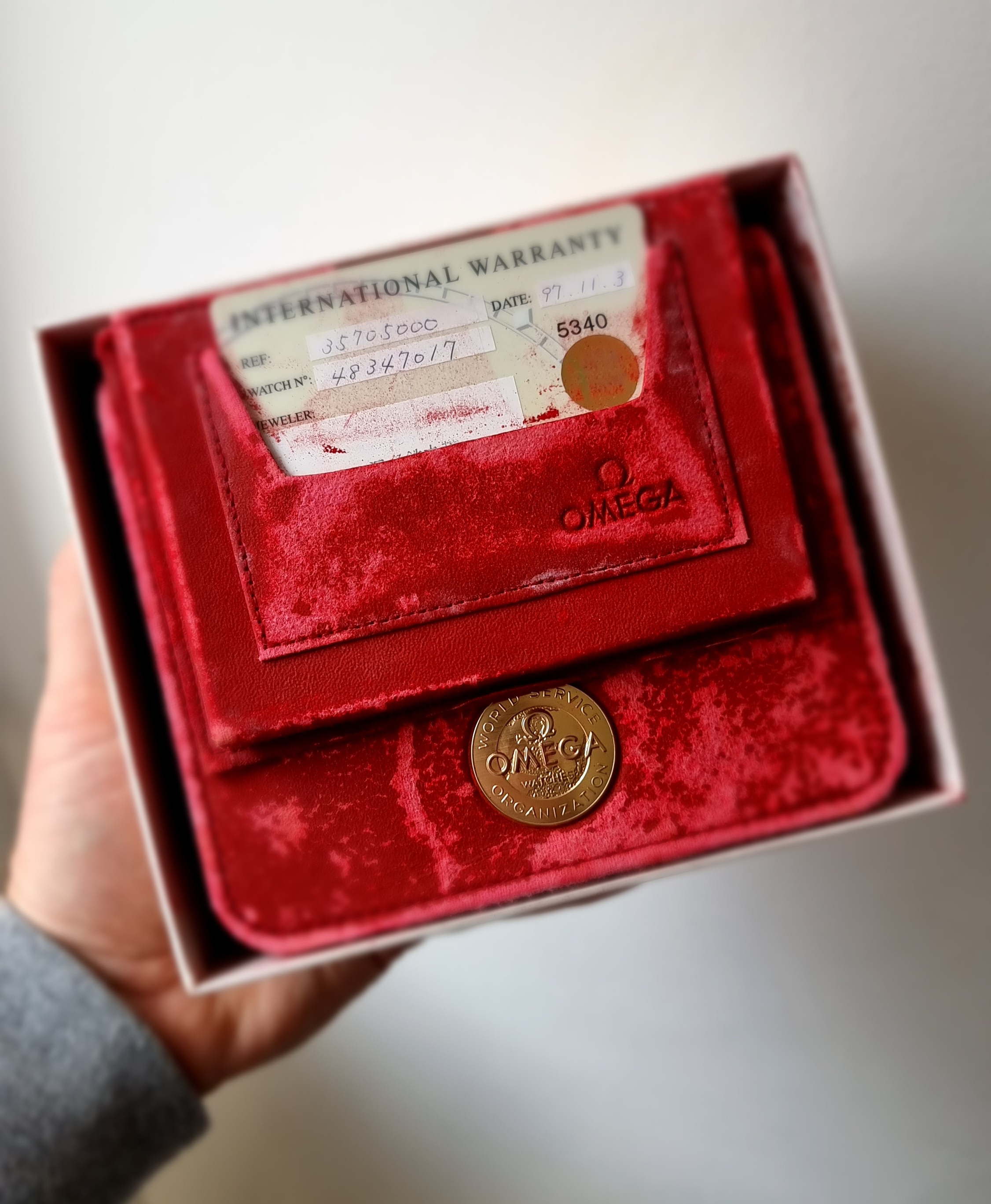 This watch is a full-set with inner/out boxes, red wallet and cards, and booklets. The serial is 48347017 and that matches the lug number. The matching card shows a sale date of 3.11.1997. The box has deteriorated and this is common with this type of soft red box/wallet that were issued in the late 1990s.
