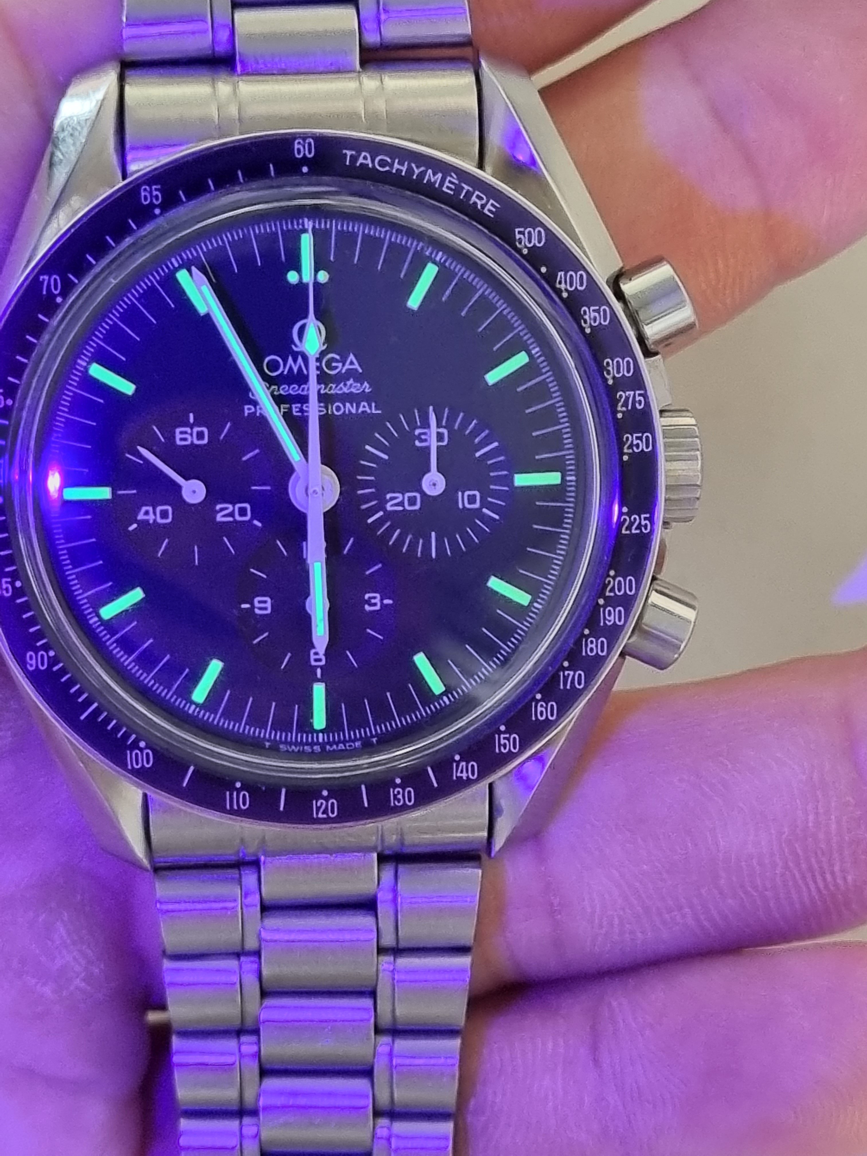 The dial and hands are original with tritium (see last picture under UV). The color of the tritium is beautiful. The bezel is slighlty discolored but without particular signs or dings.