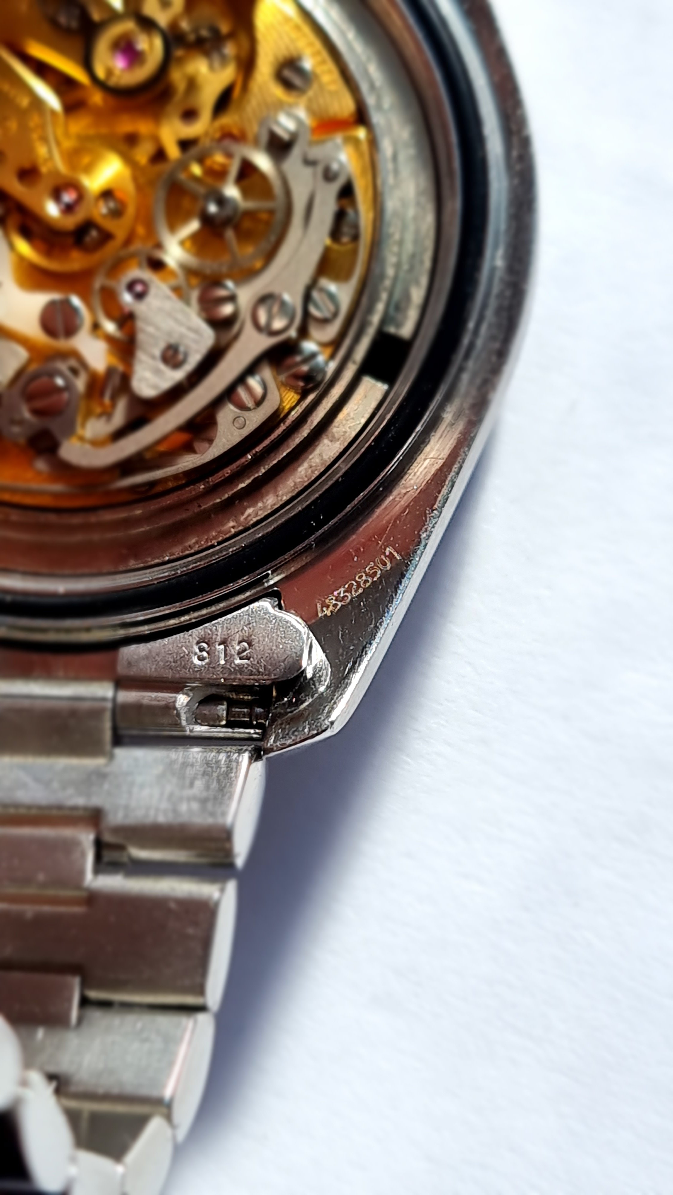 The case is in superb condition and appears unpolished to me. The dial and hands have aged to a lovely custard yellow patina as is often seen with these 90s references. The serial is 48328501 which is within the range for 3590.50, and this matches the etched lug serial seen on the case.