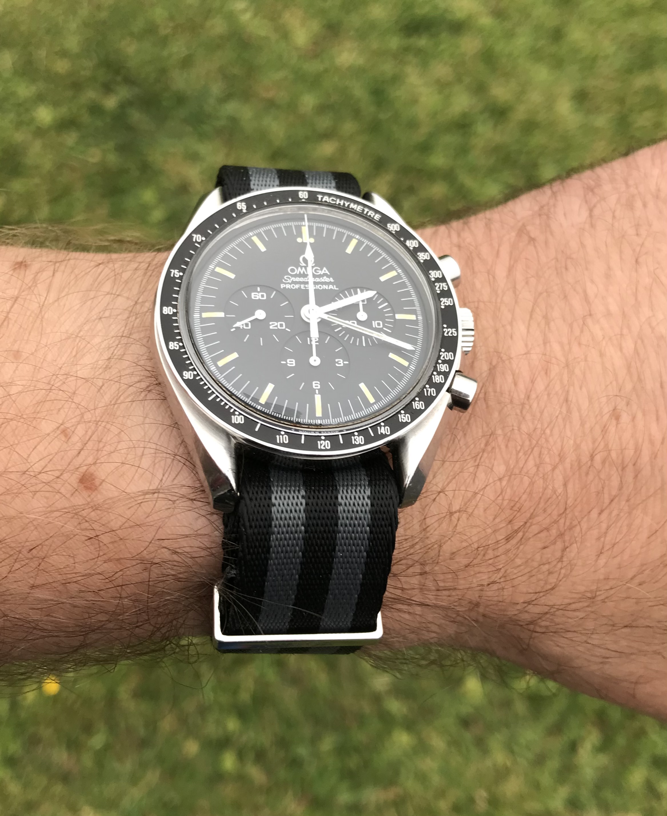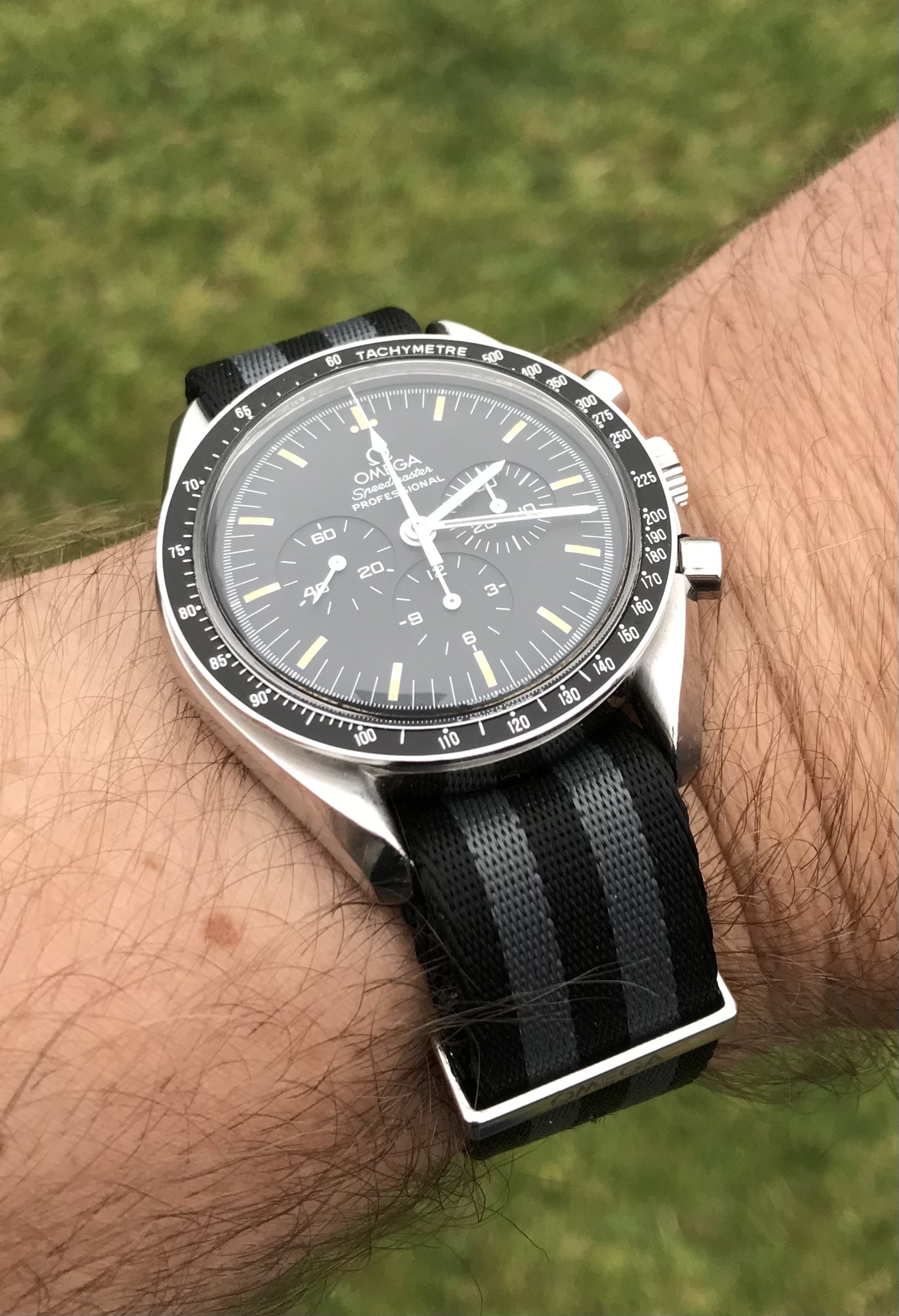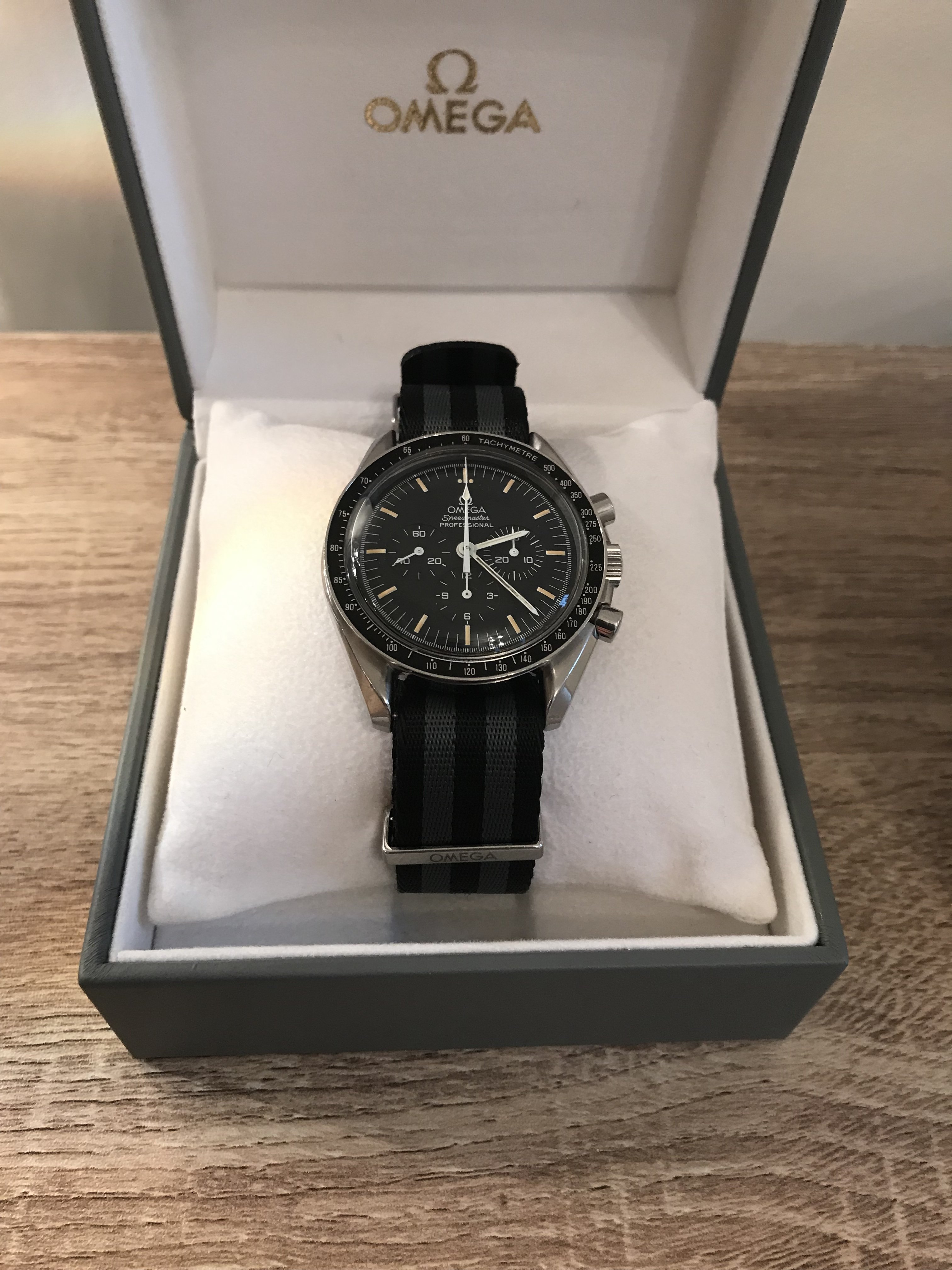 I’m offering an early 1990s Omega Speedmaster on an Omega NATO strap with all accessories, including International Warranty Card, inner and outer boxes and the sought after early 90’s manual.