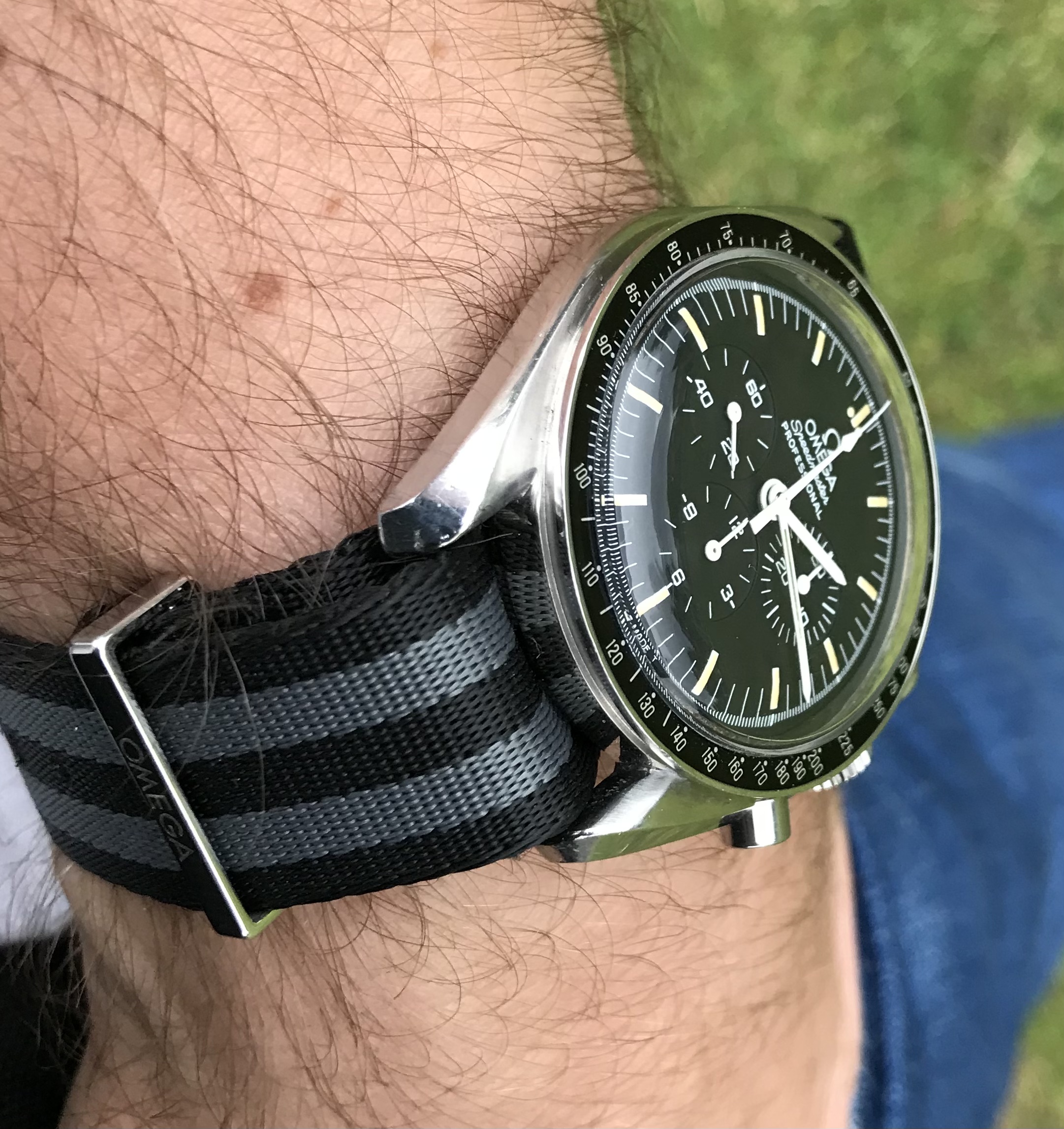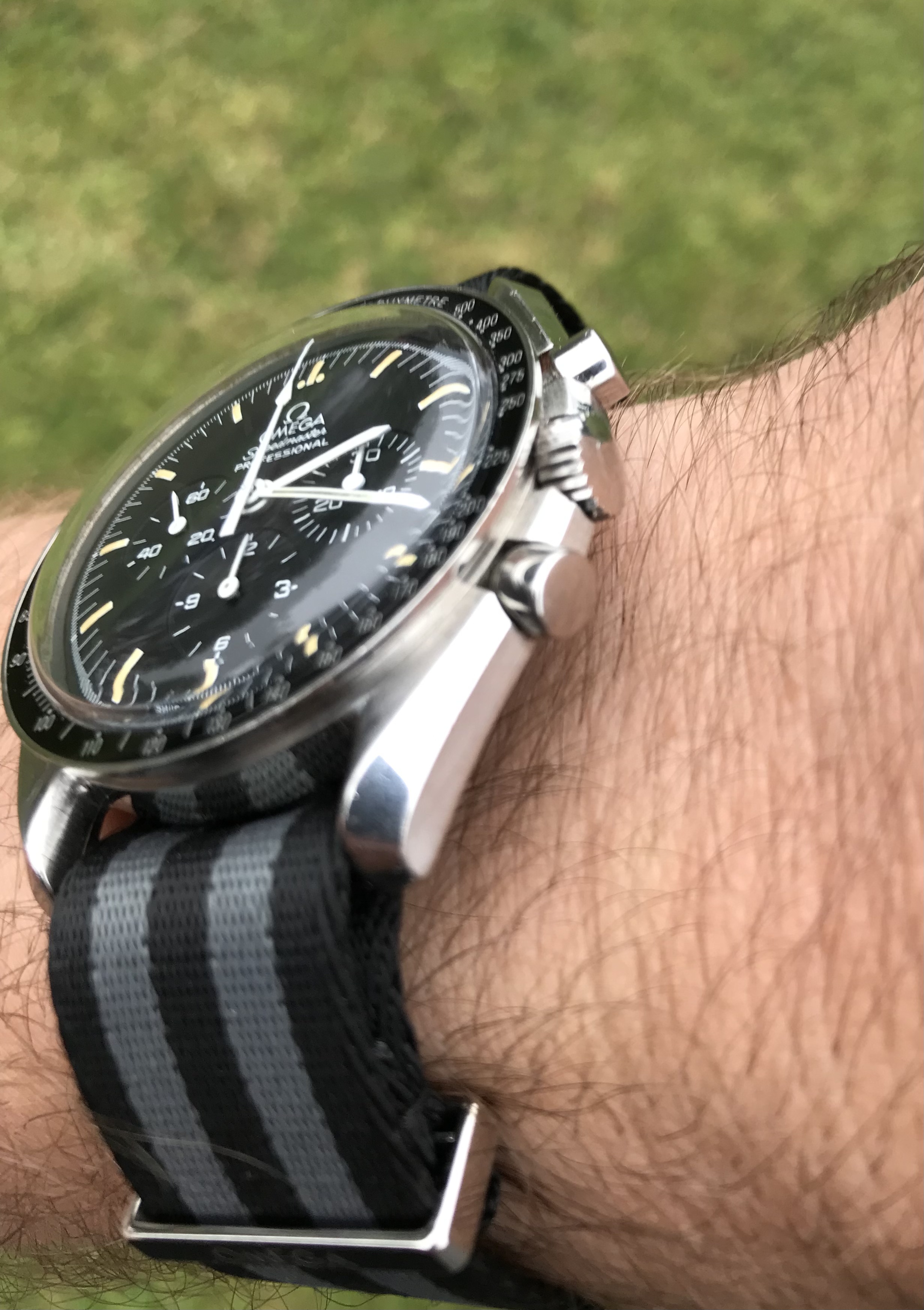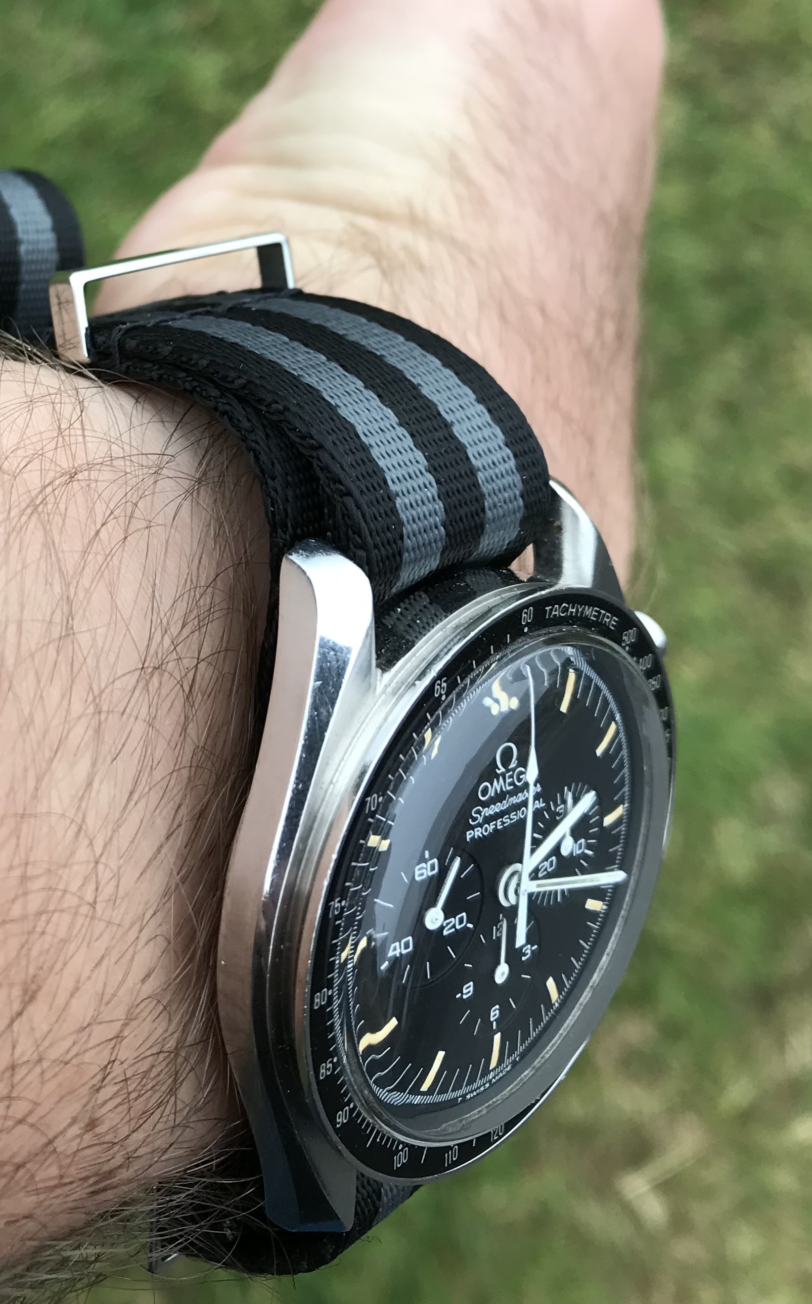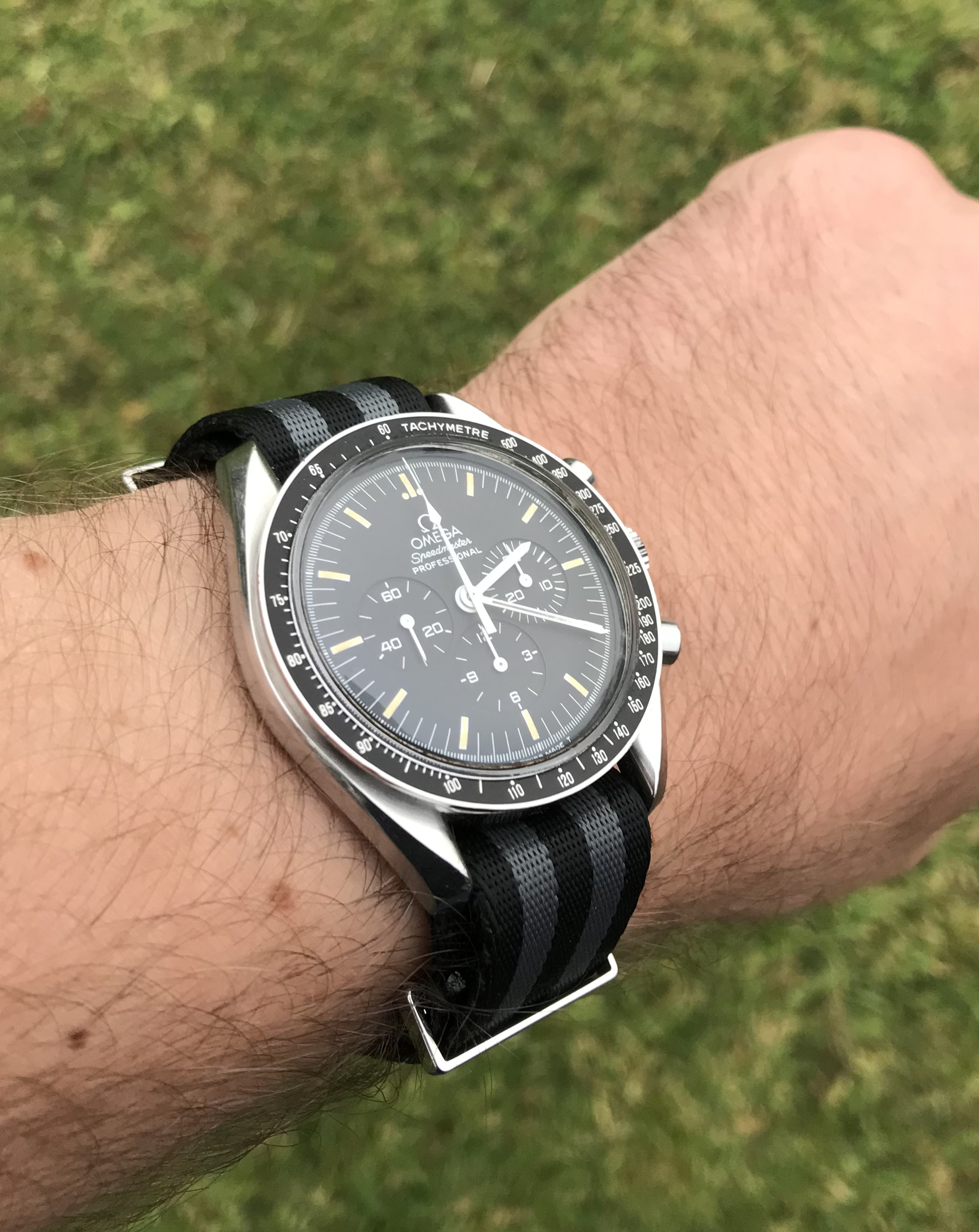 I’m offering an early 1990s Omega Speedmaster on an Omega NATO strap with all accessories, including International Warranty Card, inner and outer boxes and the sought after early 90’s manual.