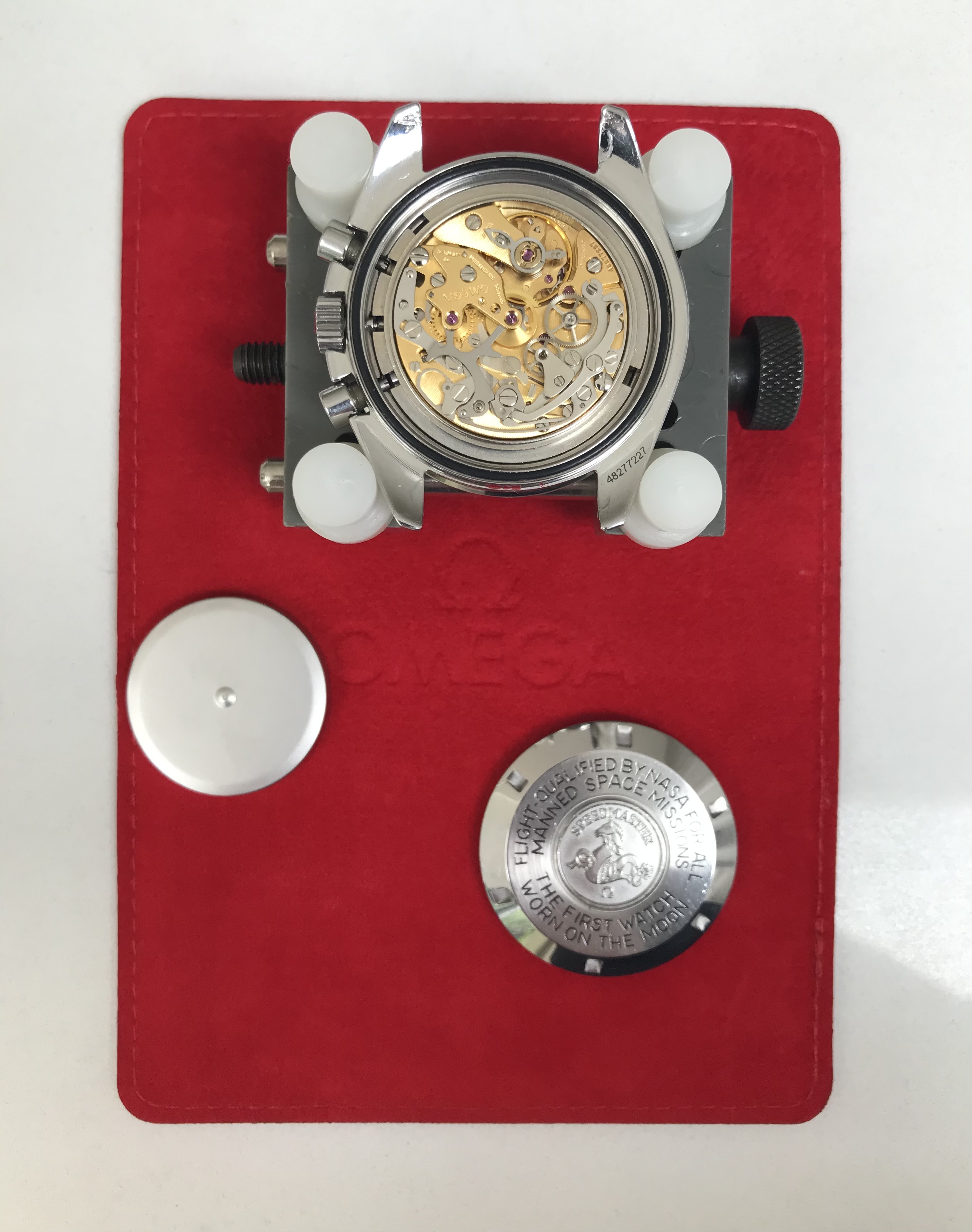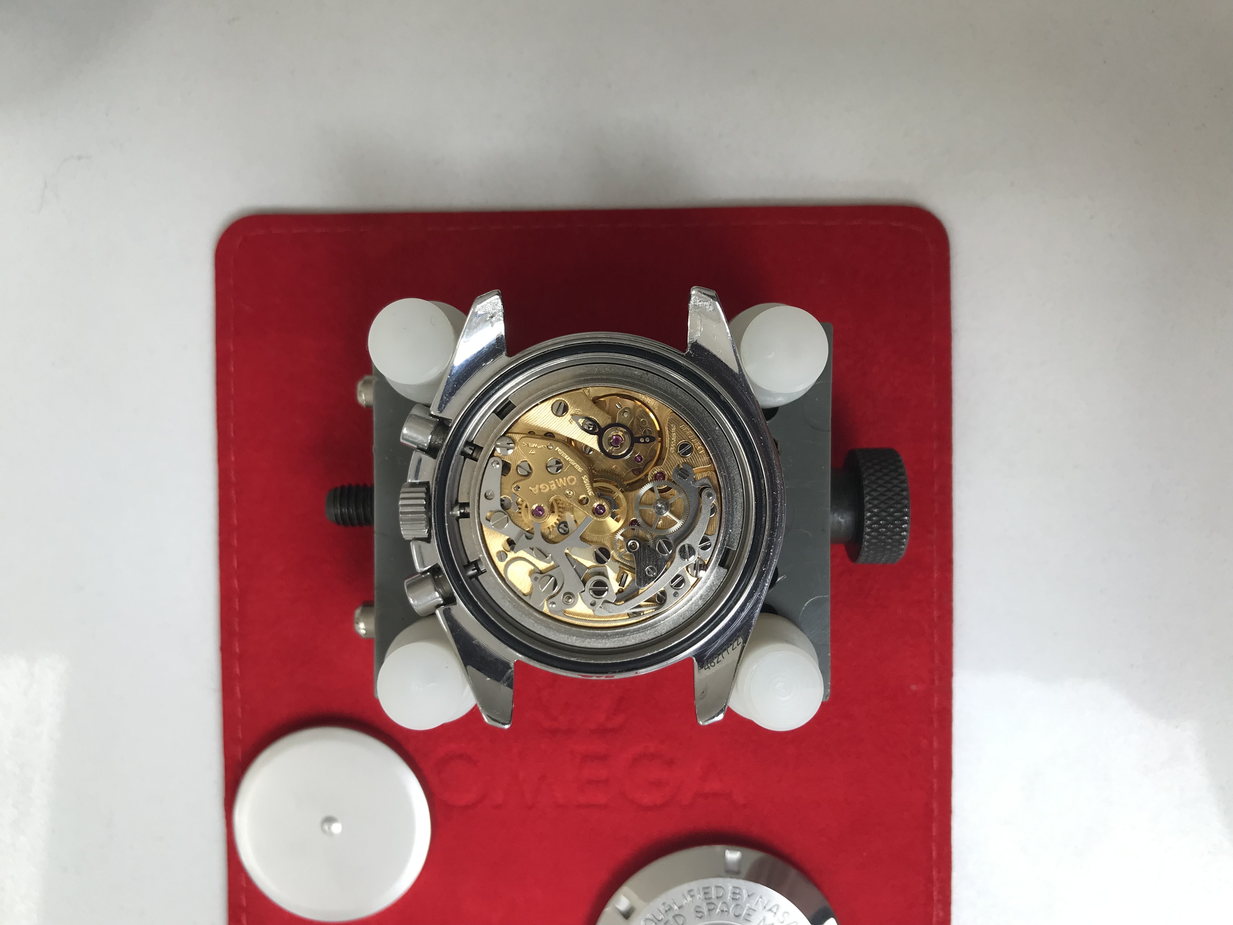 Manual (caliber 861) movement running strongly and keeping excellent time (within circa 10-12 seconds per 24 hours)/ power reserve exceeds two days. Movement number is 48277227. Regretfully, the case back is too tight for me to open without risk of marking the case.