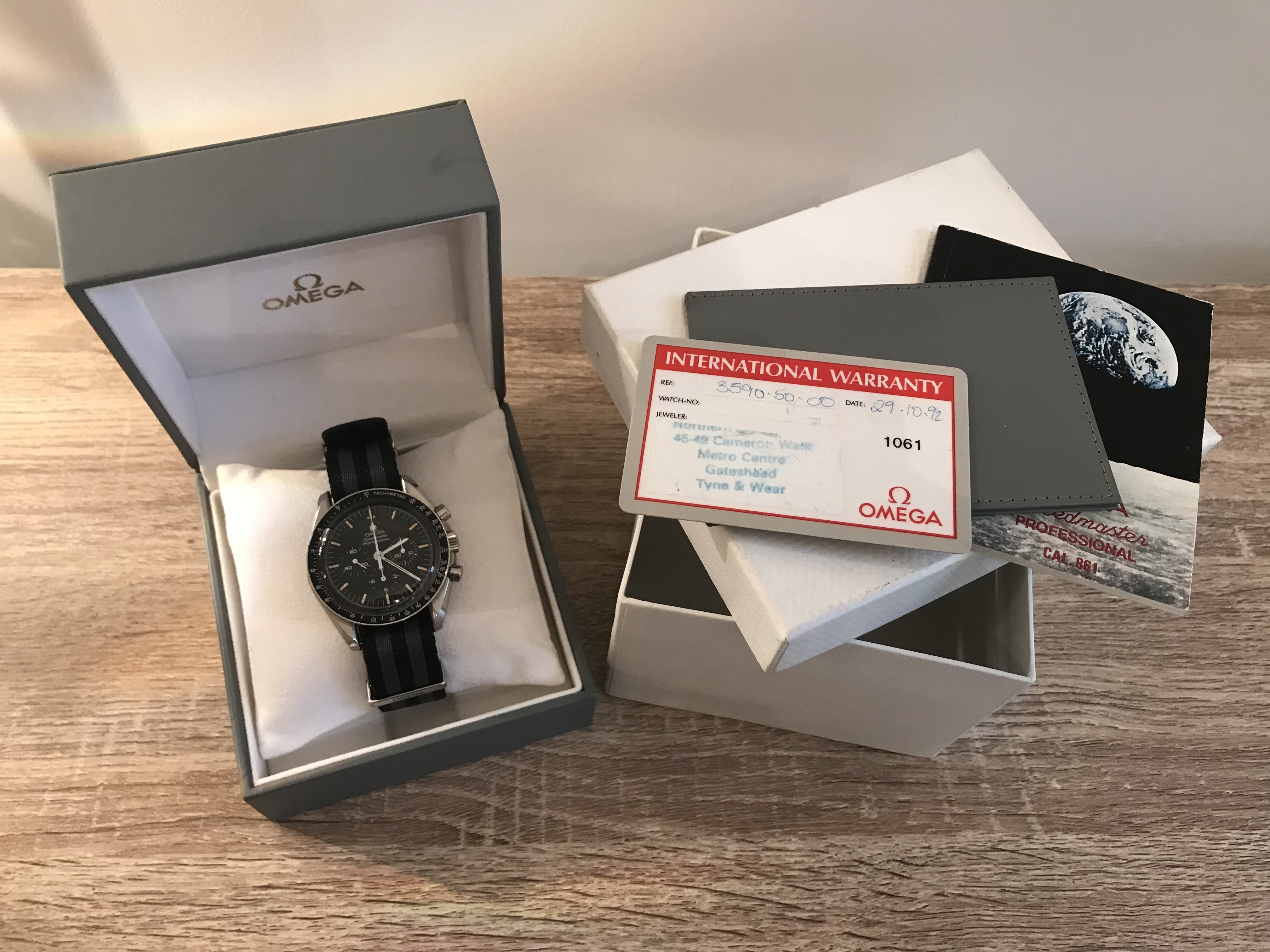 Warranty Card dated 29 Oct 1992 (sold in the UK), rare Speedmaster booklet/ manual and original inner and outer boxes in really nice condition.