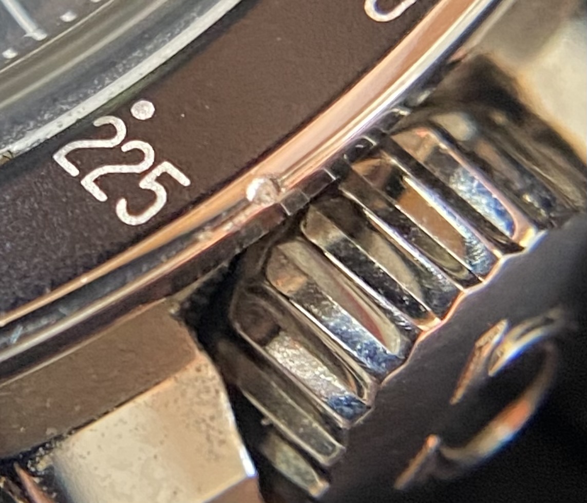I have been gentle with this watch, just one very small ding on the edge of the bezel by the crown which I have highlighted in one of the photos. Really small, just a nick but it is there. I am sure there is a light mark or two somewhere else but I dont see them, really nice and clean to my eyes.