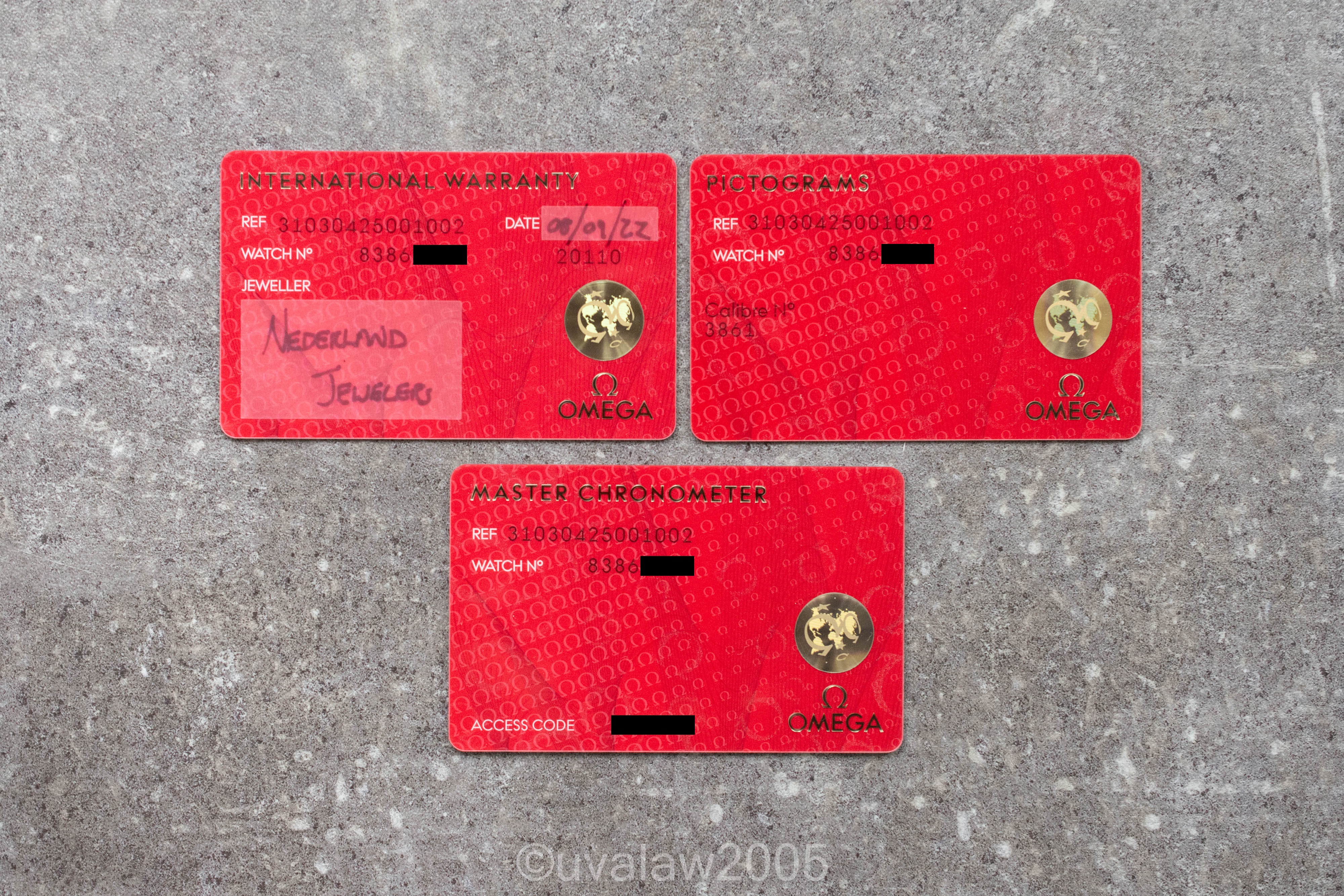 Complete kit with inner/outer box, hang tag, manual, pictogram card, master chronometer card, and stamped AD warranty card dated August 2022. Five-year Omega warranty runs through August 2027.