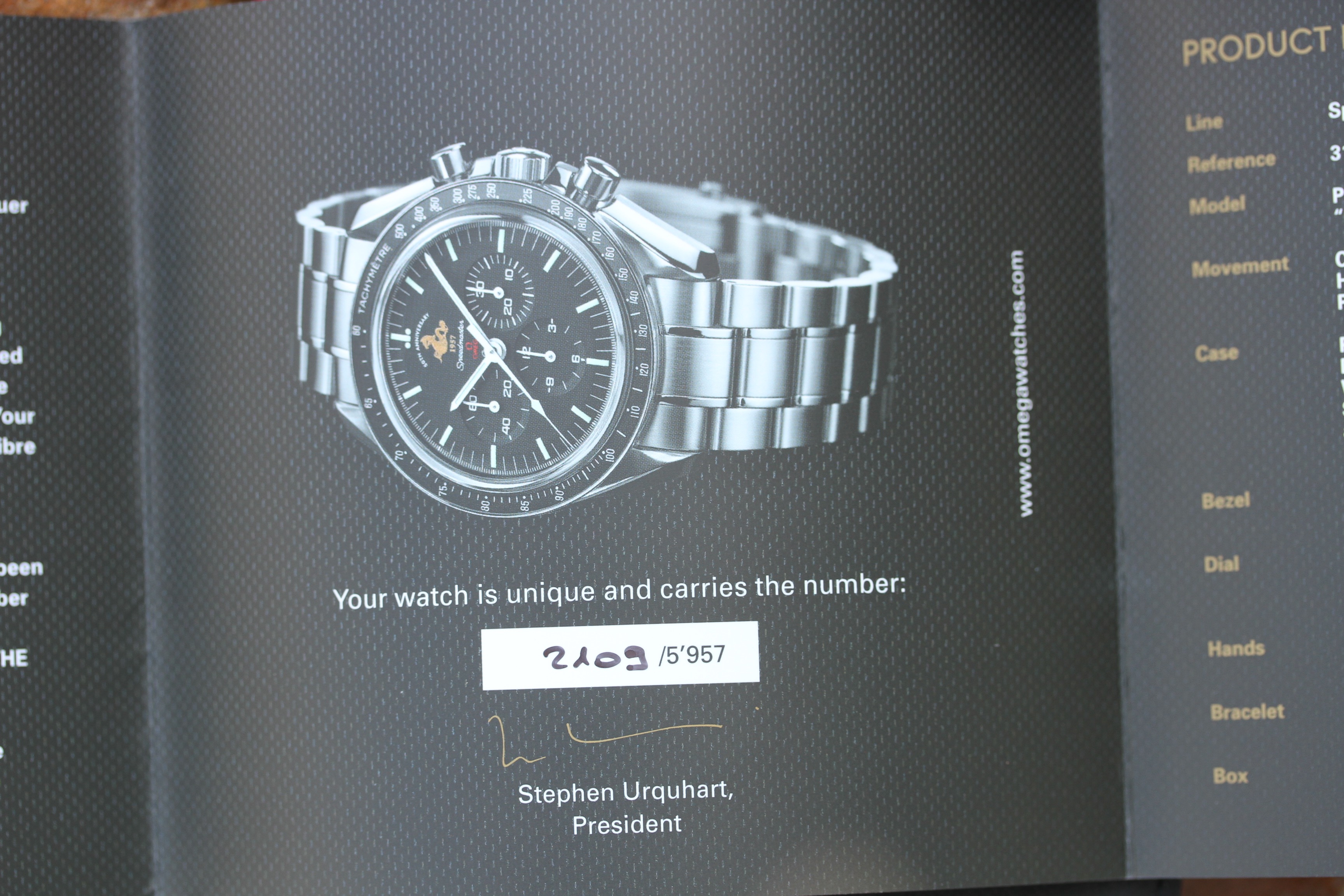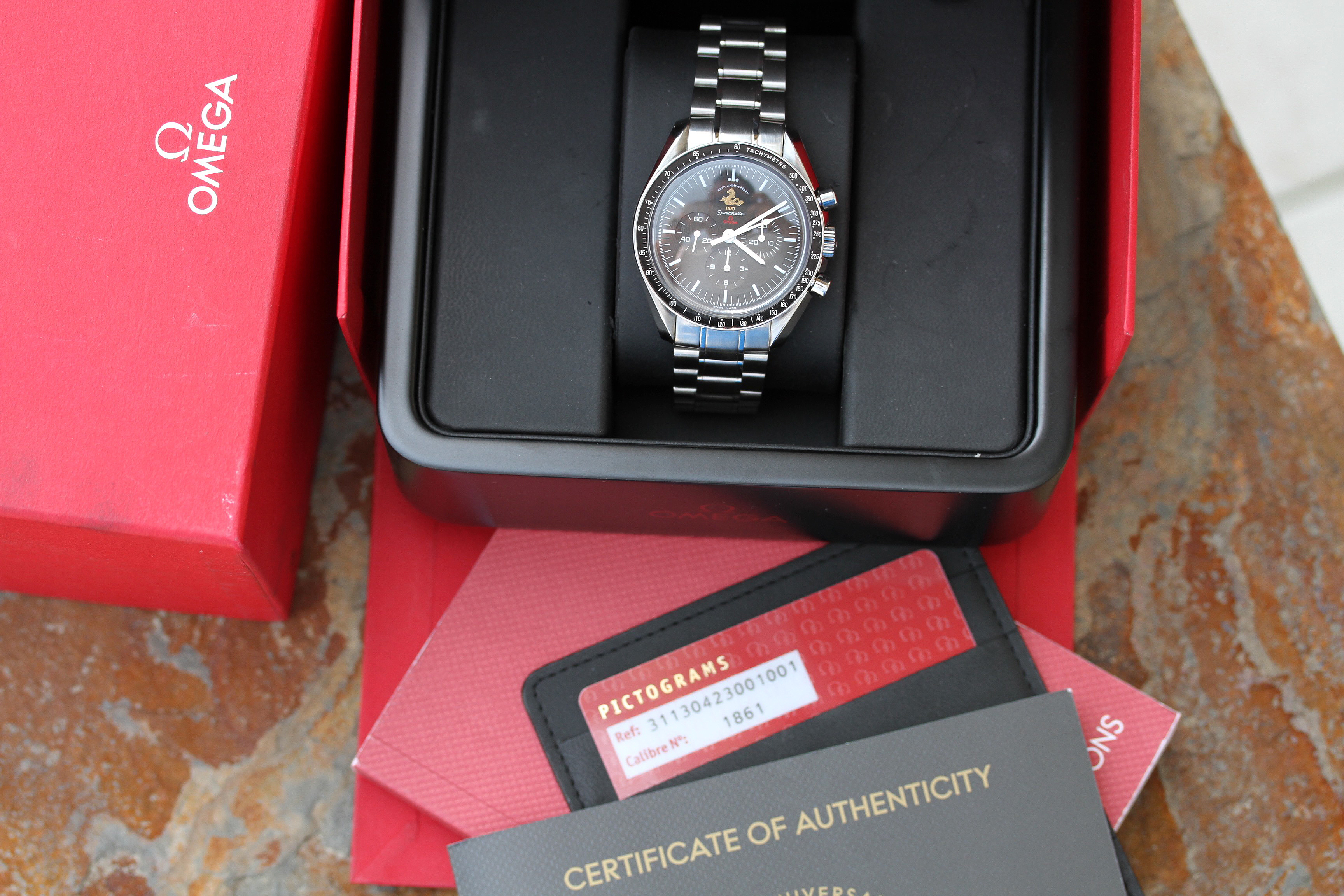 Comes with Omega special boxes, manual, cardholder, Pictograms card, C.O.A. with matching number to the watch.