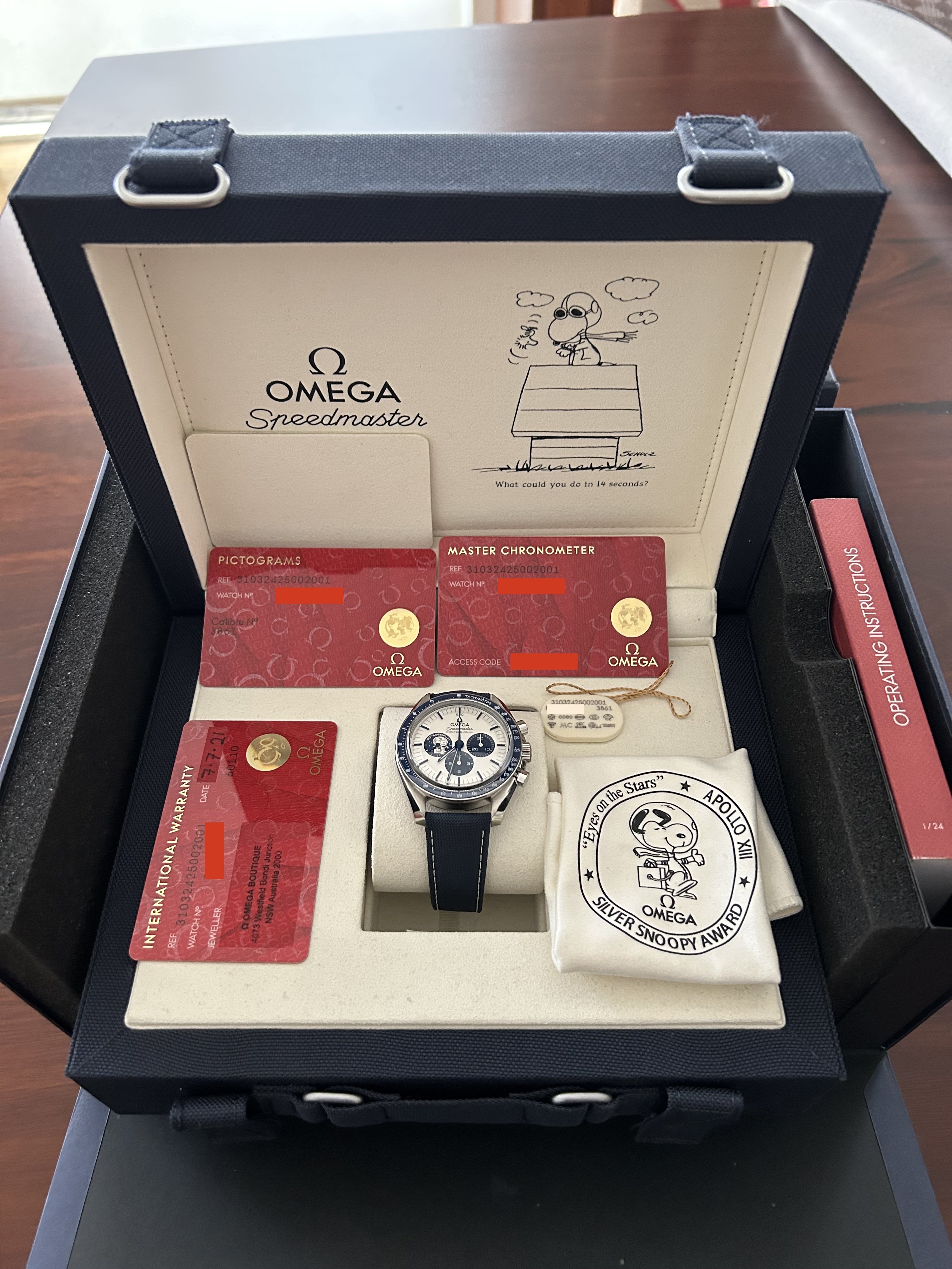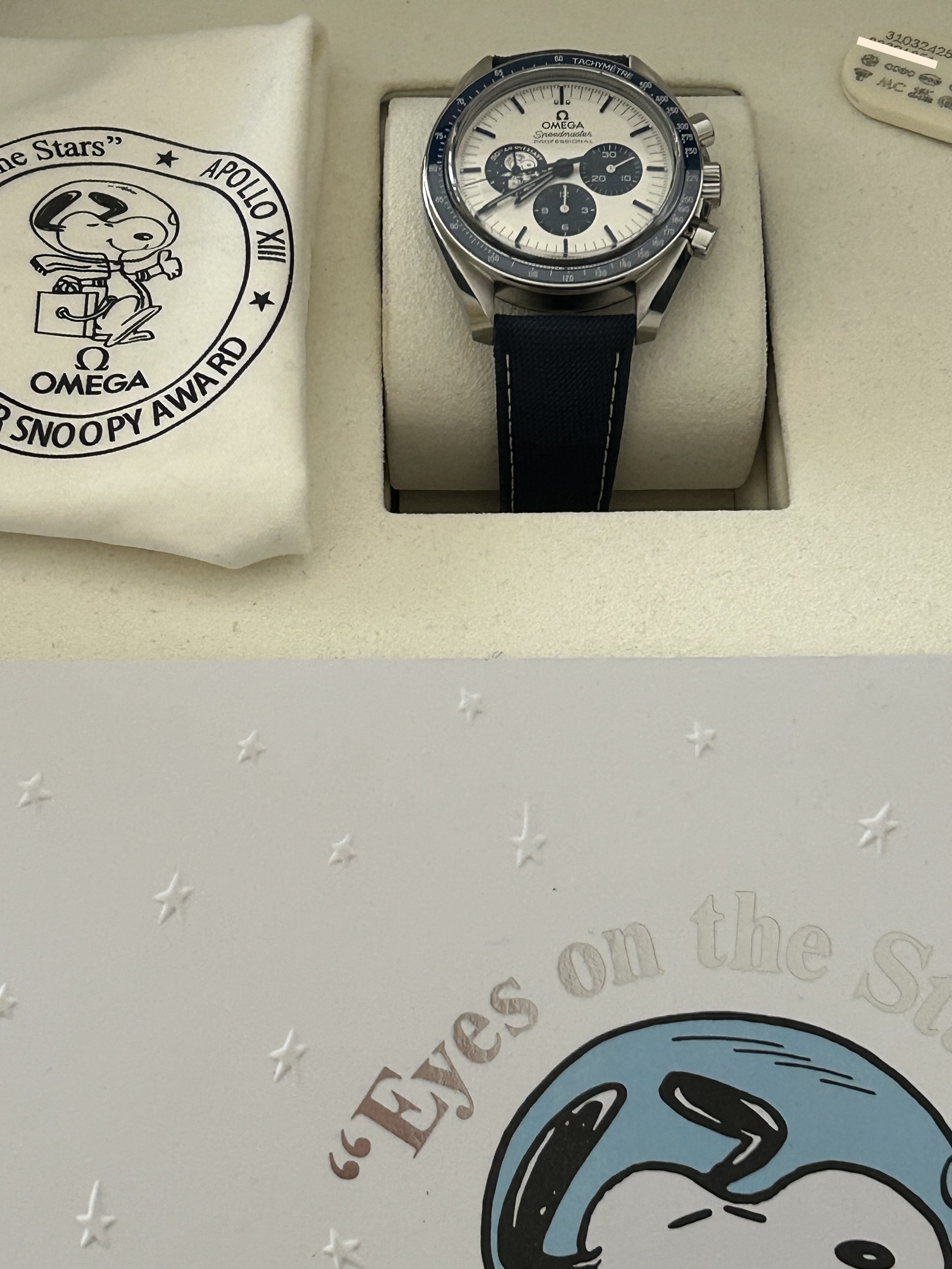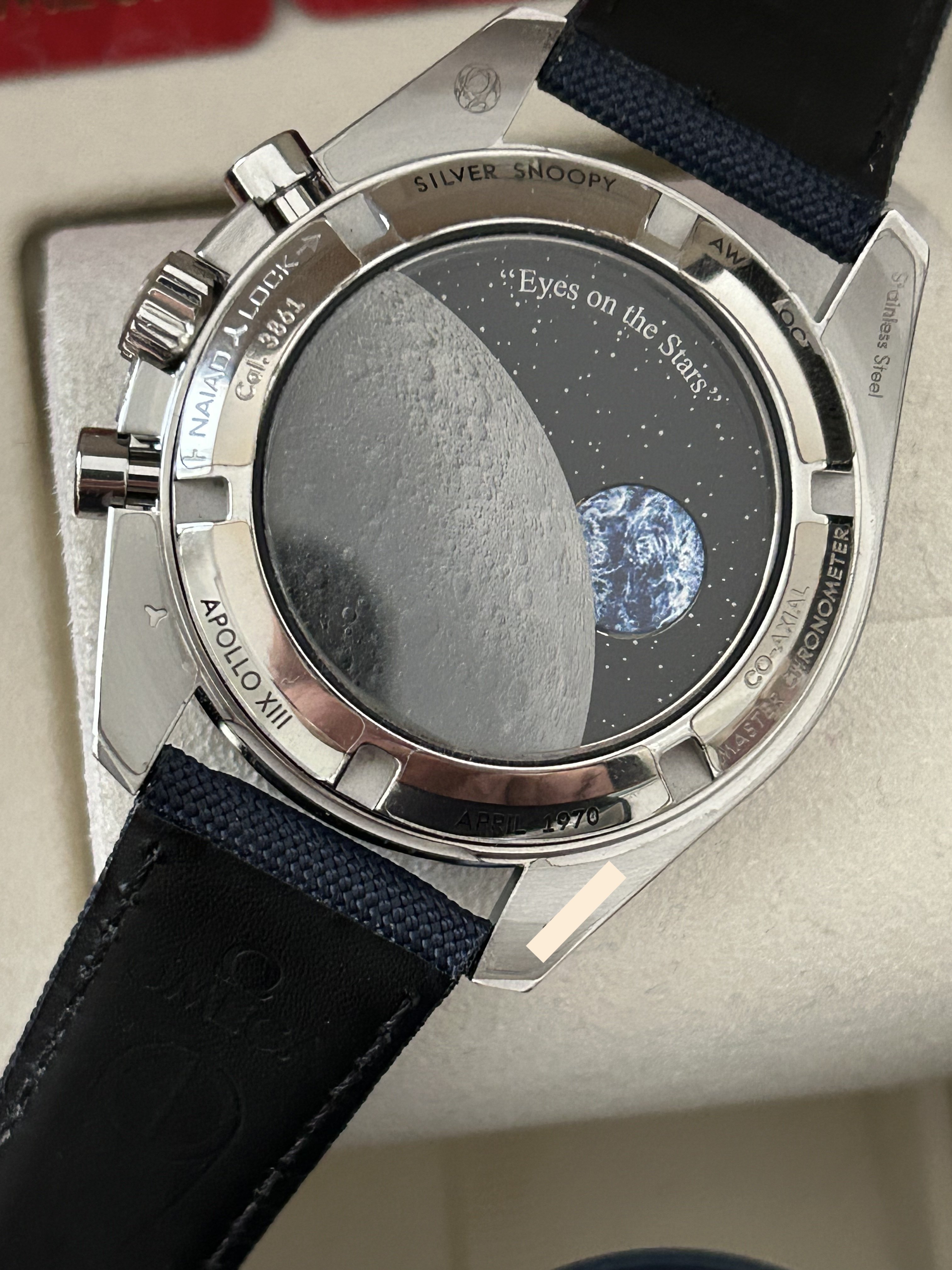 The caseback has a black engraved tribute to Apollo 13 and OMEGA's Snoopy Award.