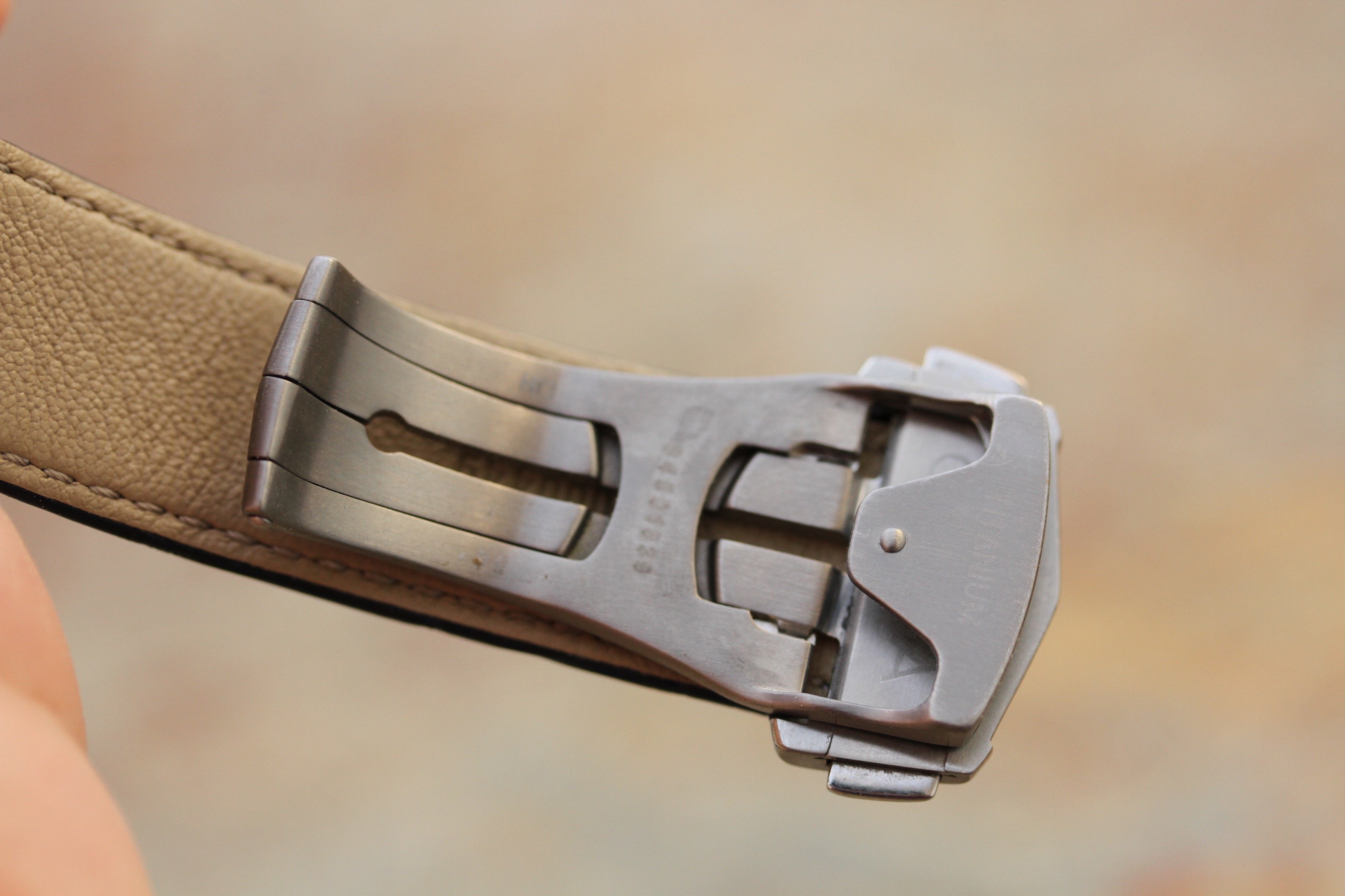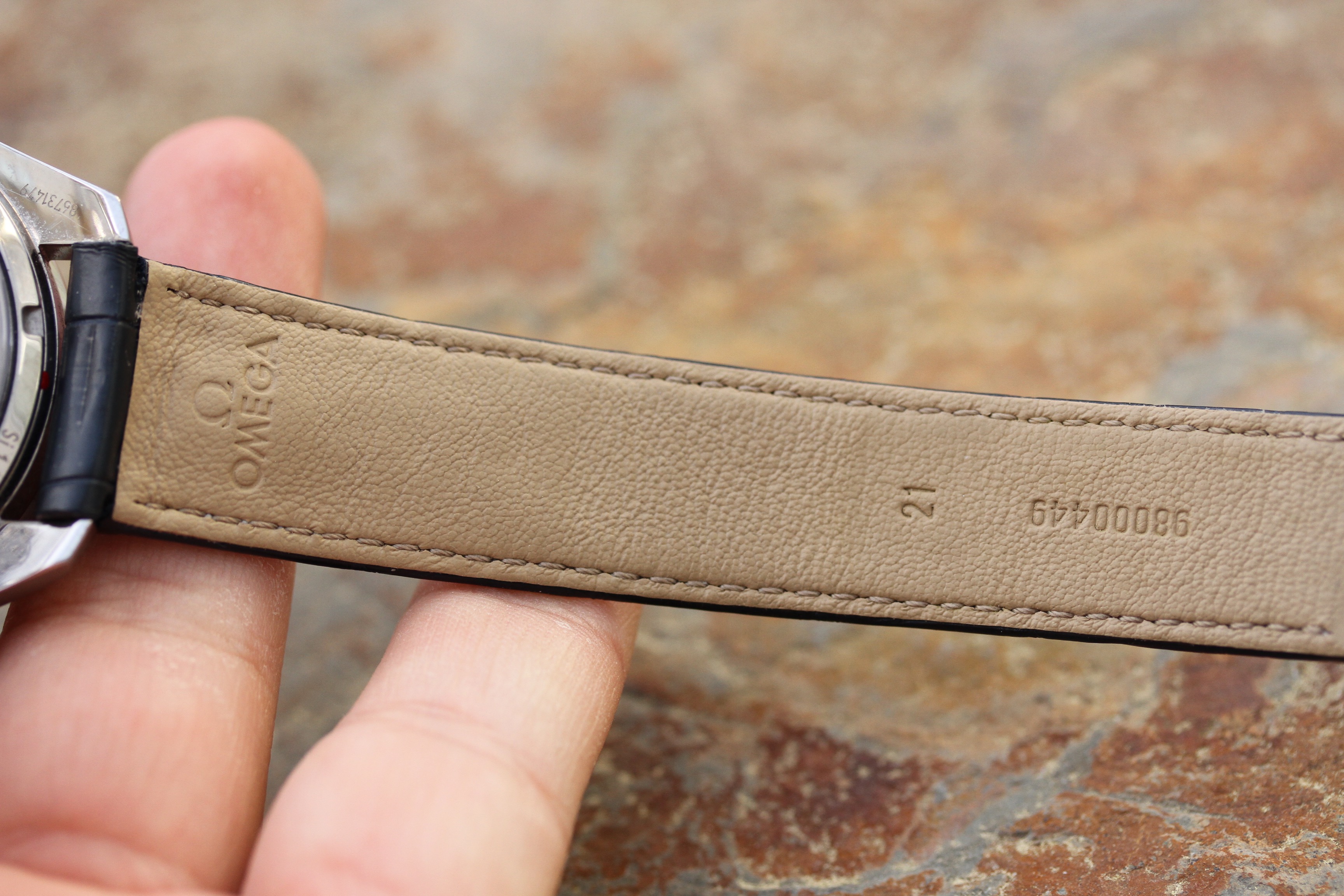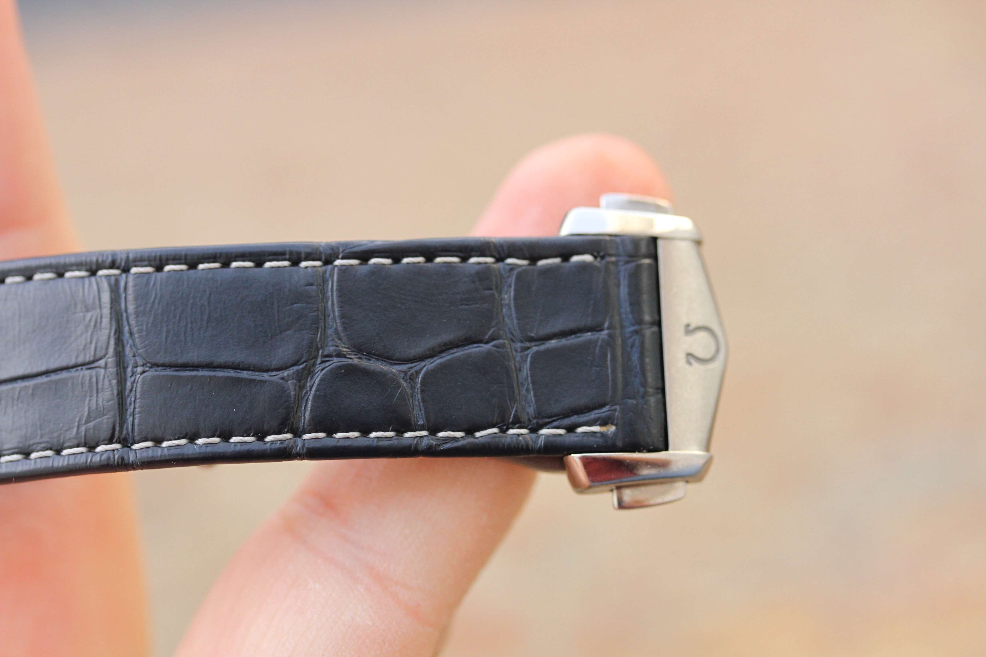 Original blue Alligator strap is OEM, show minor signs of wear, and comes on original OEM Omega titanium deployant buckle.