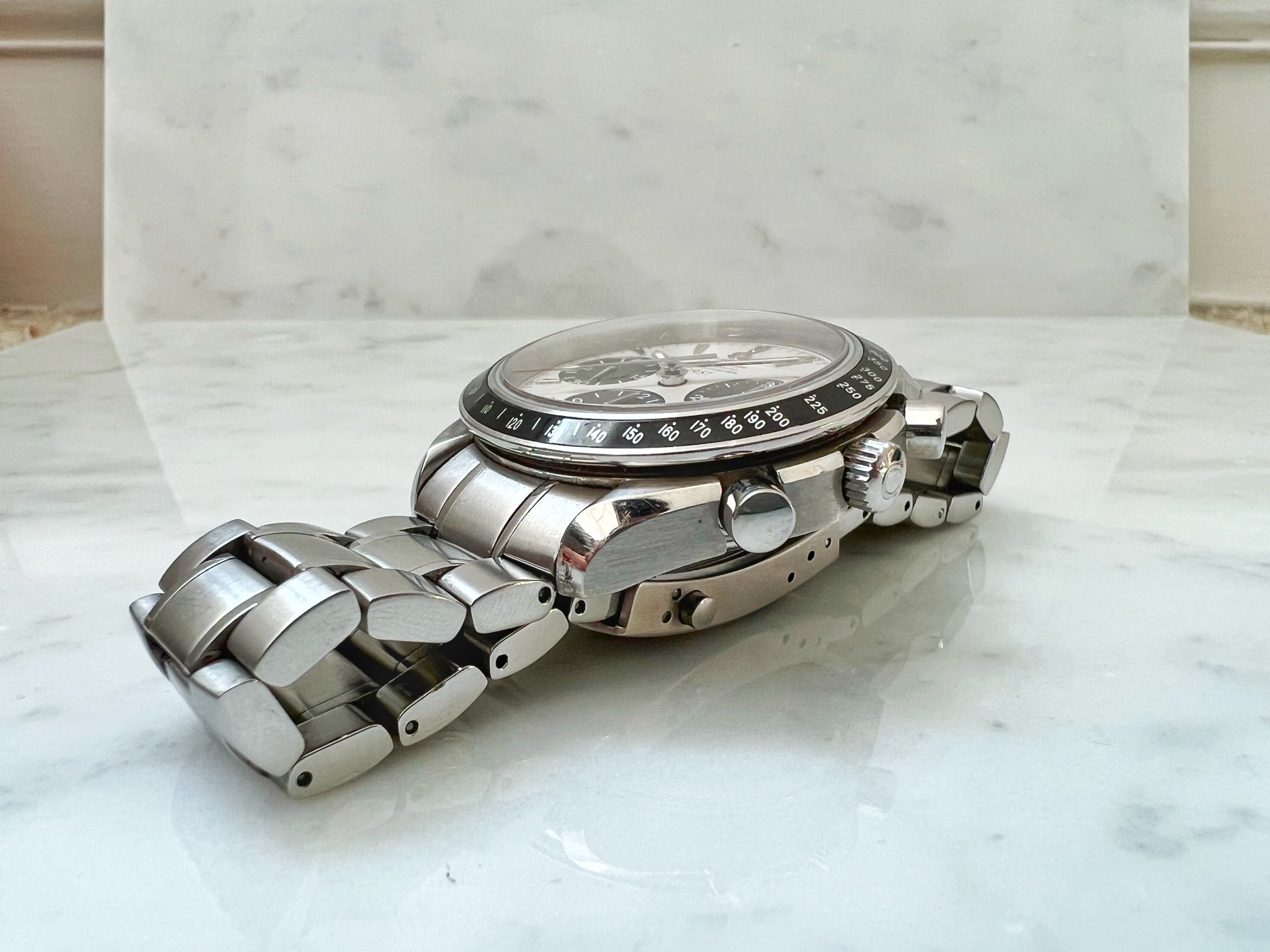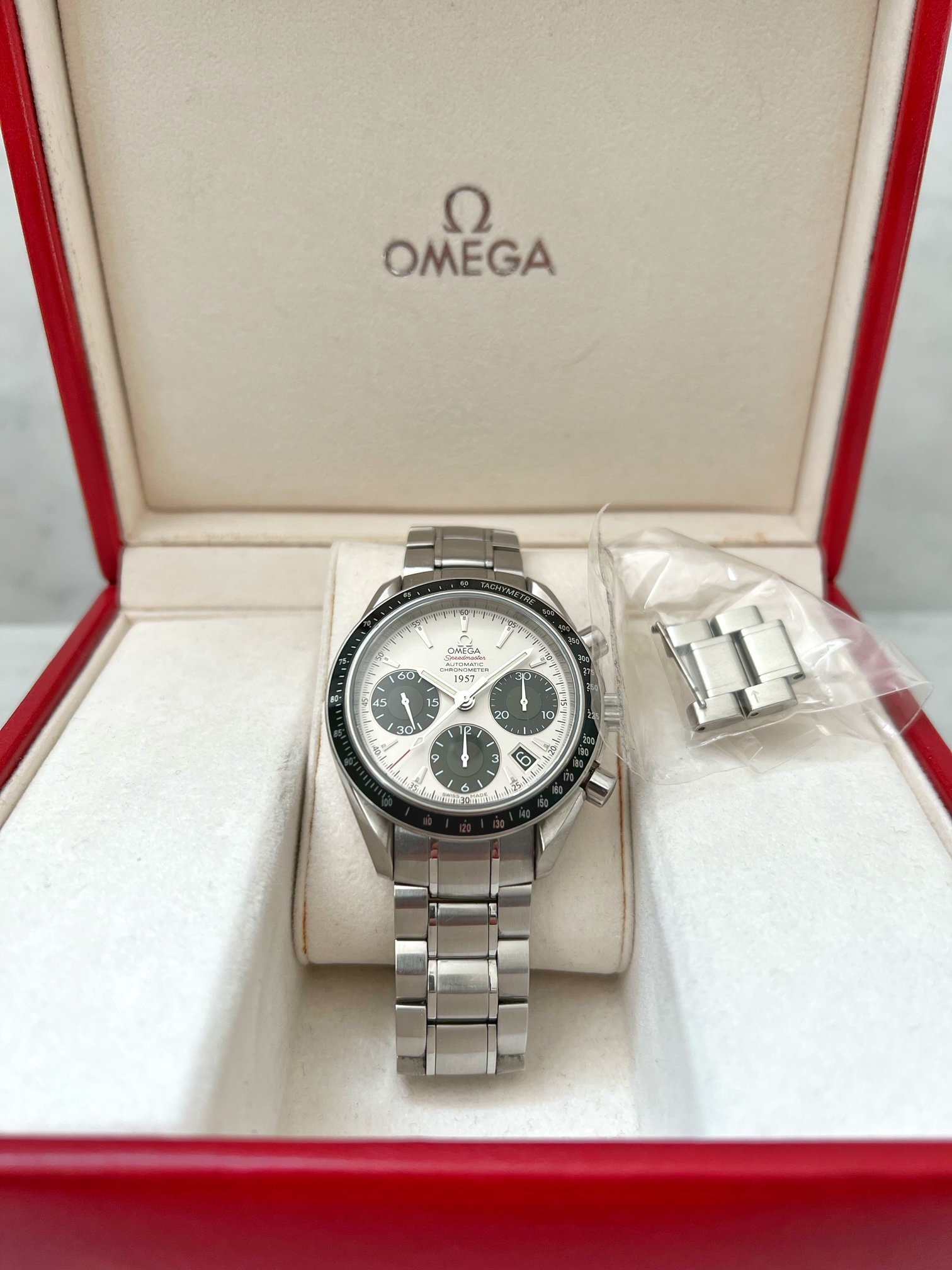 ·Up for sale is my 40 MM Caliber 3304 automatic date, reference 323.30.40.40.02.001. Similar to the Marui Speedmaster, this is a true panda. I like to refer to this as my "Poor Man's 6263." Watch is keeping excellent time. Chrono and date functions work perfectly. Watch is in very good condition, with some minor scratches and swirls commensurate with its age. This comes with box and cards.