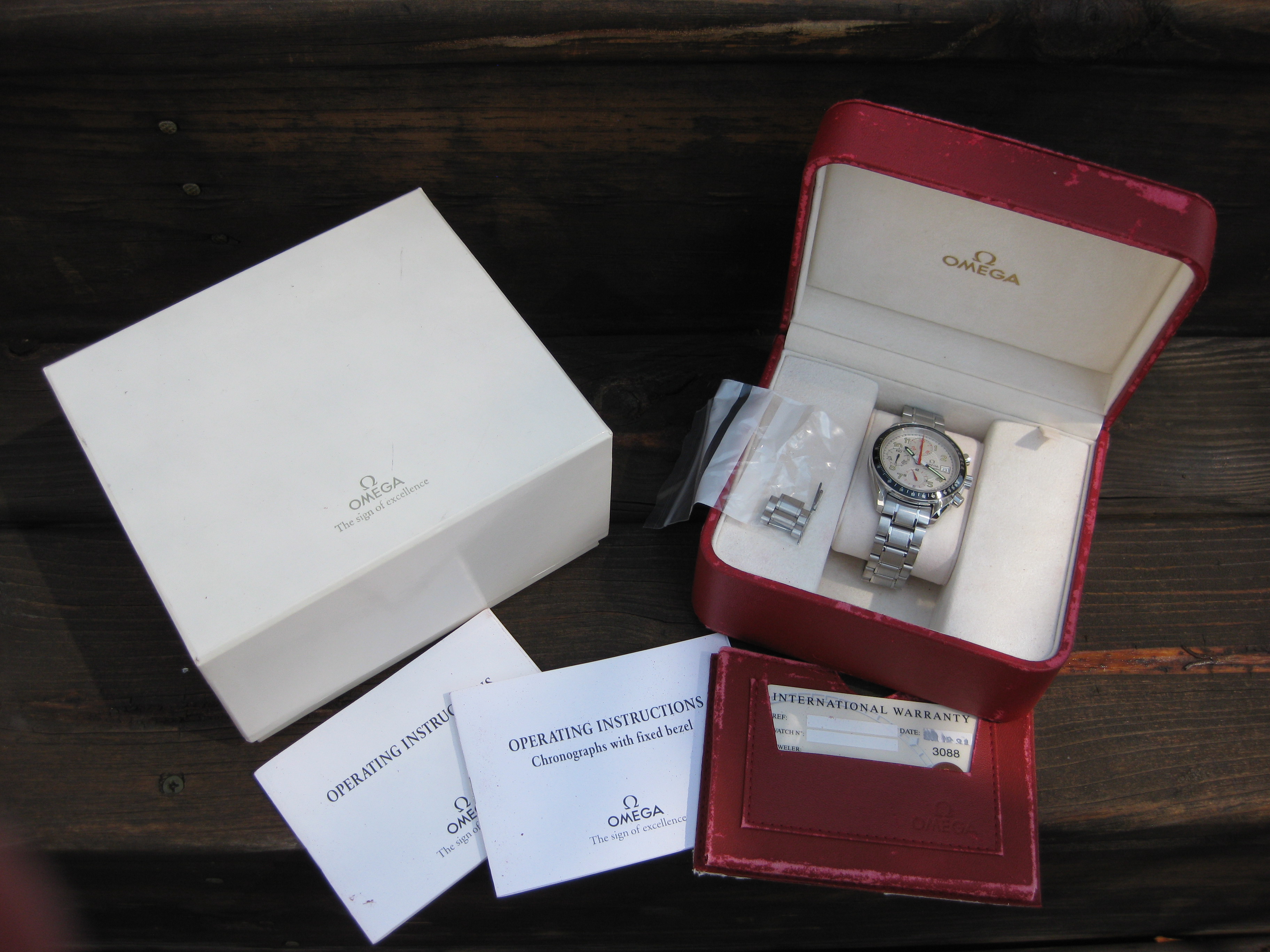 ·I have a absolutely stunning Omega Speedmaster Automatic MK40, silver dial, complete set for sale. Watch sets, winds and runs super smooth. Comes with a complete bracelet, 2 links removed but are included. Outer/inner Omega boxes, Omega wallet,(inner red box and wallet have typical weathering and cracking), All Omega instruction booklets, and a Expired dated and stamped Omega warranty card. Overall condition is near mint, I see no marks anywhere. Just a beautiful example of a MK40.