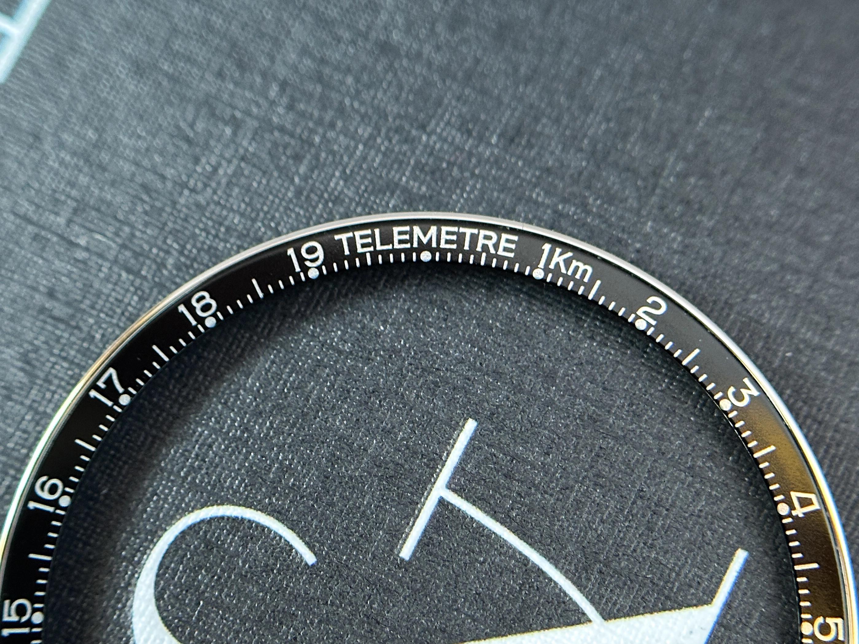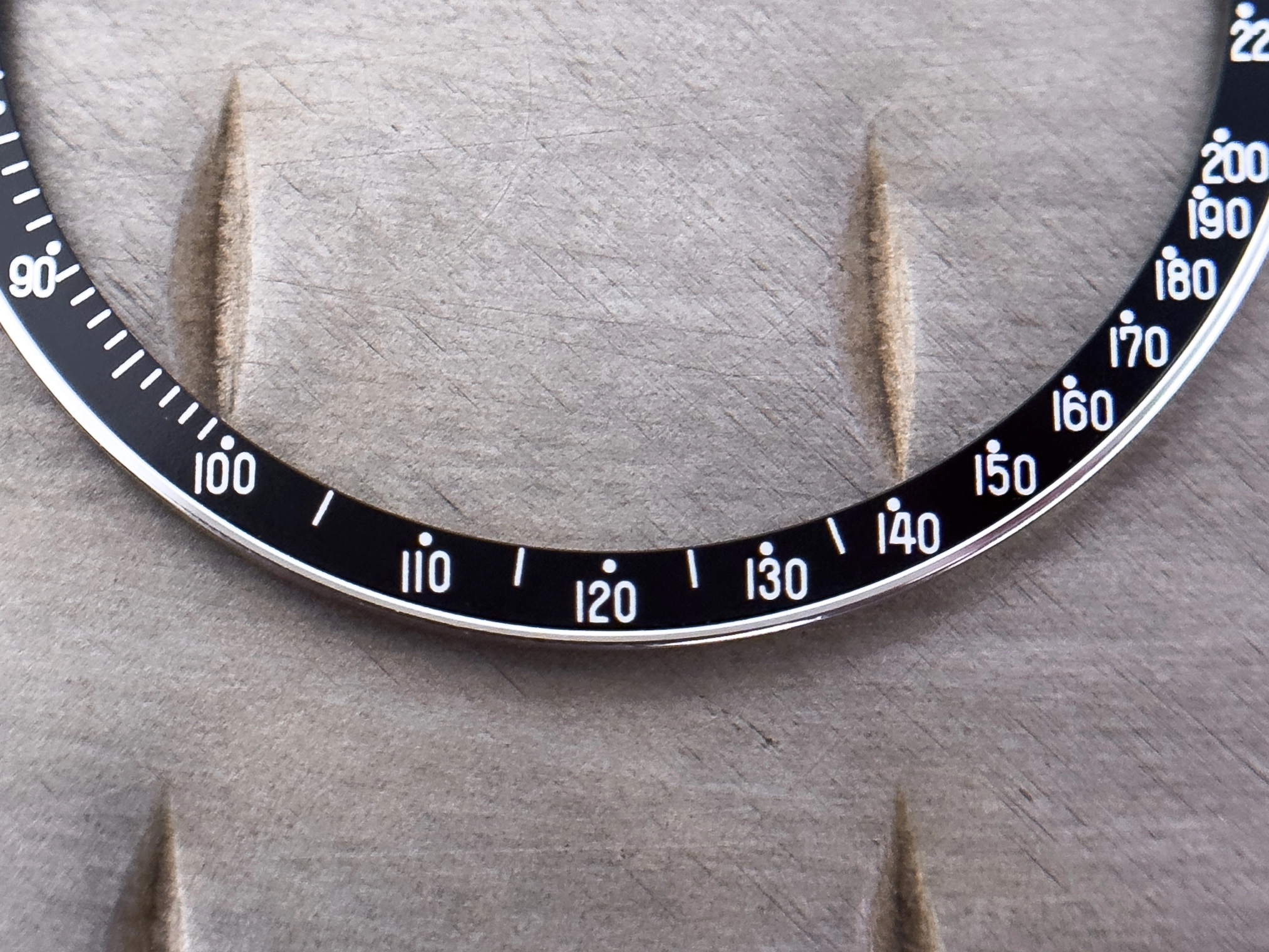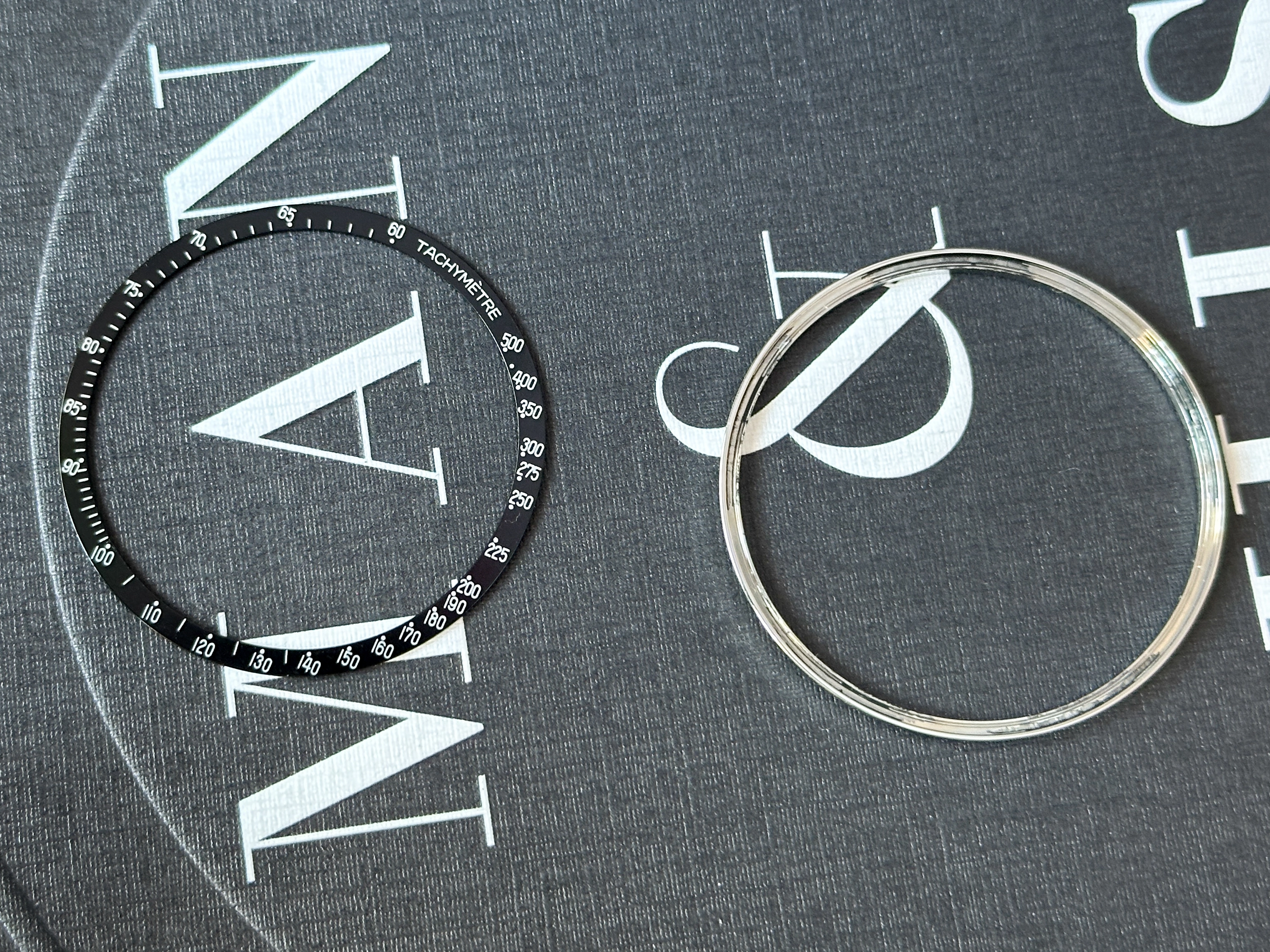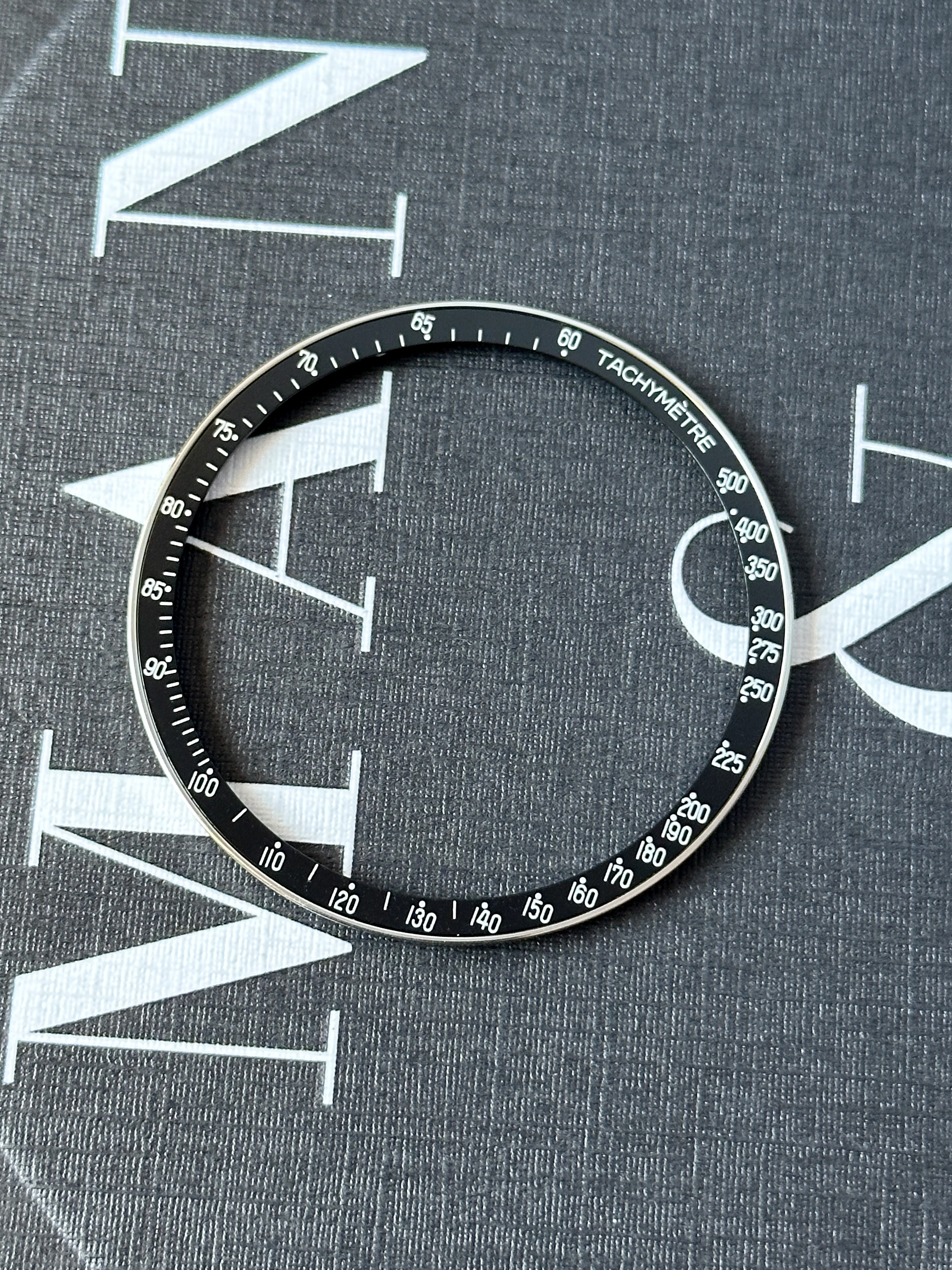 This bezel came off my brand new 3861 Speedmaster a few days into ownership and has since been stored away for a future project. The condition remains like new. If you see anything on the bezel in the photographs, it is dust. While the polished ring is only compatible to the 3861 case using a spacer, the bezel itself shares the same dimensions as earlier Speedmaster Pro bezels and can be seated in the rings to fit earlier Speedometer Pro cases. Great for a mod or project without using an aftermarket part. This bezel does not come with any Omega packaging as it came directly off my watch.