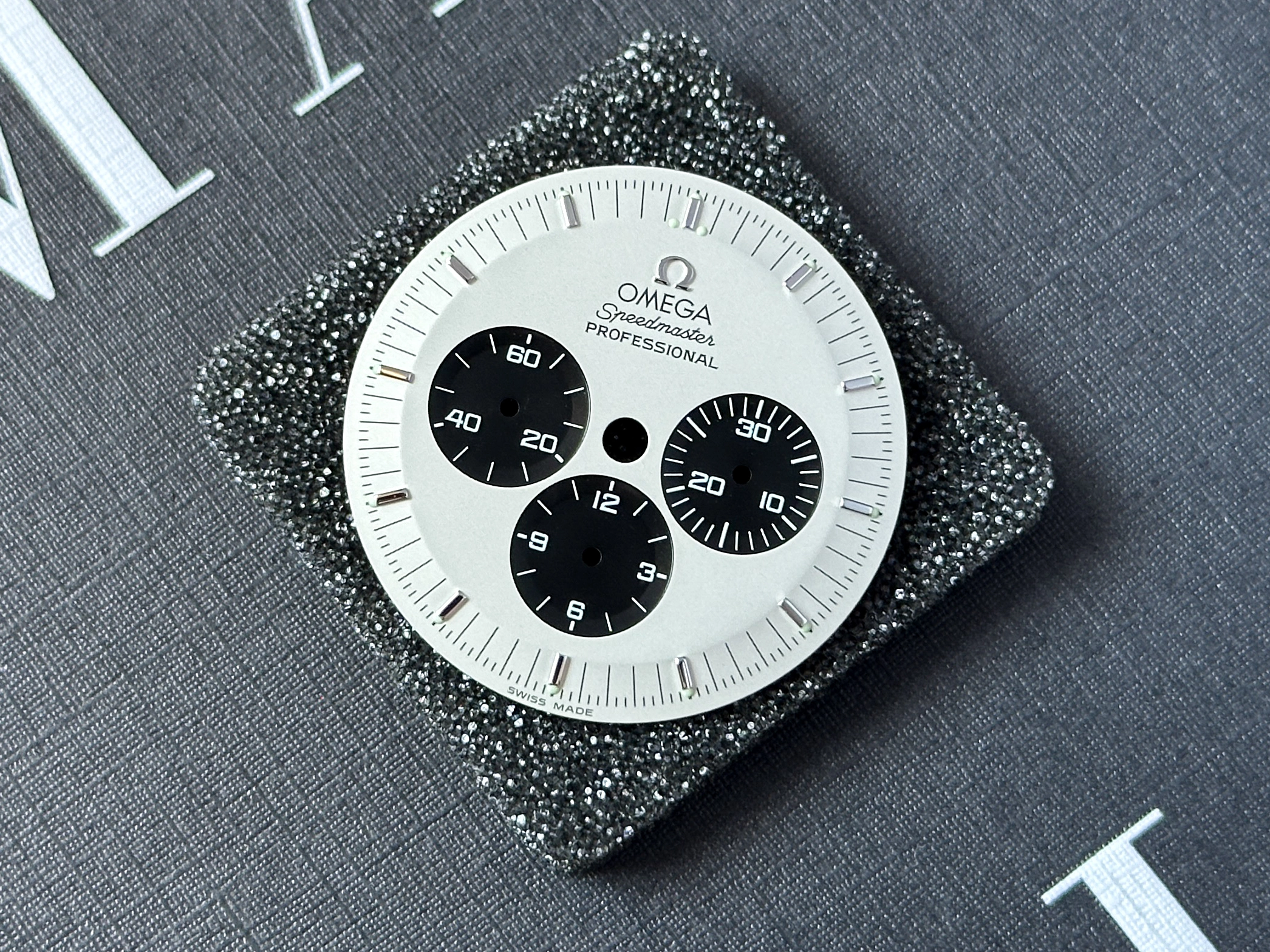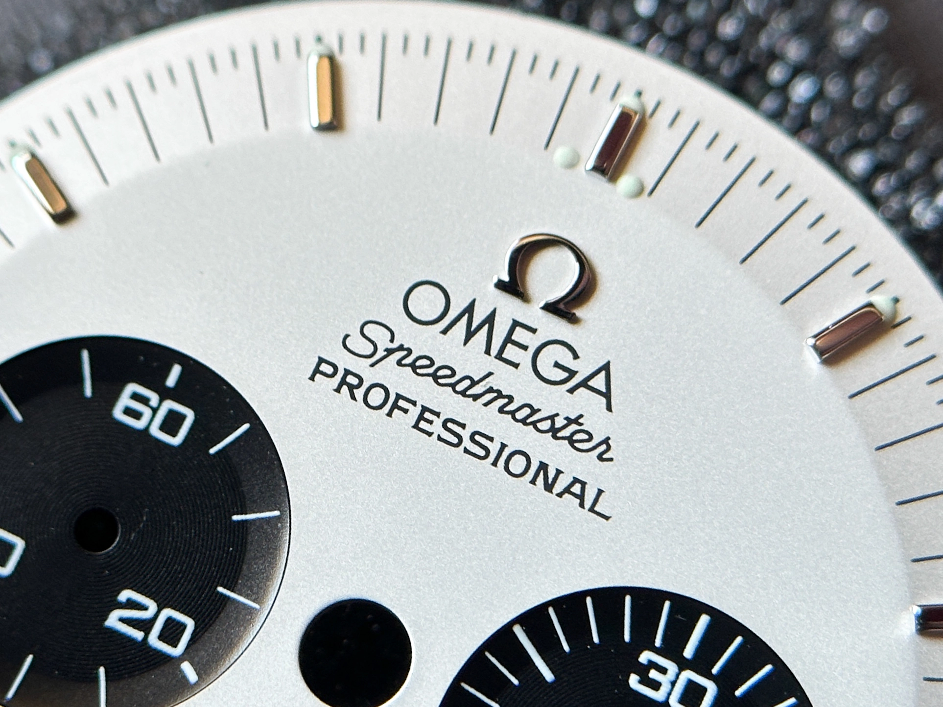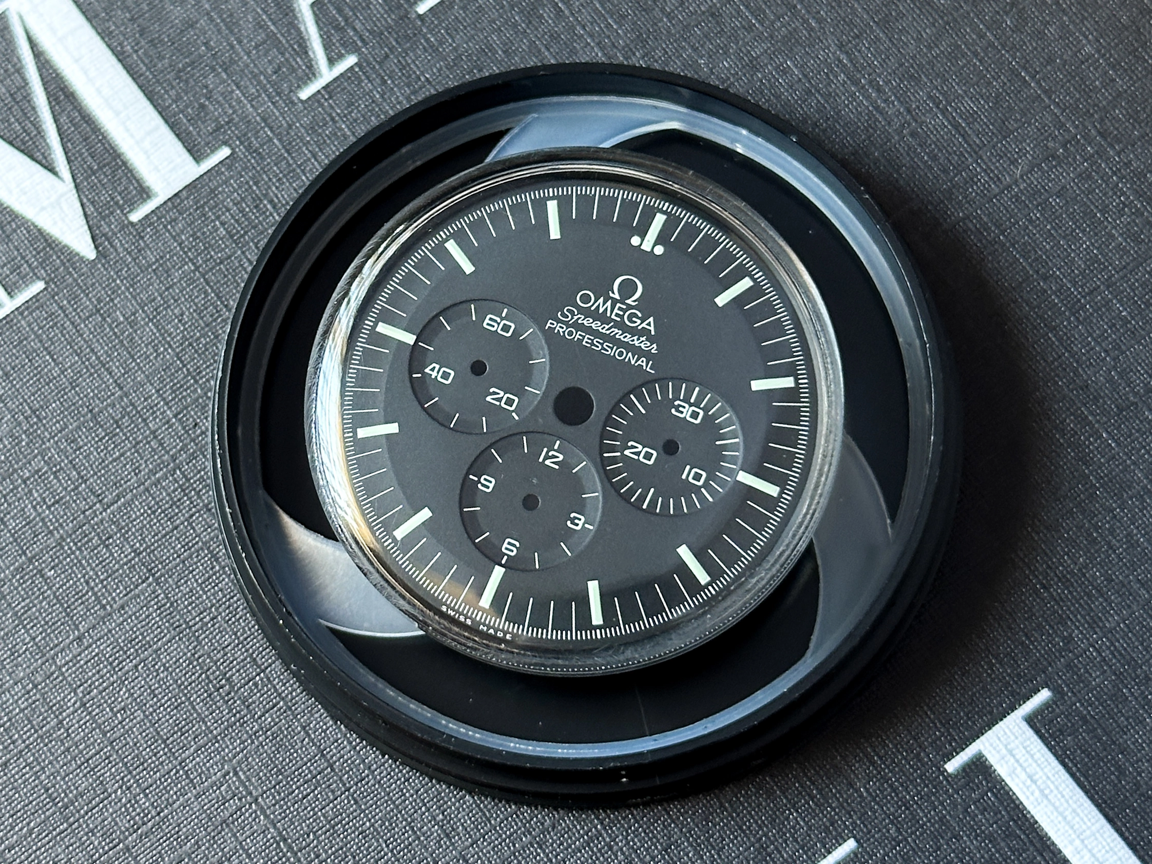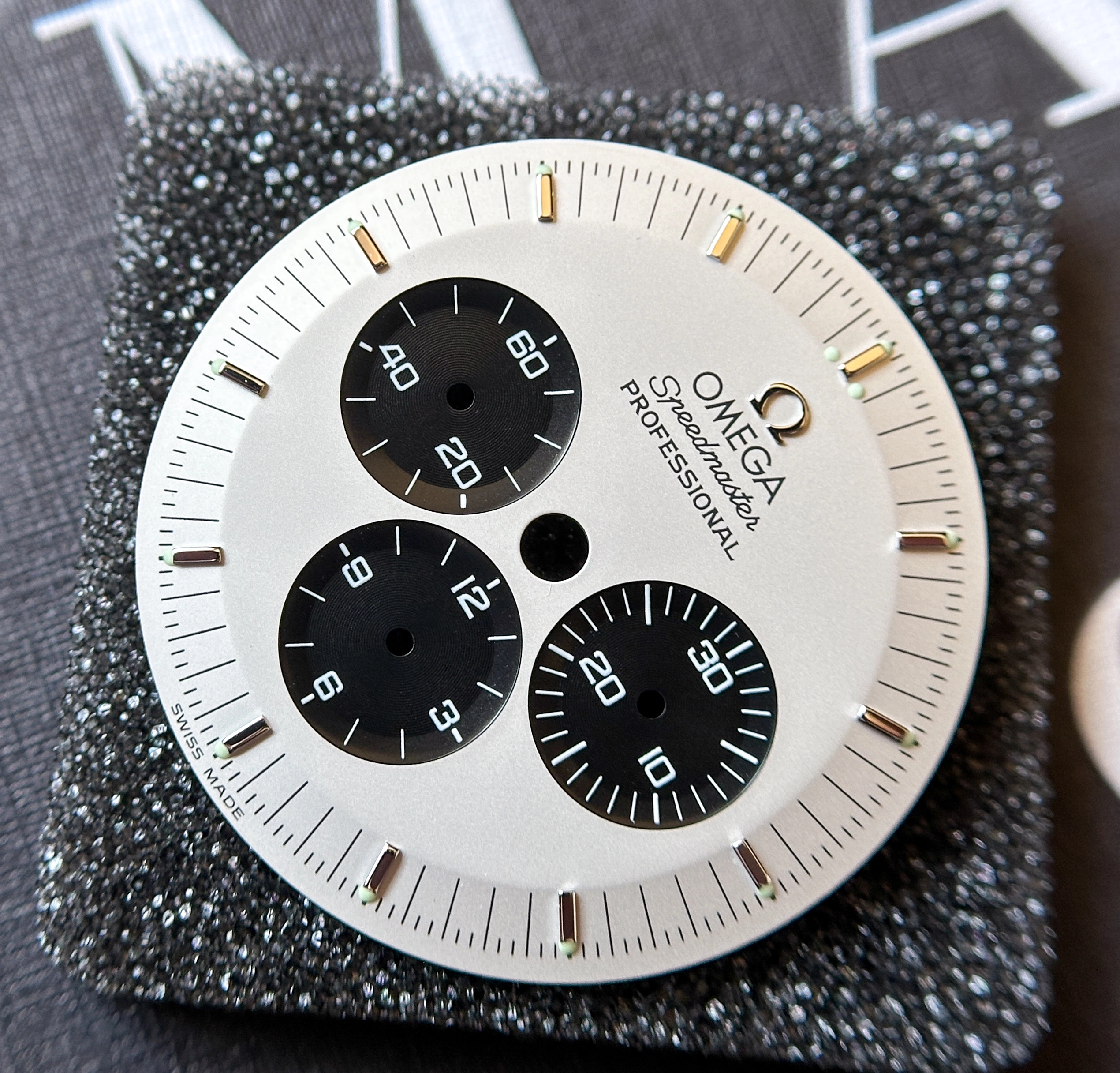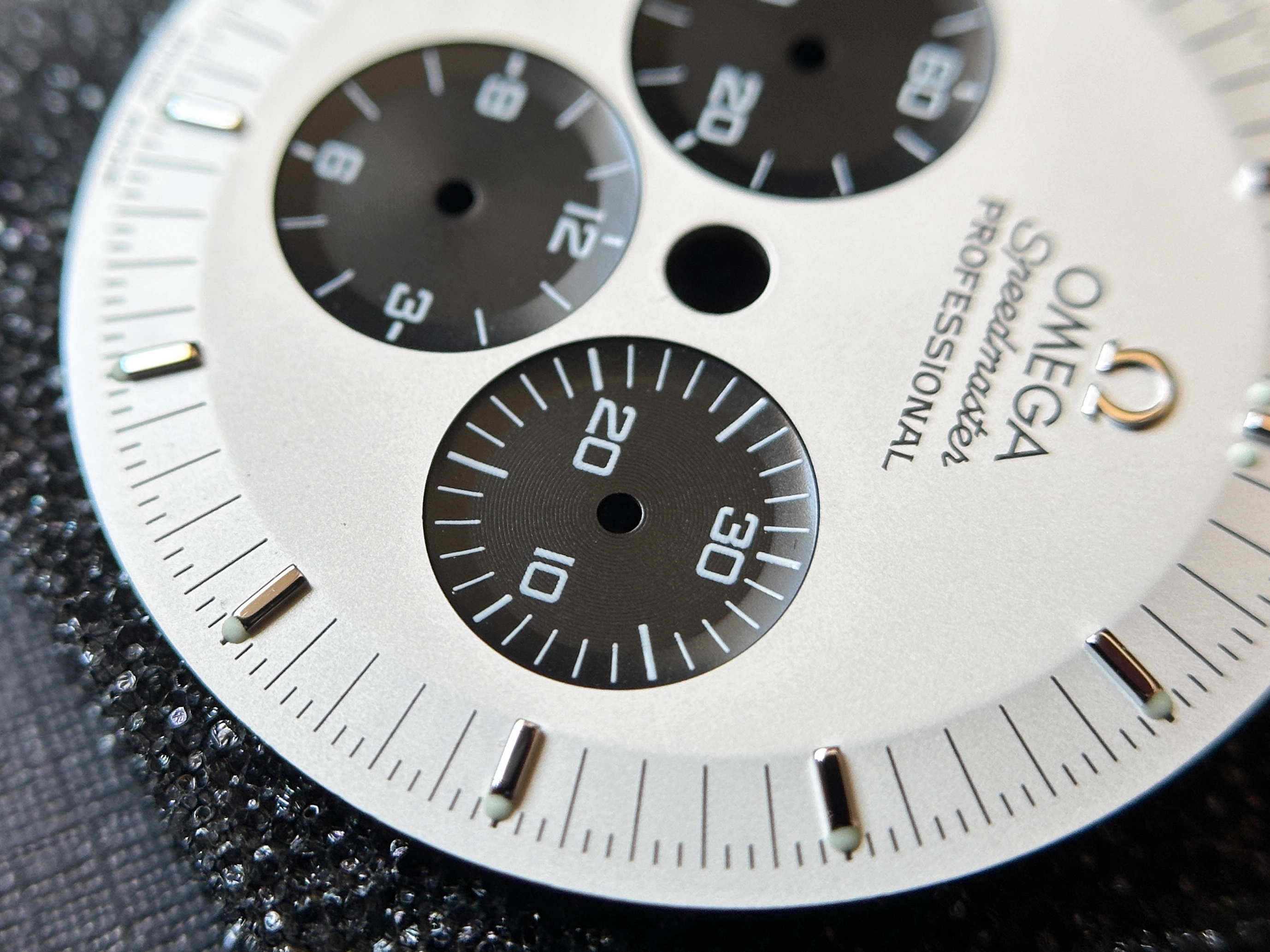 Just like the caseback above, this dial came off my 1861 Speedmaster when I modded it using a TinTin dial. The person performing the mod unfortunately left hand removal tool marks on this dial in two places - Just under and to the left of the center post hole as well as under the 12 in the 6 o'clock subdial. Anything else you see is dust. The last photo is the dial under a genuine used (lightly marked) Speedmaster crystal so you can get an idea of how it presents itself.