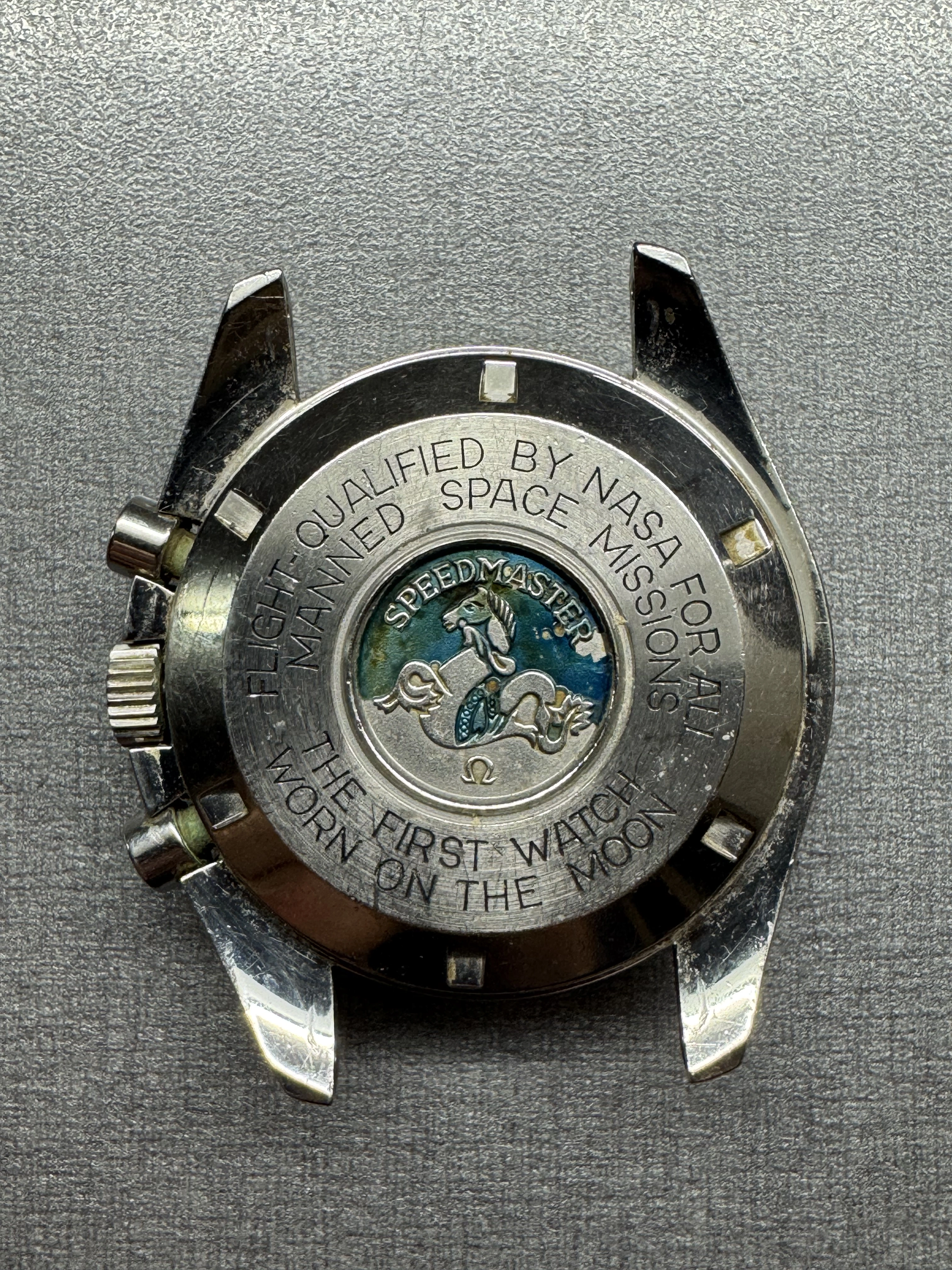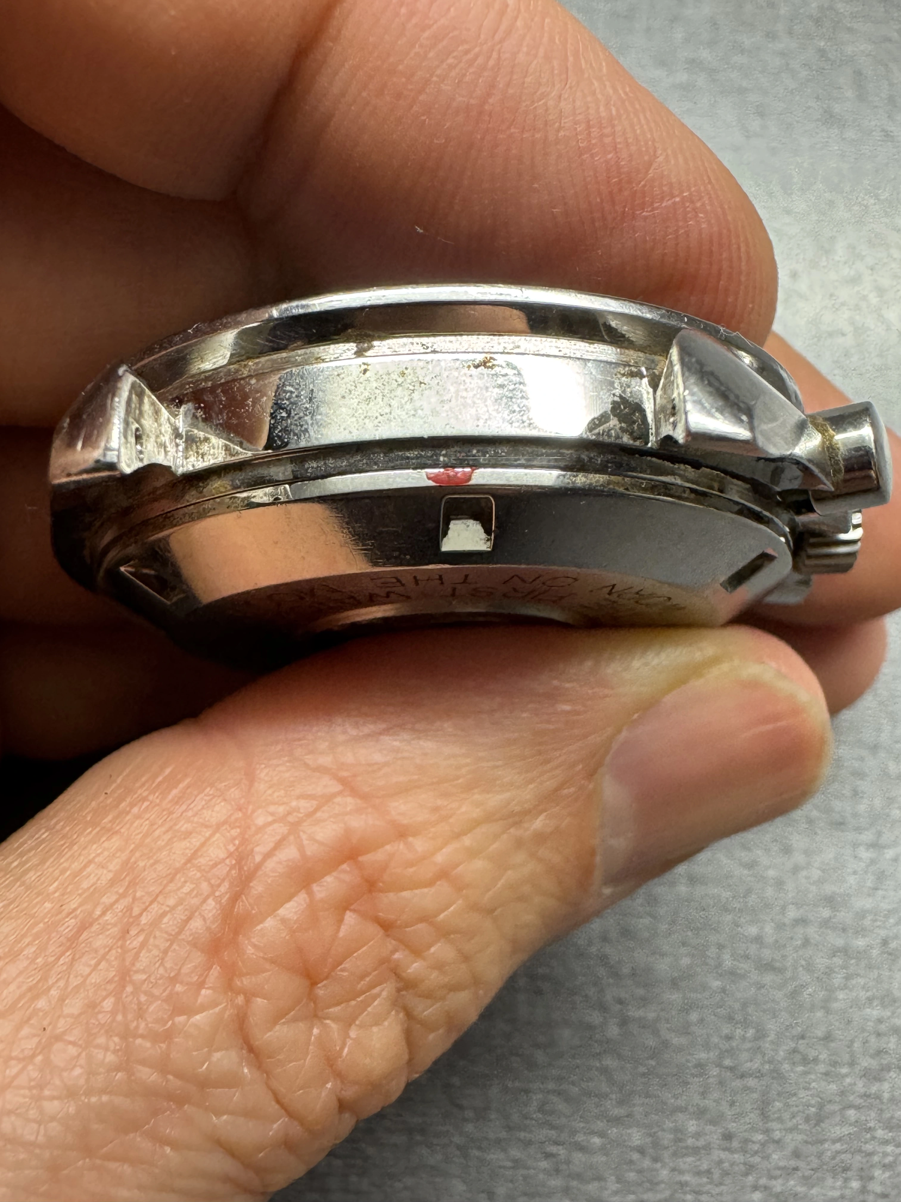 Case. In a nice honest condition, unpolished. There is still the purple wax on the caseback and the red dot. Seems unopened to me.