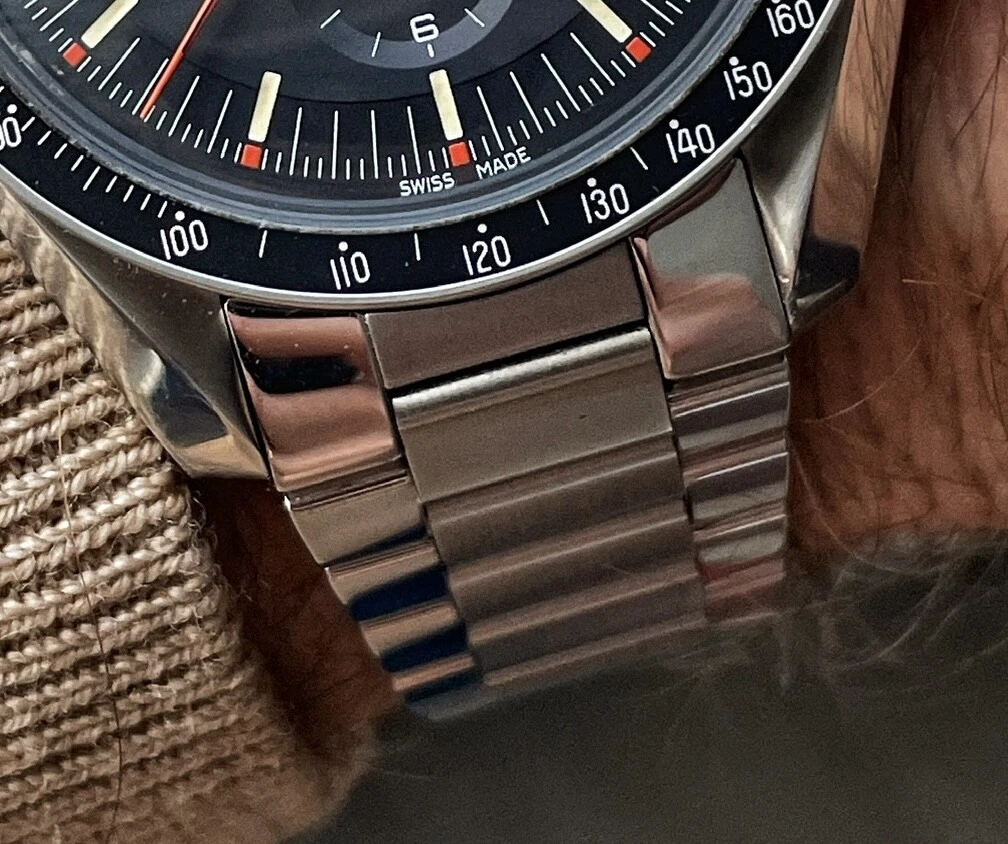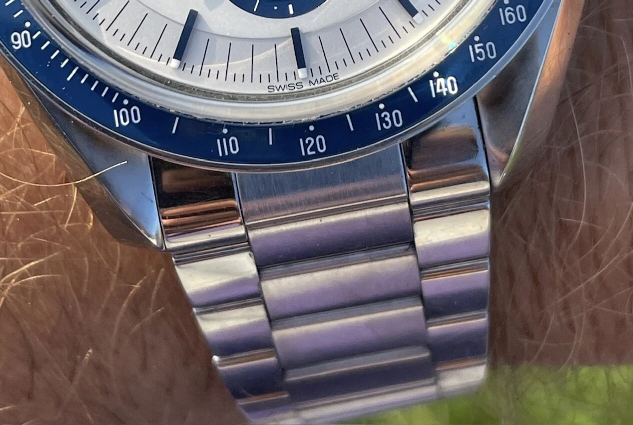 The reasoning for me doing this, after extensive research is that the A11 bracelet won't fit onto a normal Speedmaster because of the notches on the end links so you have 3 options - 1. Dremel off the notches, 2. Use 1.5mm springbars which I don't want to do due to security and 3. Use aftermarket end links but I'd prefer keep it all original Omega.