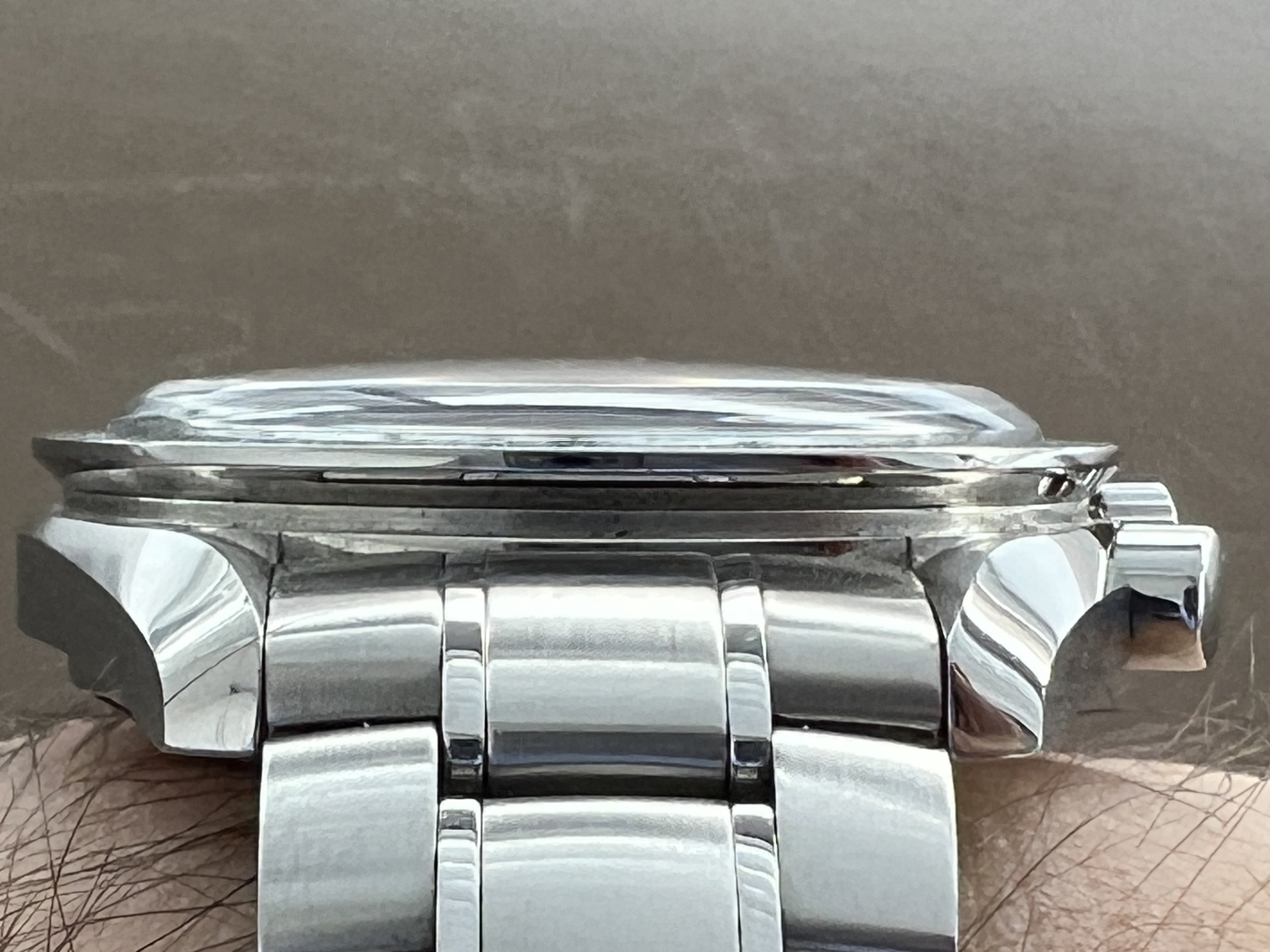 Like with the contemporary FOIS, also a 2012 design, the hands are coordinated to match the function, blued for the chrono feature and chromed for the timekeeping. Not all love this quirk on the FOIS it's true as it is leads to asymmetry but it is valid from a functional perspective. It’s a bit less obvious here than with the FOIS though as it’s the hand finish that differs, not the shape. One final observation, the bracelet clasp text is black infilled on mine, I've not noticed that on any other example so makes me wonder why. Are there any other similar models with infilled clasp text like this?