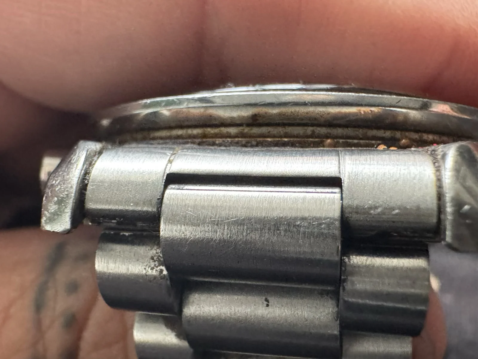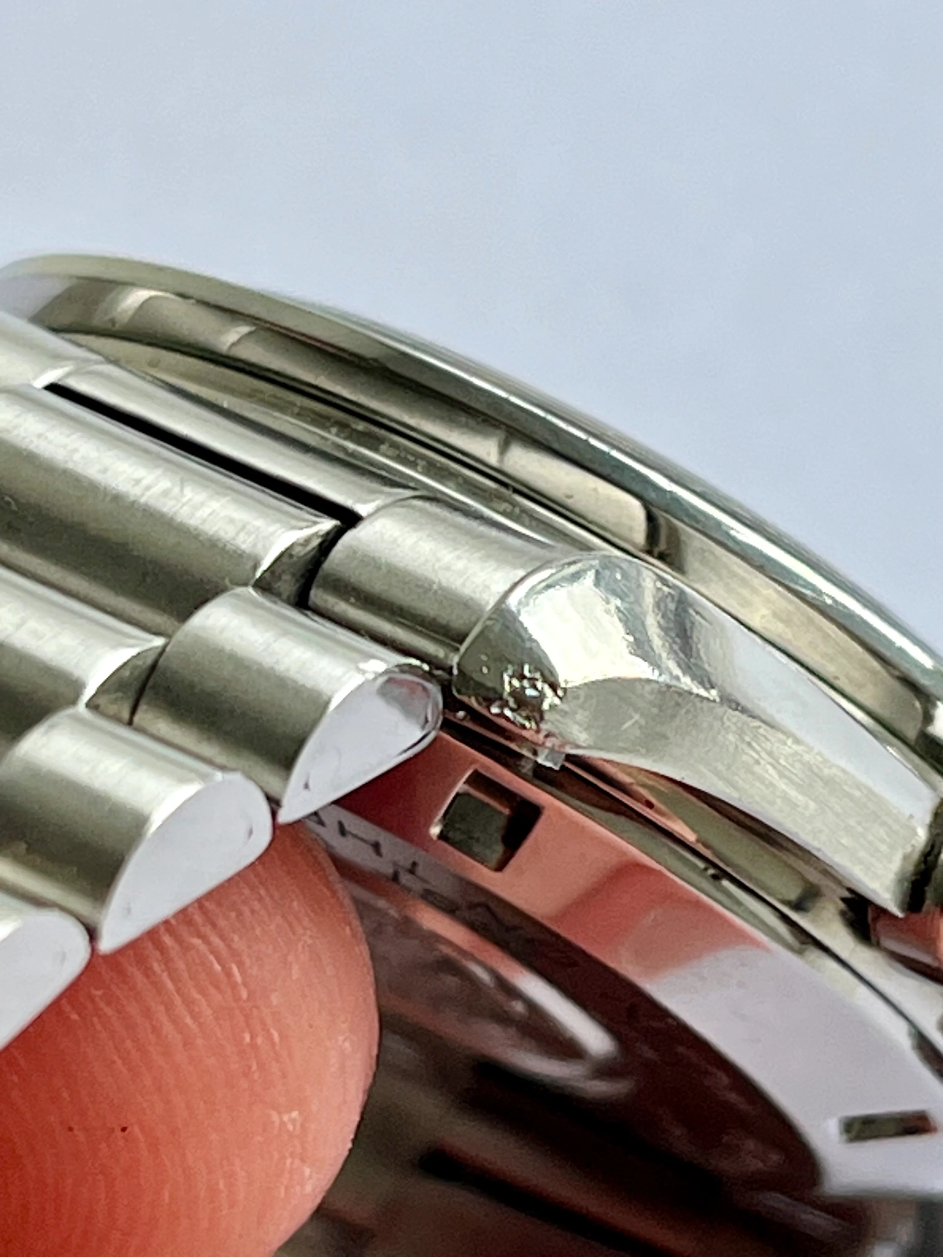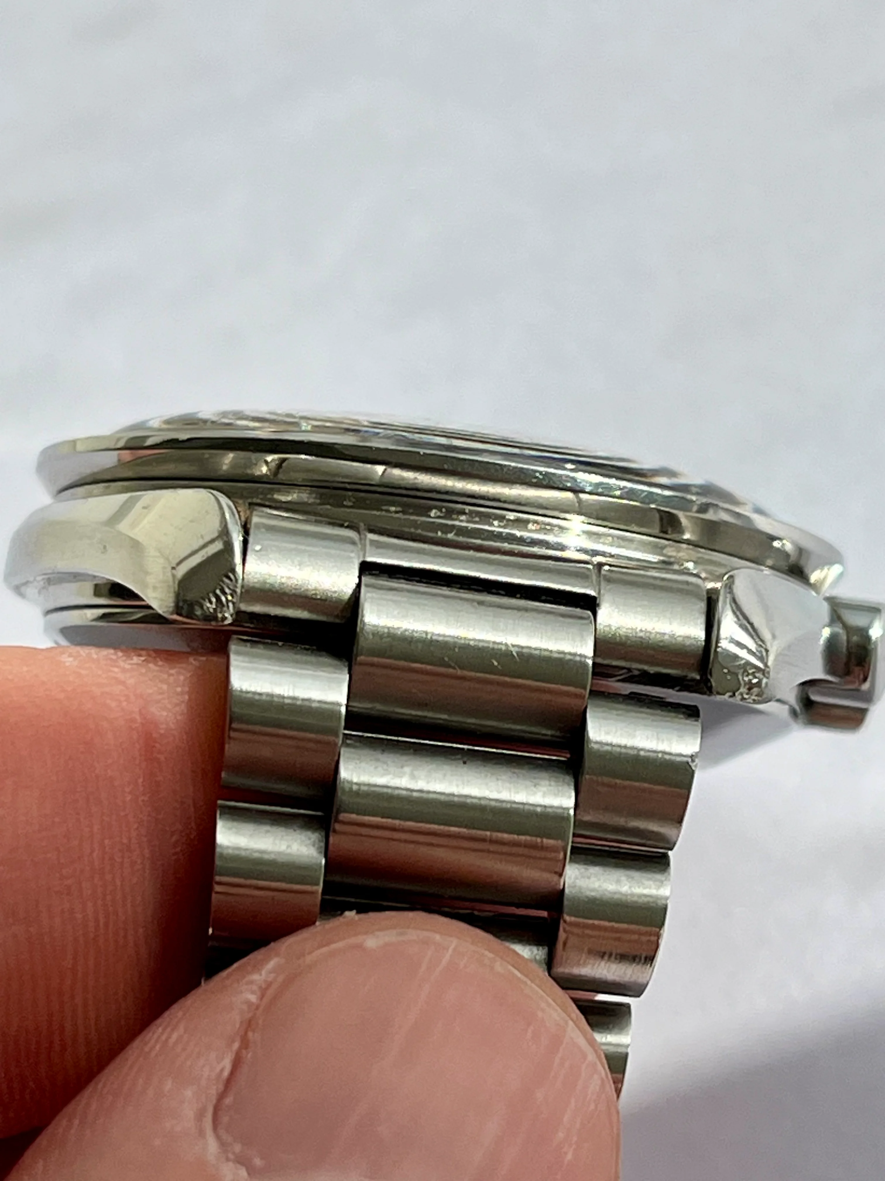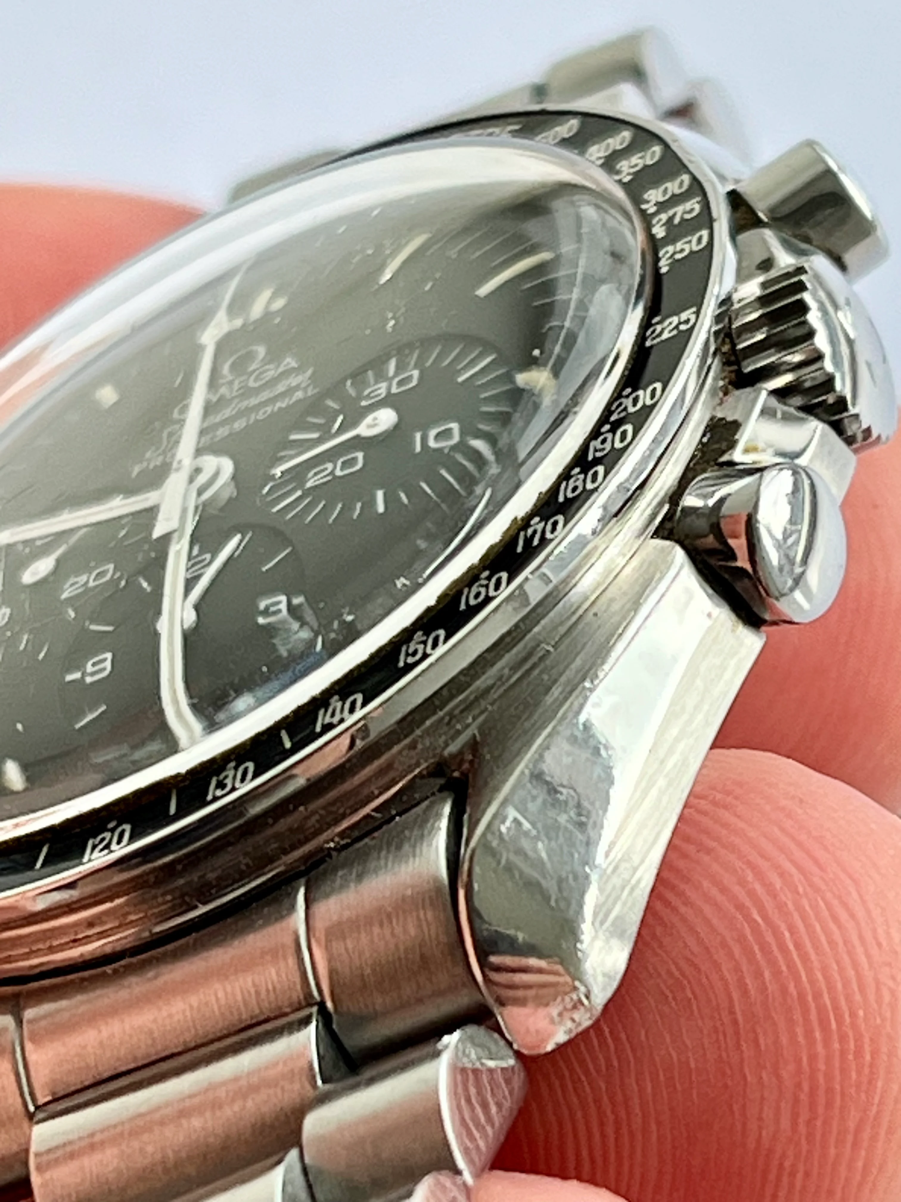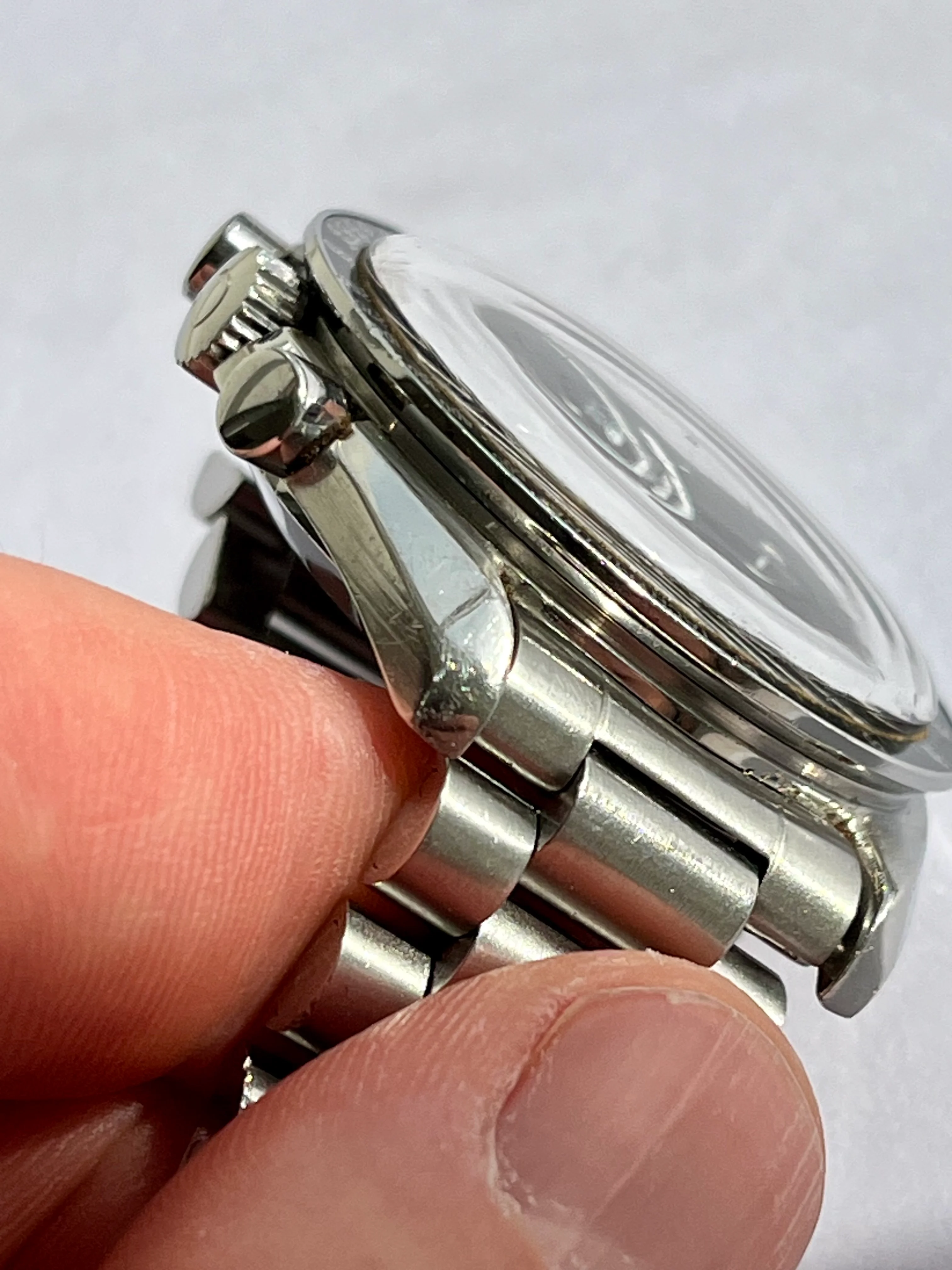 ·I have lusted after a Speedmaster for many years and my grail watch has always been the tritium versions especially the late 1980s ones that came on the 1450 bracelet with 808 end links. I managed to find one that was within my modest budget and pulled the trigger. It certainly isn't perfect and has a few nicks and scratches but I love it. It came with the box and papers and it would appear that even though it was made in 1989 it wasn't bought until 1996, it was well worn though and has quite a few significant scars as a result. I will include a few photos to illustrate, the lug tips are scarred and the high polished bevelled edges have a few scratches too. I am wondering what the general consensus is about having cases refinished via laser welding etc? I don't want to simply have it polished and lose those sharp transitions from high polish to brushed. I have seen some fine results online from laser welding but who do I trust to do the work in the UK, it could potentially be a disaster!