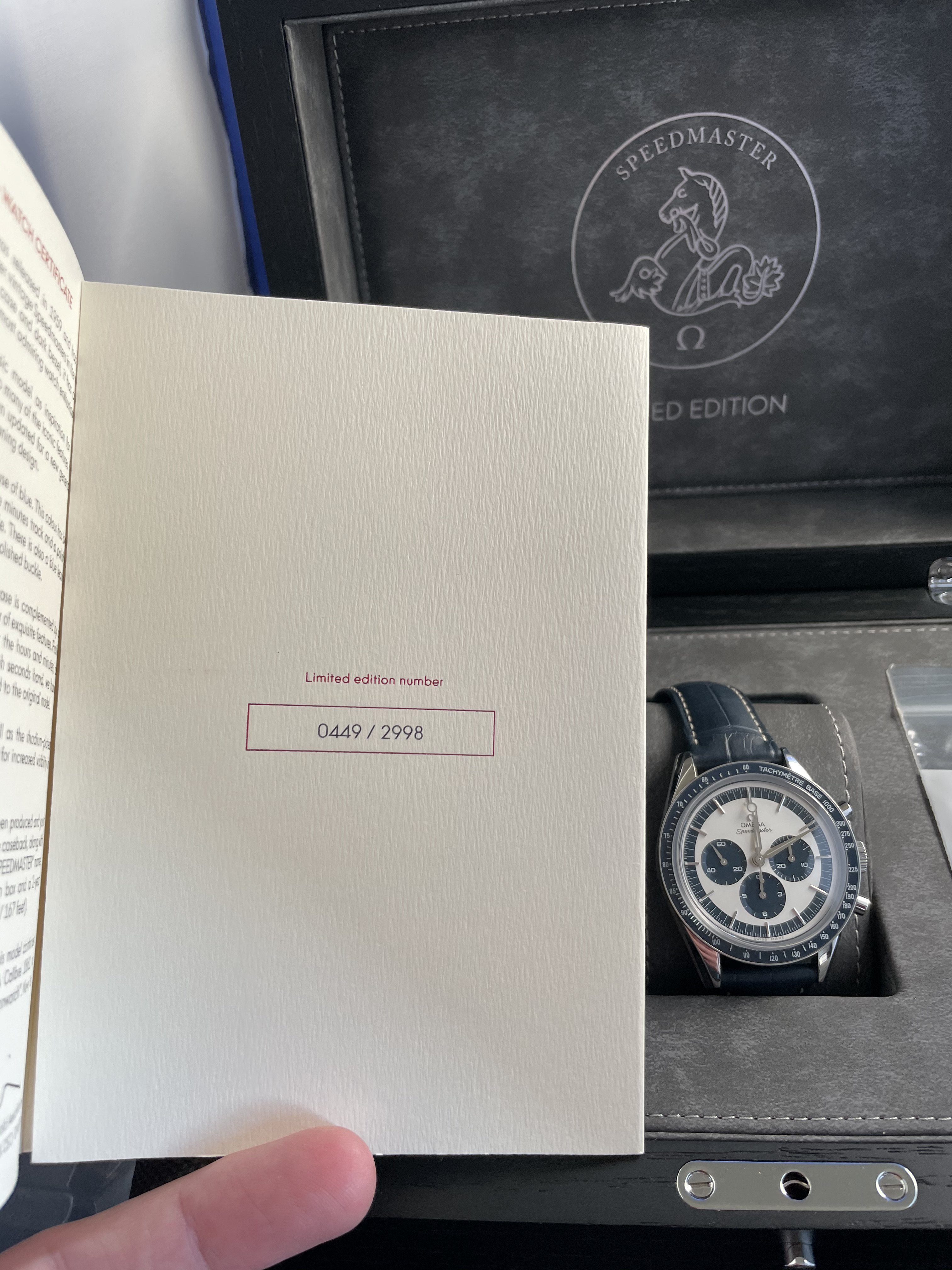 "Omega Speedmaster Limited Edition Watch 311.33.40.30.02.001 Box Card. Manual-winding chronograph movement. Caliber 1861. Stainless steel round case 39.7 mm in diameter. Polished blue ceramic bezel with a white Super-LumiNova tachymeter scale. Scratch-resistant sapphire crystal with anti-reflective treatment inside. Silver opaline dial with indexes and 3 blue subdials -- small-seconds recorder at 9, a 30-minute recorder at 3, and a 12-hour recorder at 6. Rhodium-plated Alpha hands and the Lollipop chronograph seconds hand. Blue canvas strap with stainless steel tang buckle."