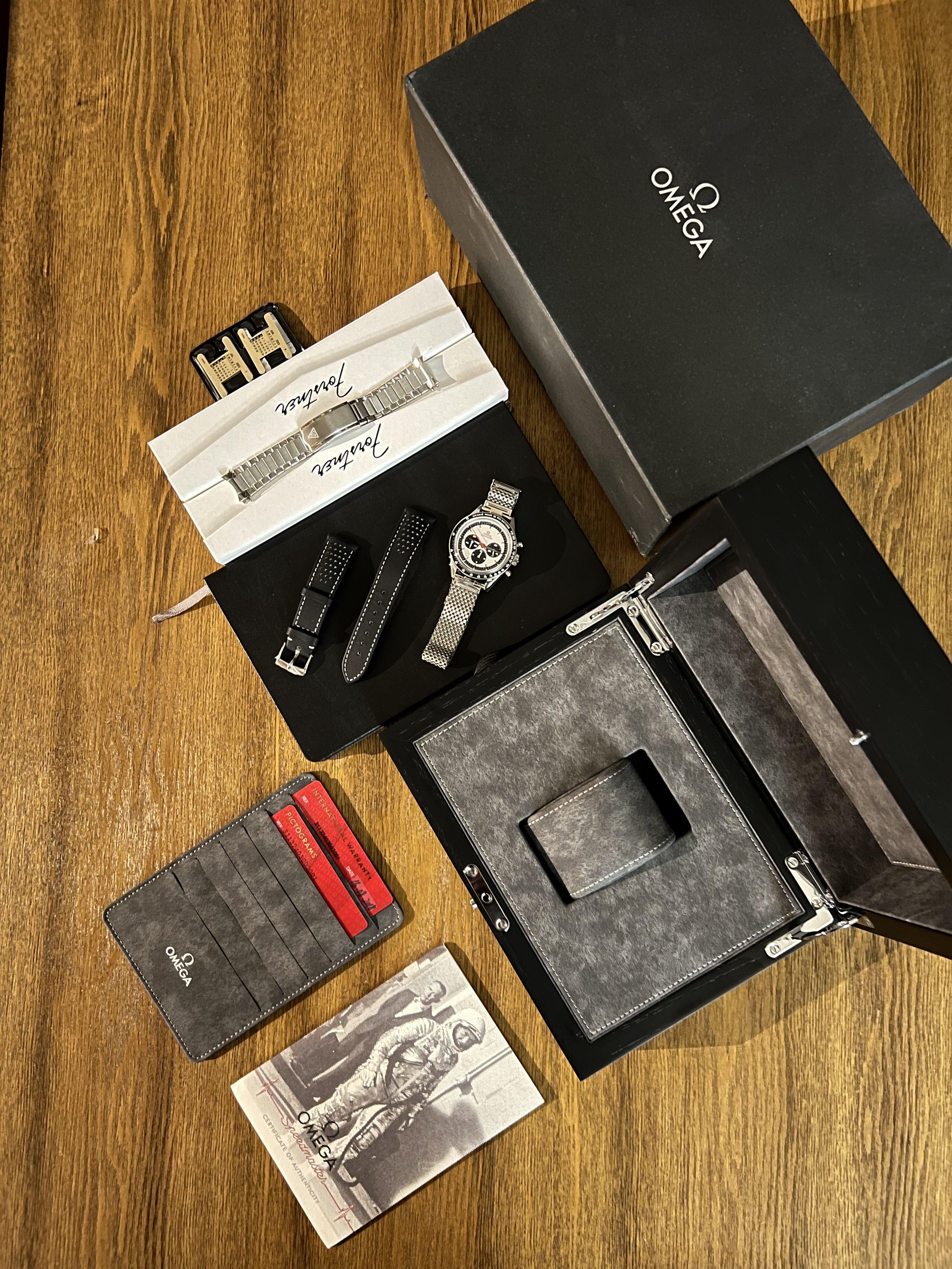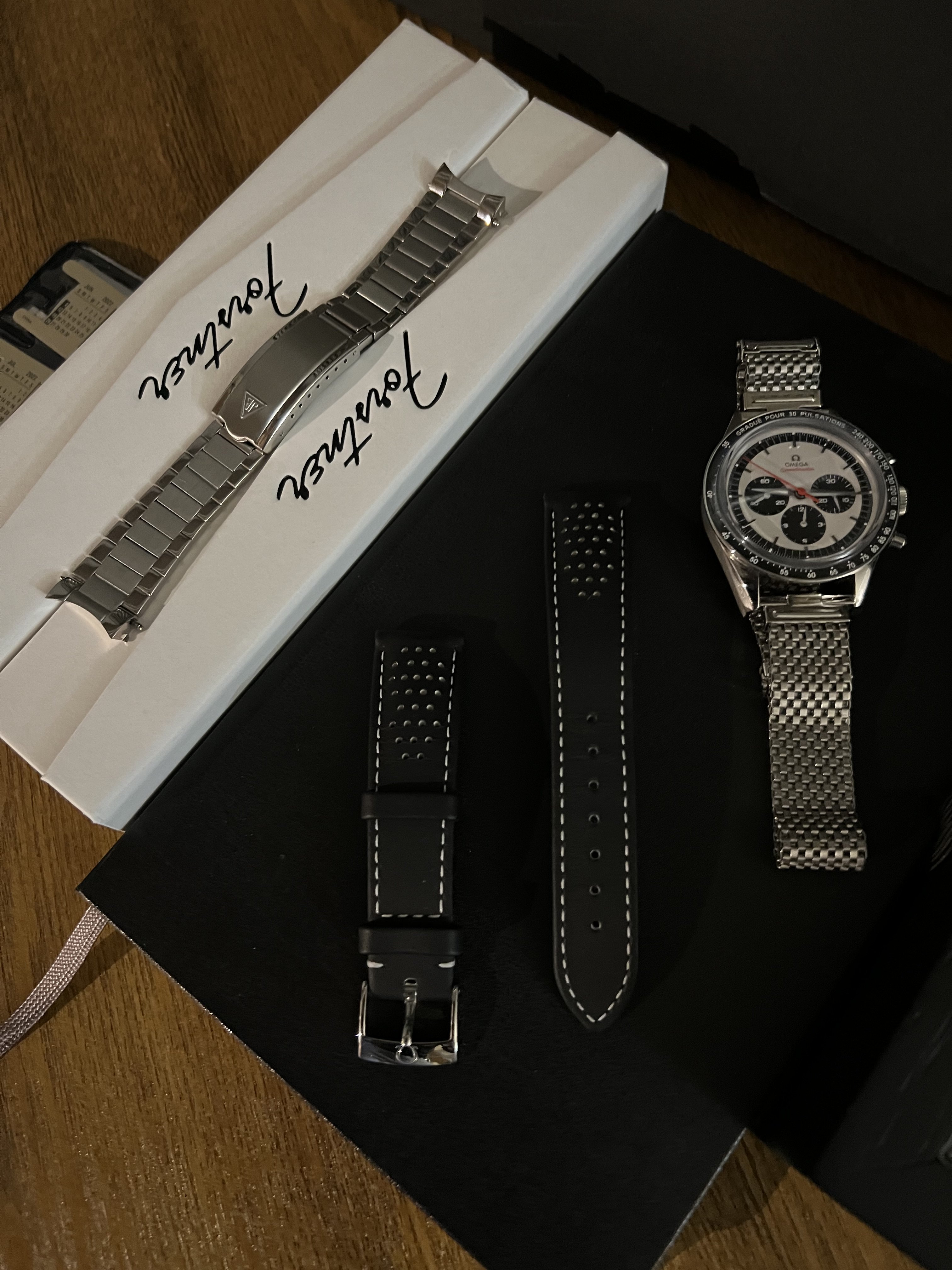 -Essentially unused OEM Omega leather racing strap