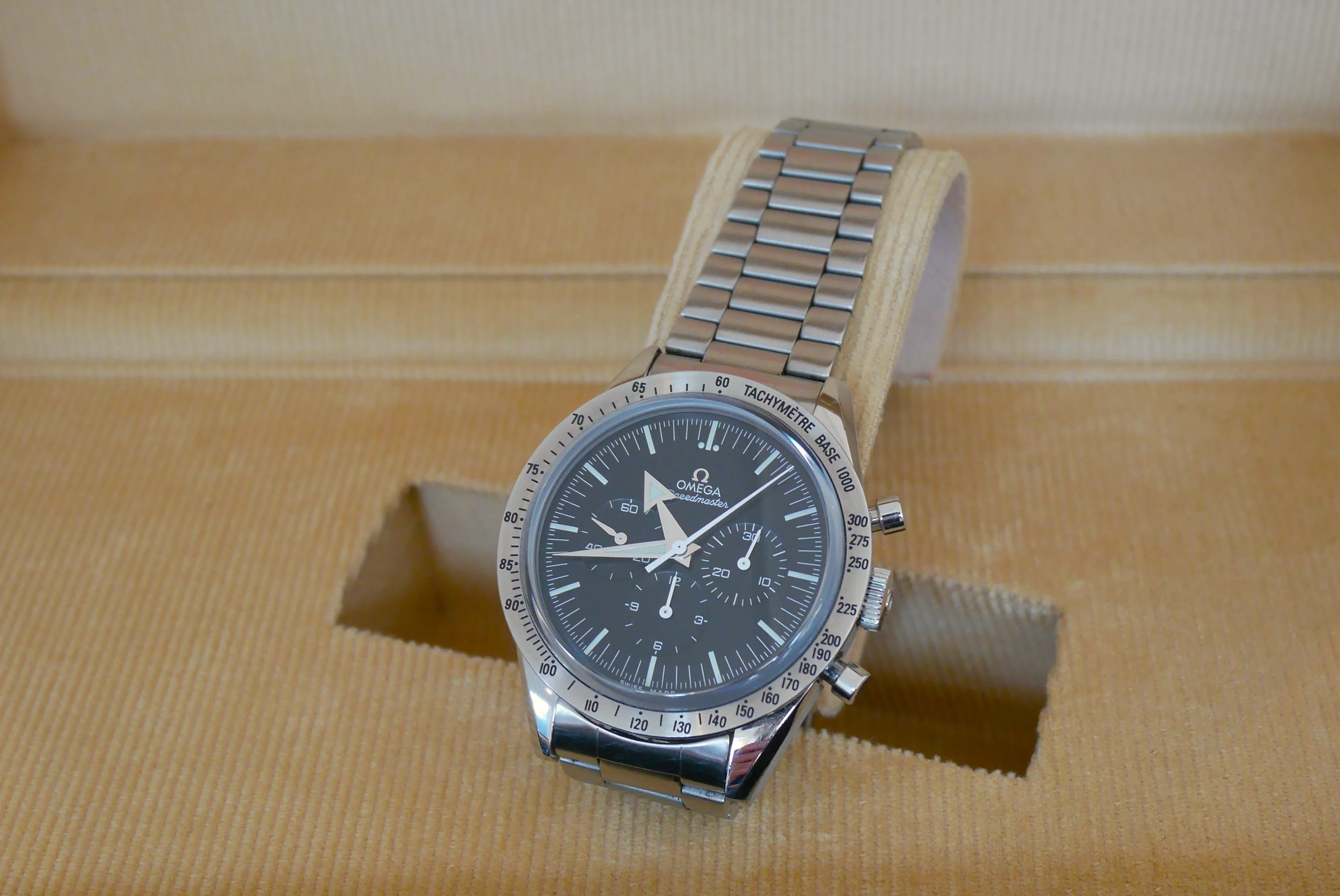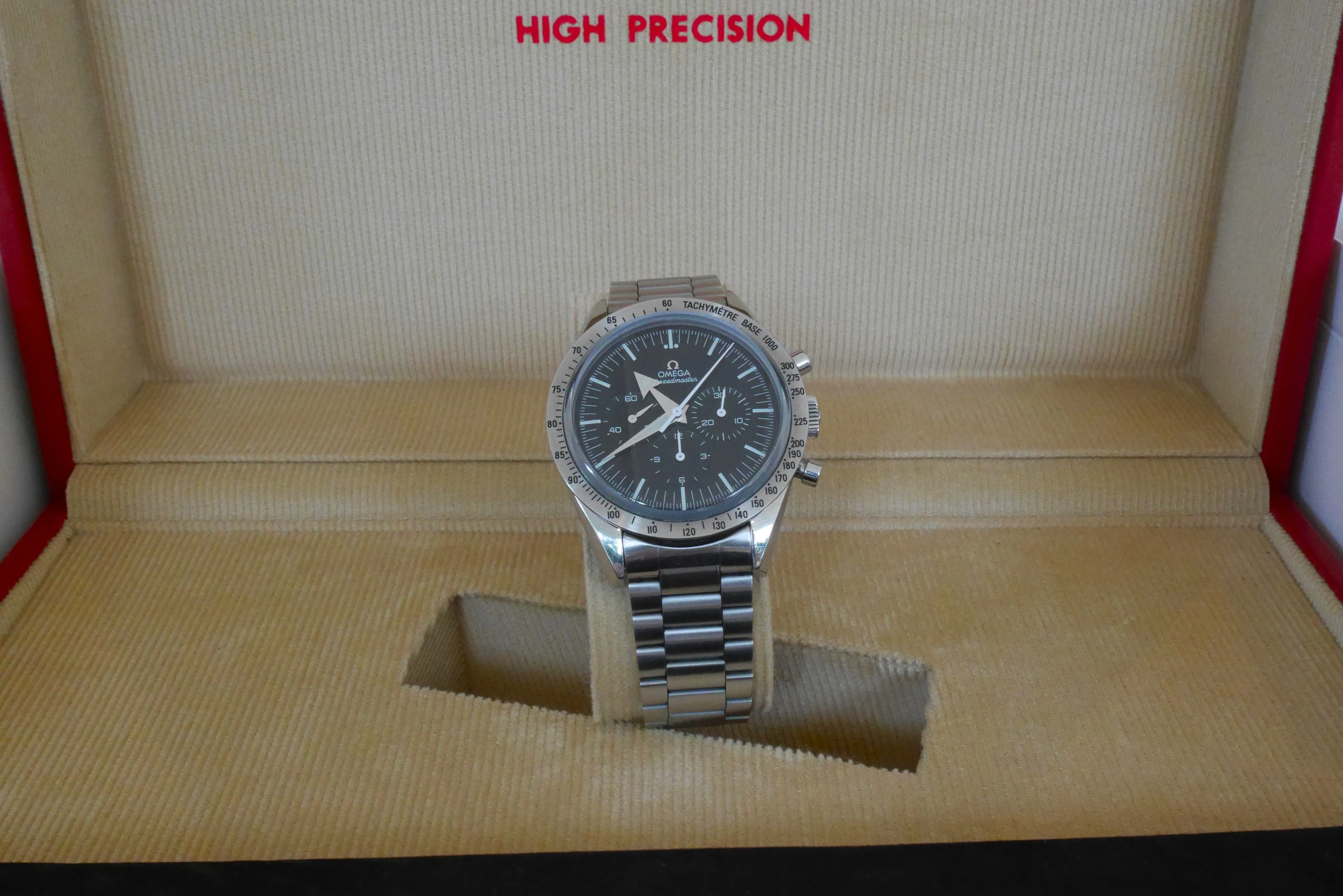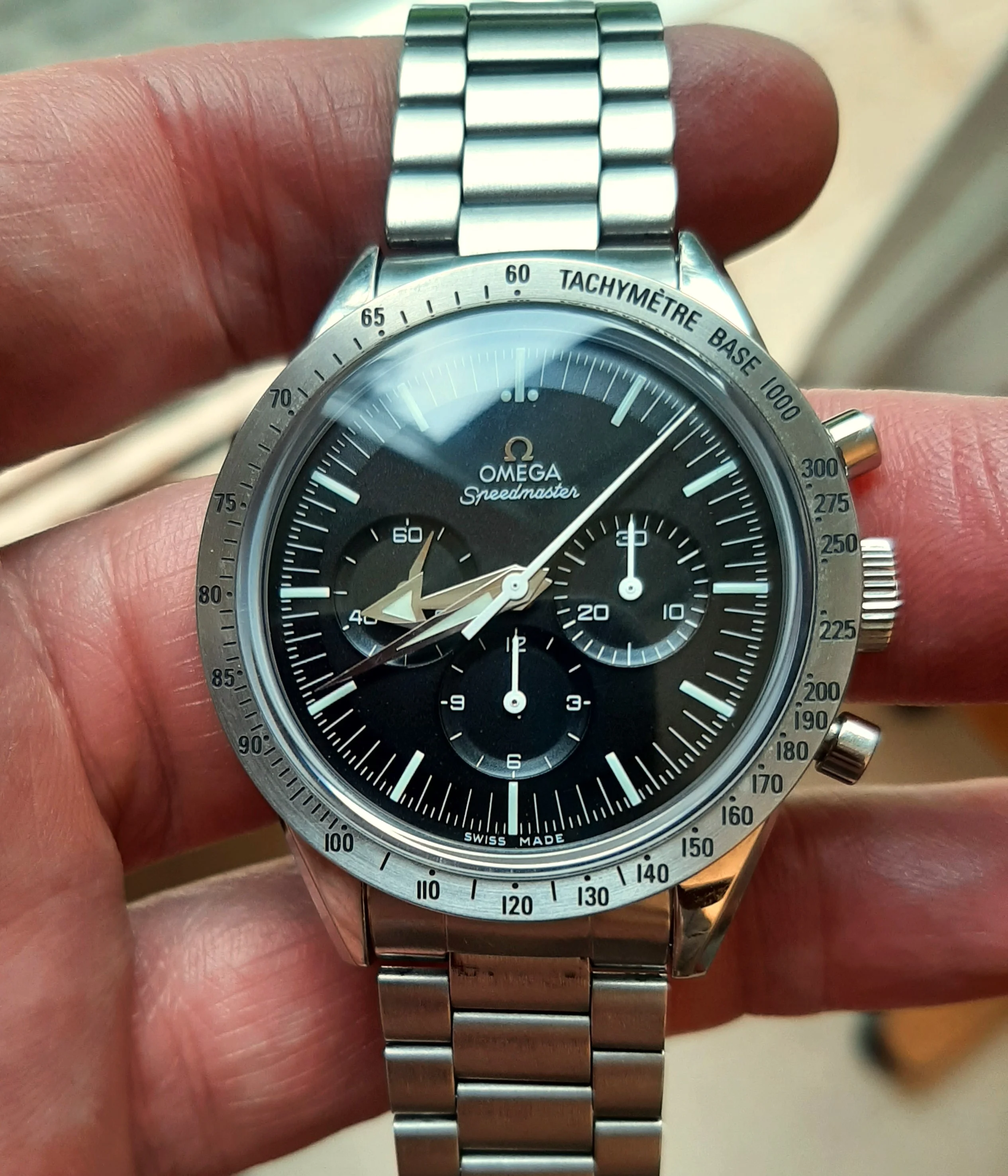 ·A First Omega in Space 2012 ref 311.32.40.30.01.001 FOIS converted to resemble a CK2915 1957 first edition Speedmaster by using all original Omega parts like the Broad Arrow hands and the steel Tachymeter 1000 bezel from a ref 3594.50.
