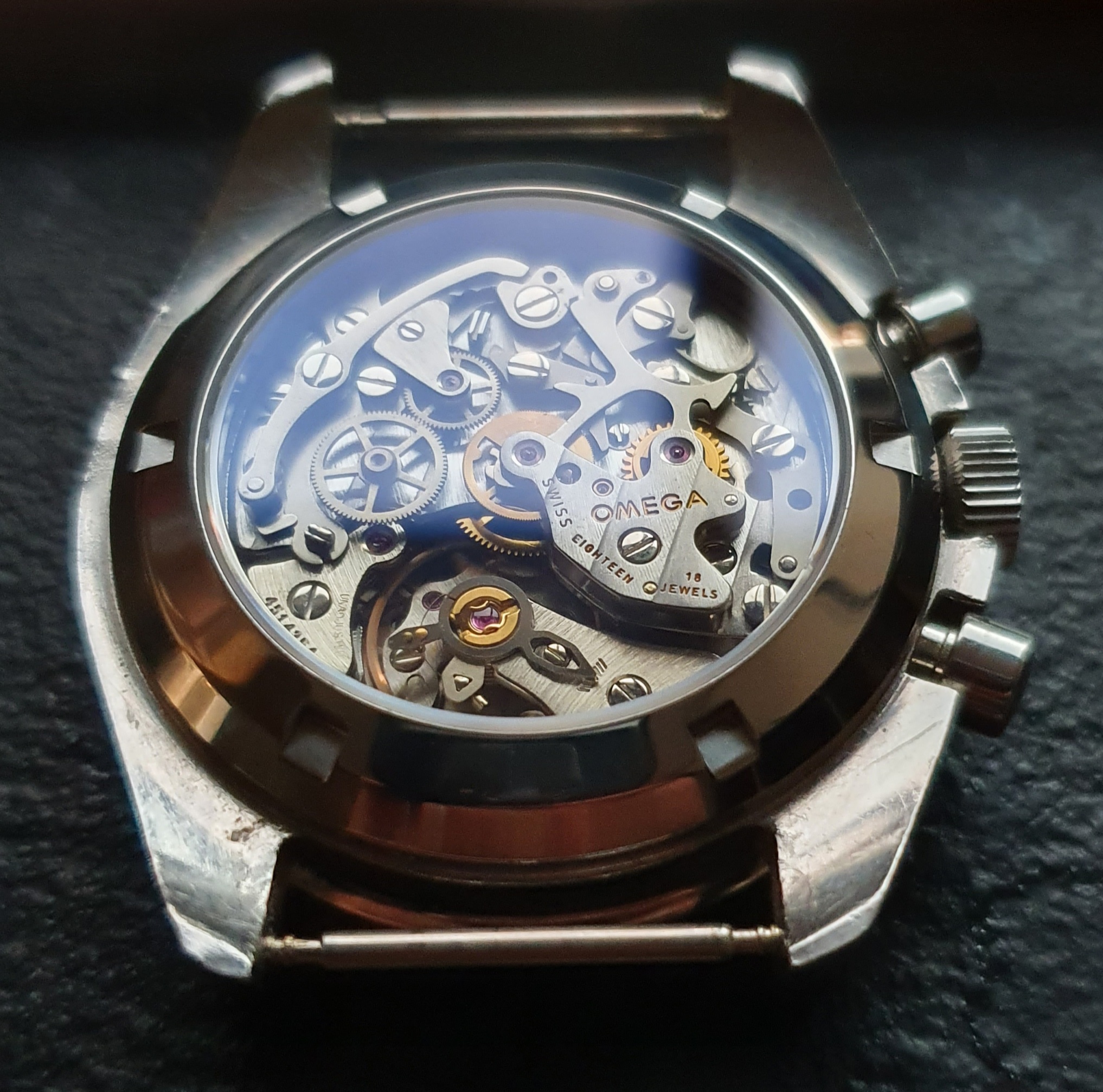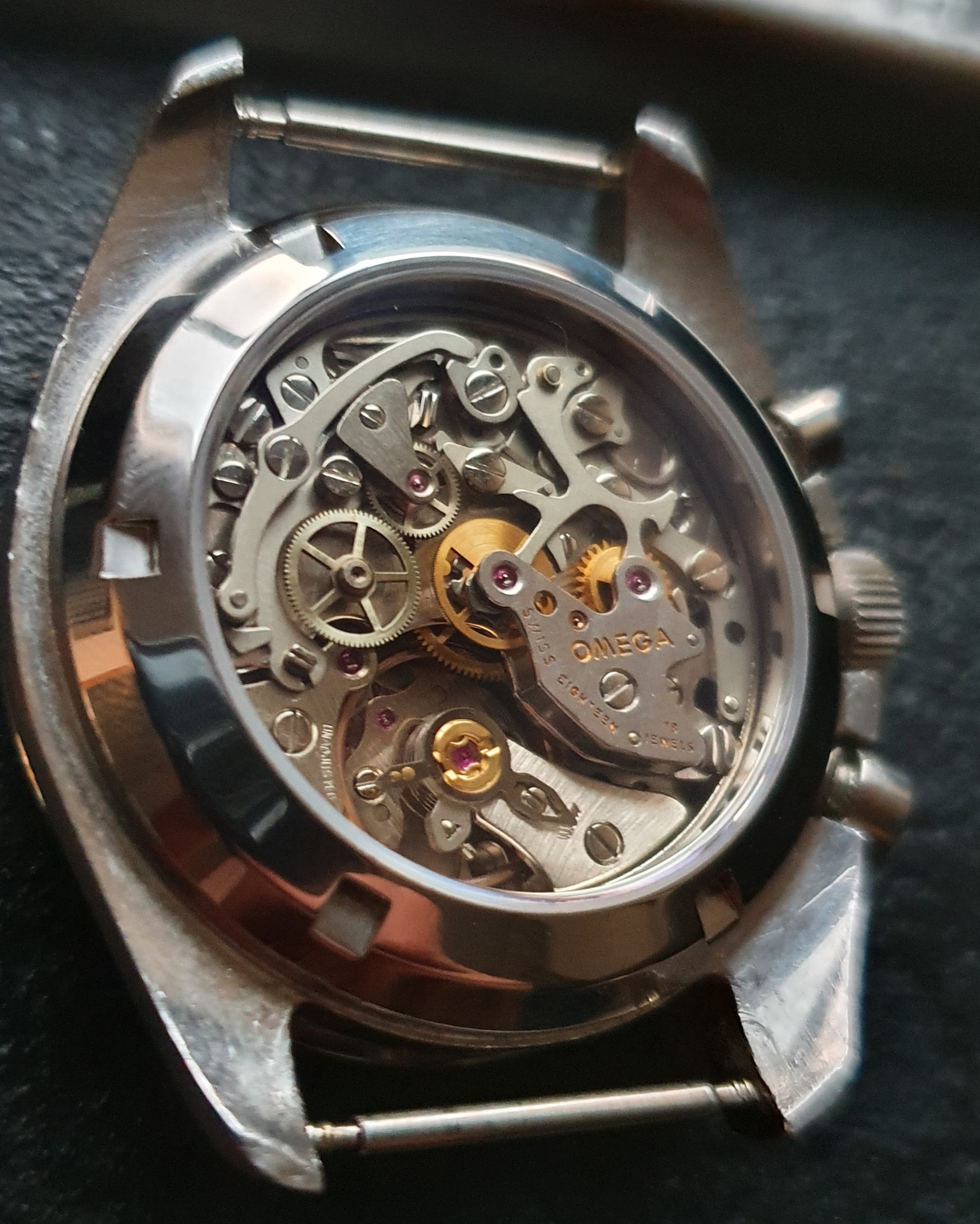 The movement is a Lemania 1873 fully serviced on which I added an Omega barrel bridge and chronograph bridge.