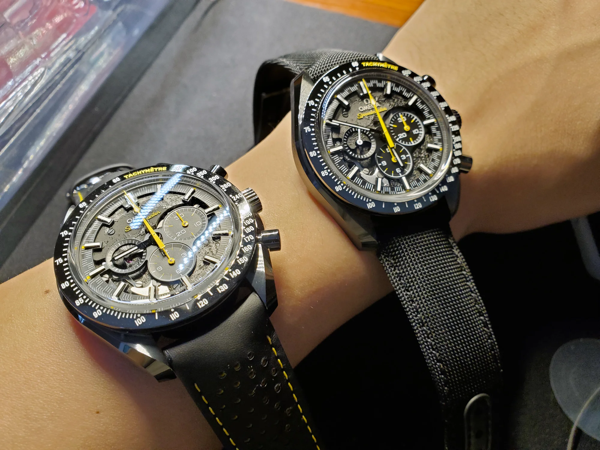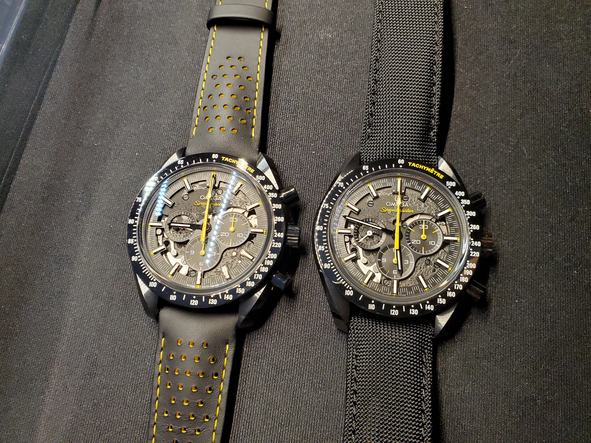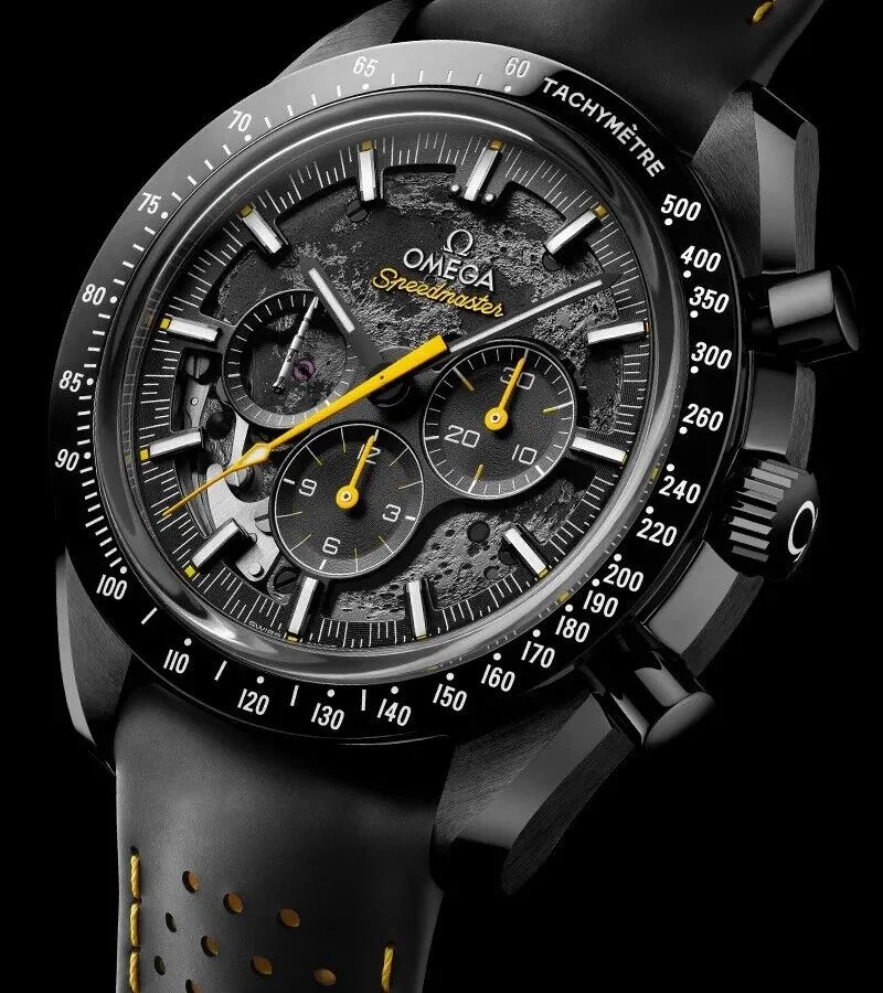 Definitely gimmicky, but a very fun, sporty, and modern alternative to a watch that has been manufactured for forever. 44.25mm size, but it's not that much bigger than a standard Moonwatch... about 1 extra mm per side, and the all-black ceramic case helps hide its size. Thickness is about the same.