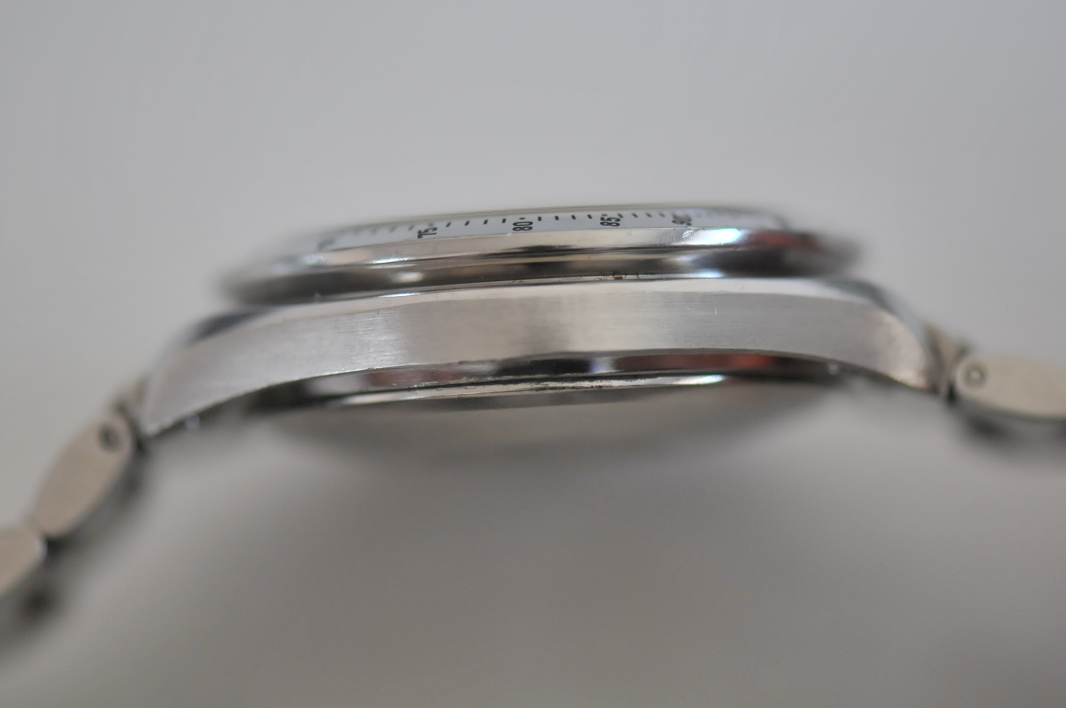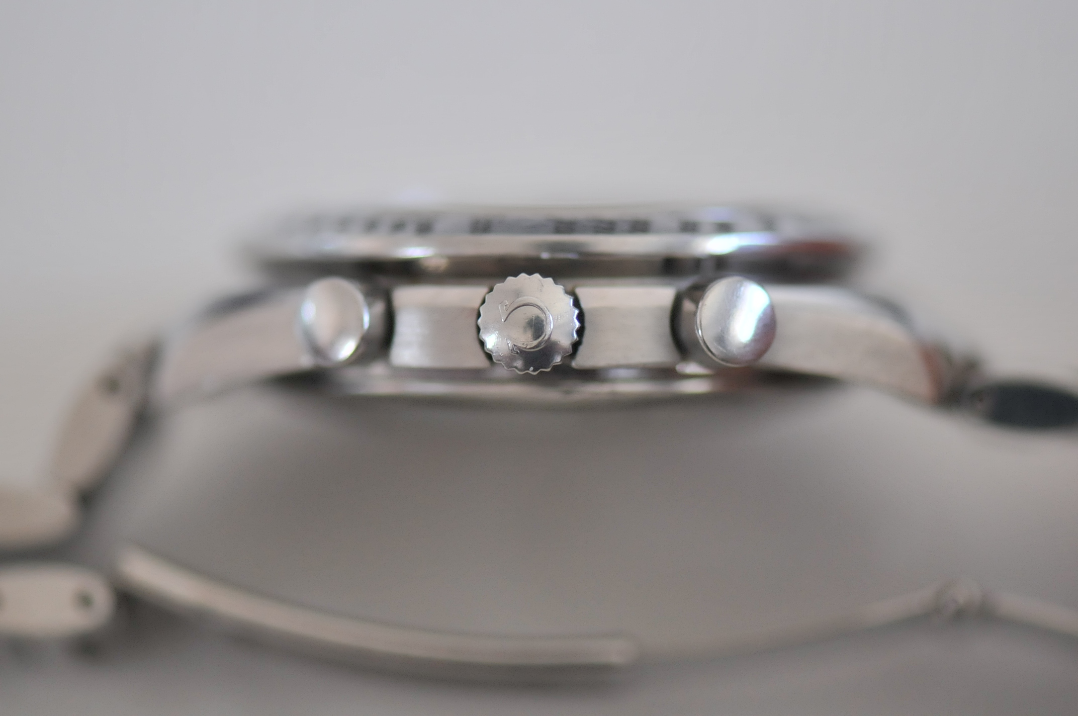I do not know the service history of the watch but all the functions runs as it should and has an error of about 7 sec per day. The bracelet will now fit on 18.5cm wrist size but i have all the extra links which were removed from the bracelet. The chronograph start, stop, reset very well. The date adjust well and advance well.No box or cards.