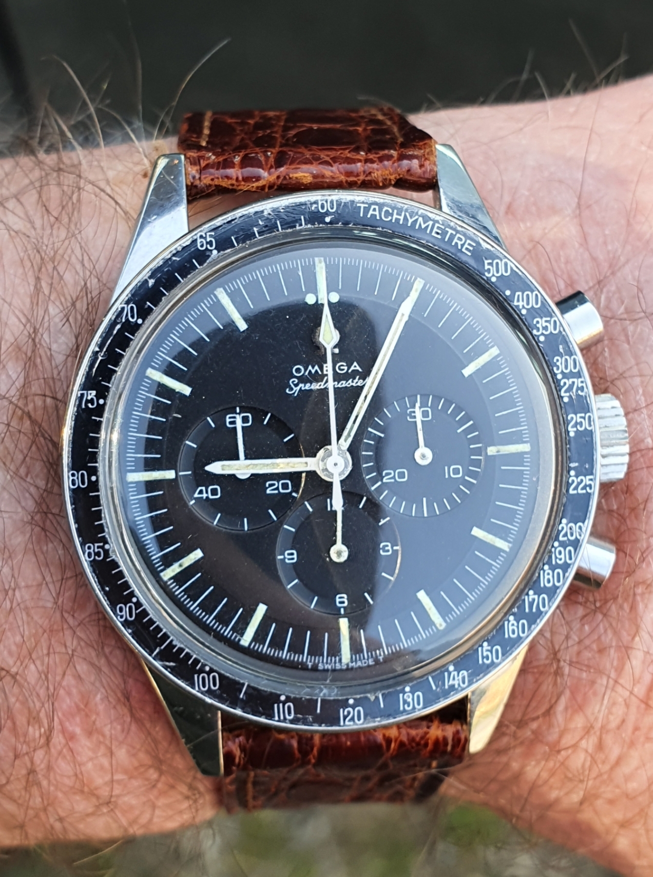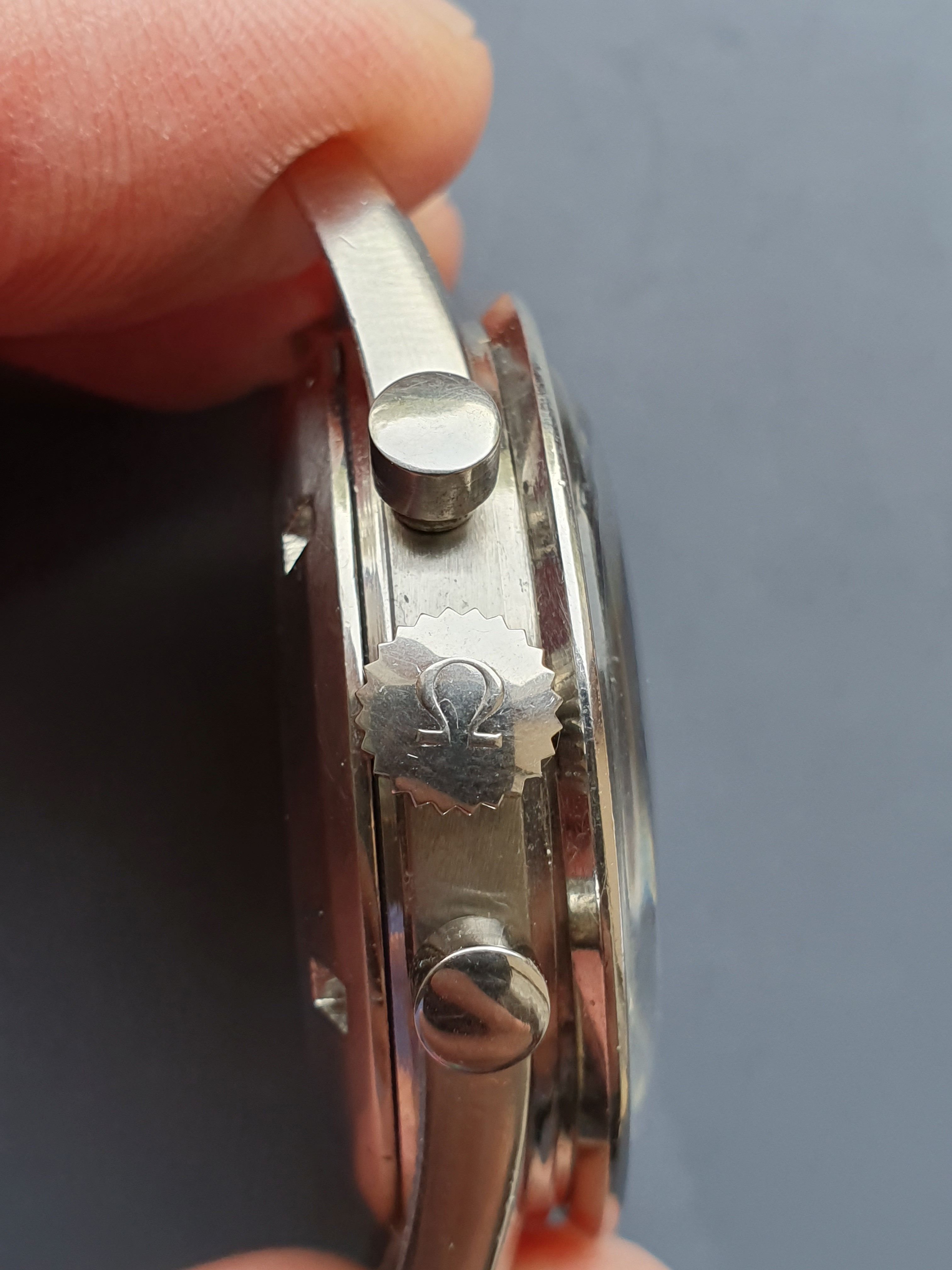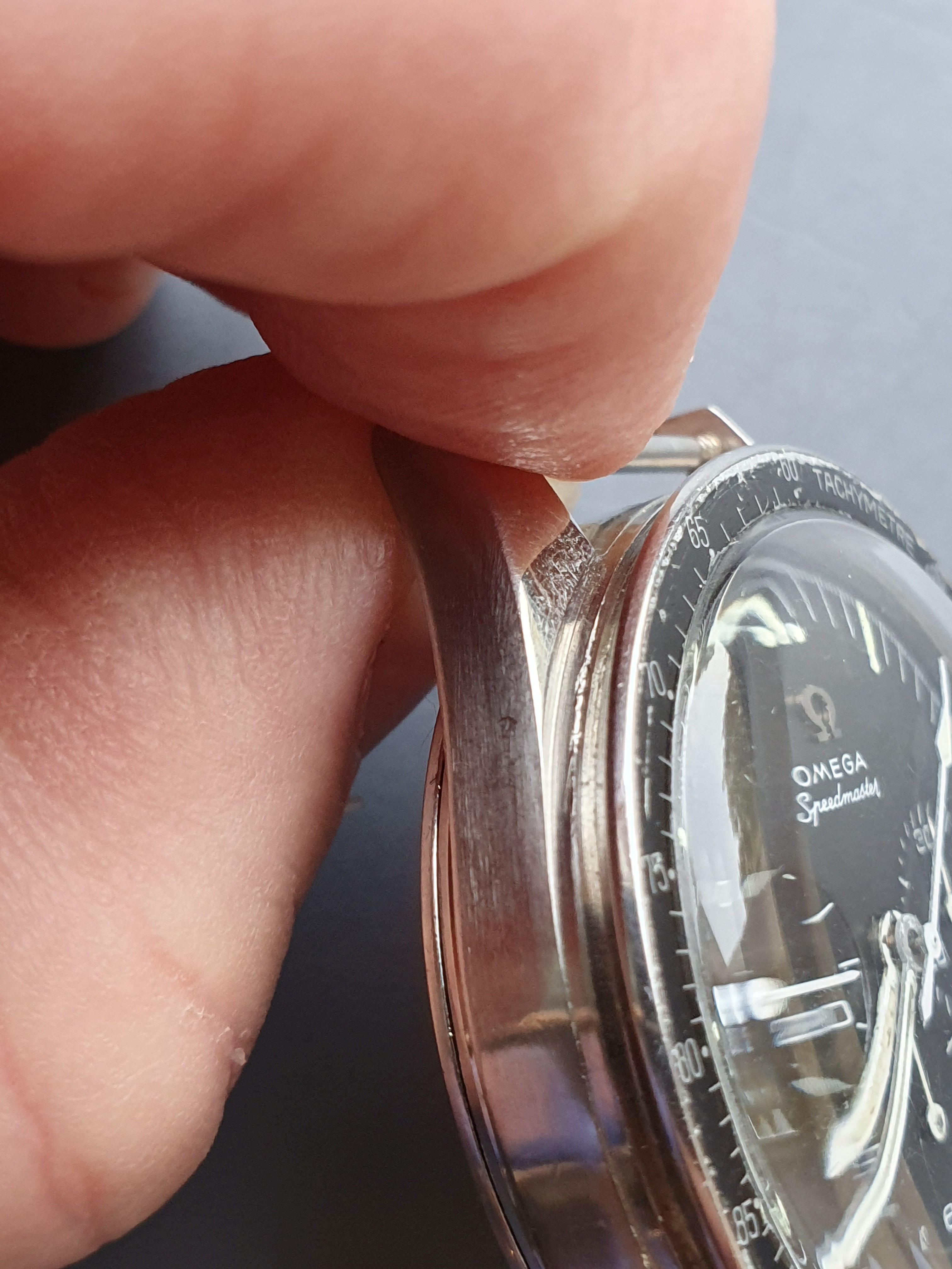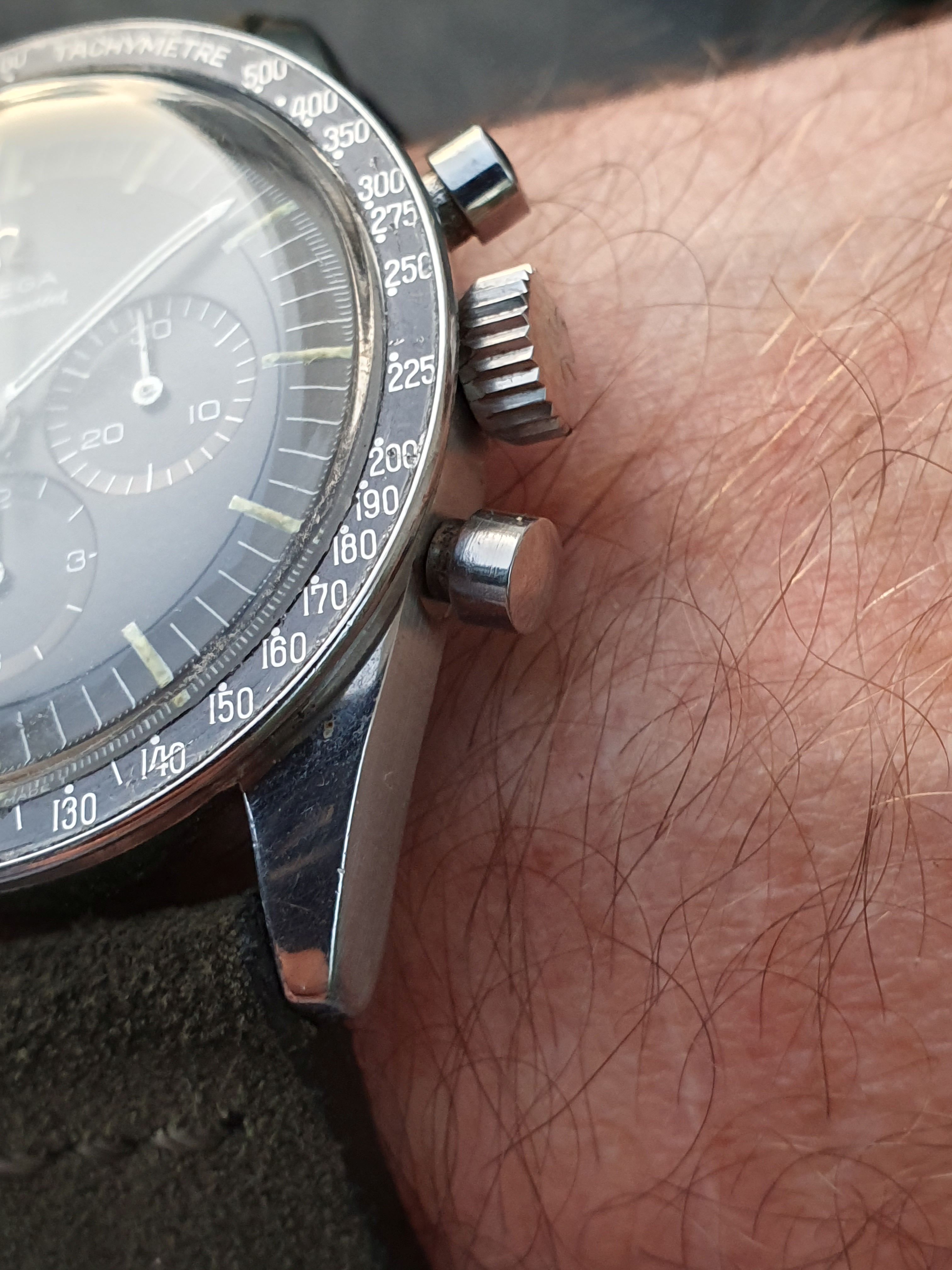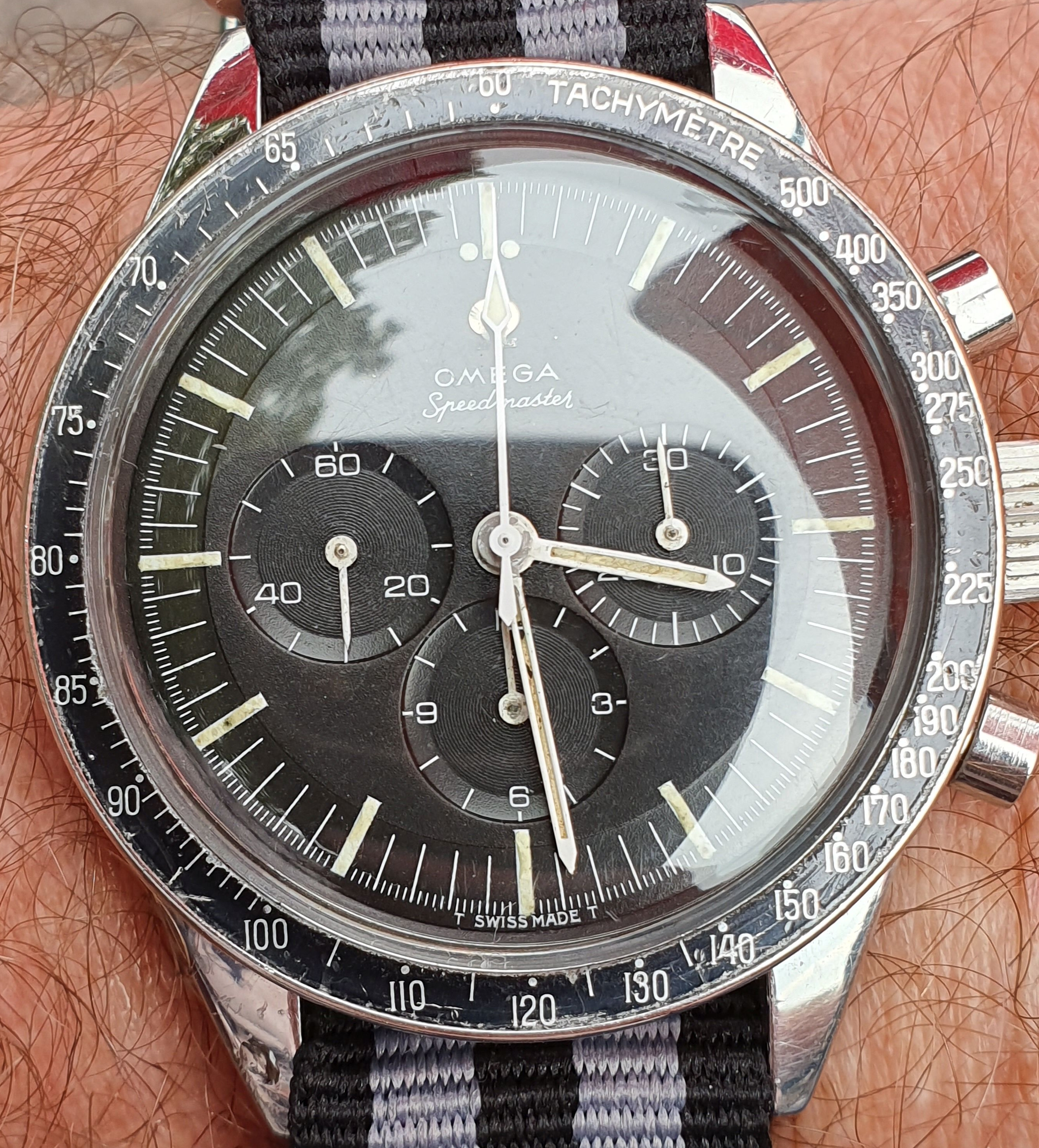 The correct DON bezel of the speedmaster is in good condition, it is worn, has also patina but now major damage.