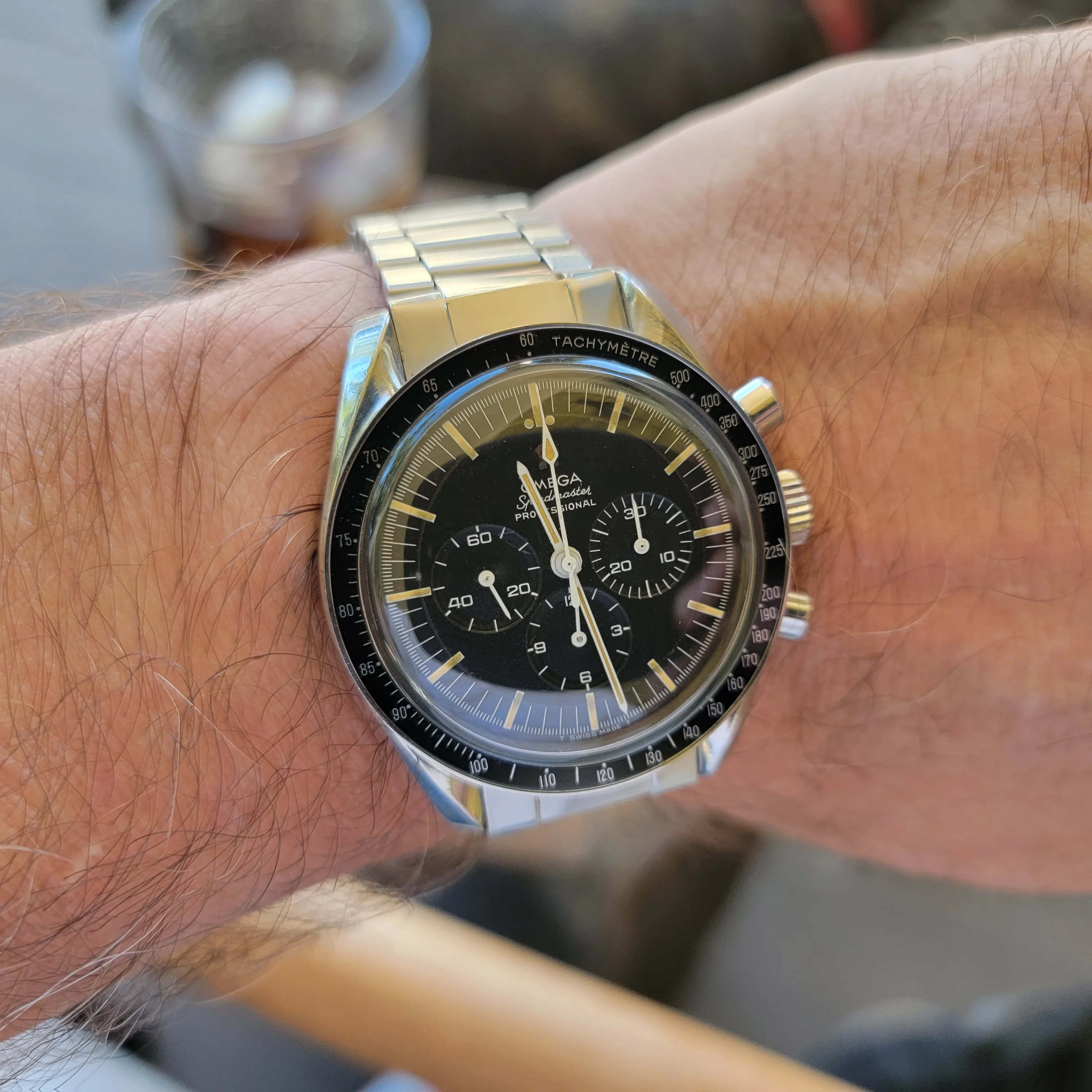 However once I've tried on the 321 Ed White, all the above went out of the window. The Ed White is finished to a noticeably higher standard than the 3861/1861 moonwatch. The fit and finish of the case is top notch, the galvanized dial is sharp and clean, the long indices with slight patina shade superluminova is executed to the goldilock spot between vintage and modern, the lume works better in the dark. I had doubts about the ceramic bezel at first but the rich and crisp feel of the enamal lettering matches the high end finishing of the case very well. I put a FOIS bracelet on the watch so it has quick adjustment mechanism that comes in handy during summer.
