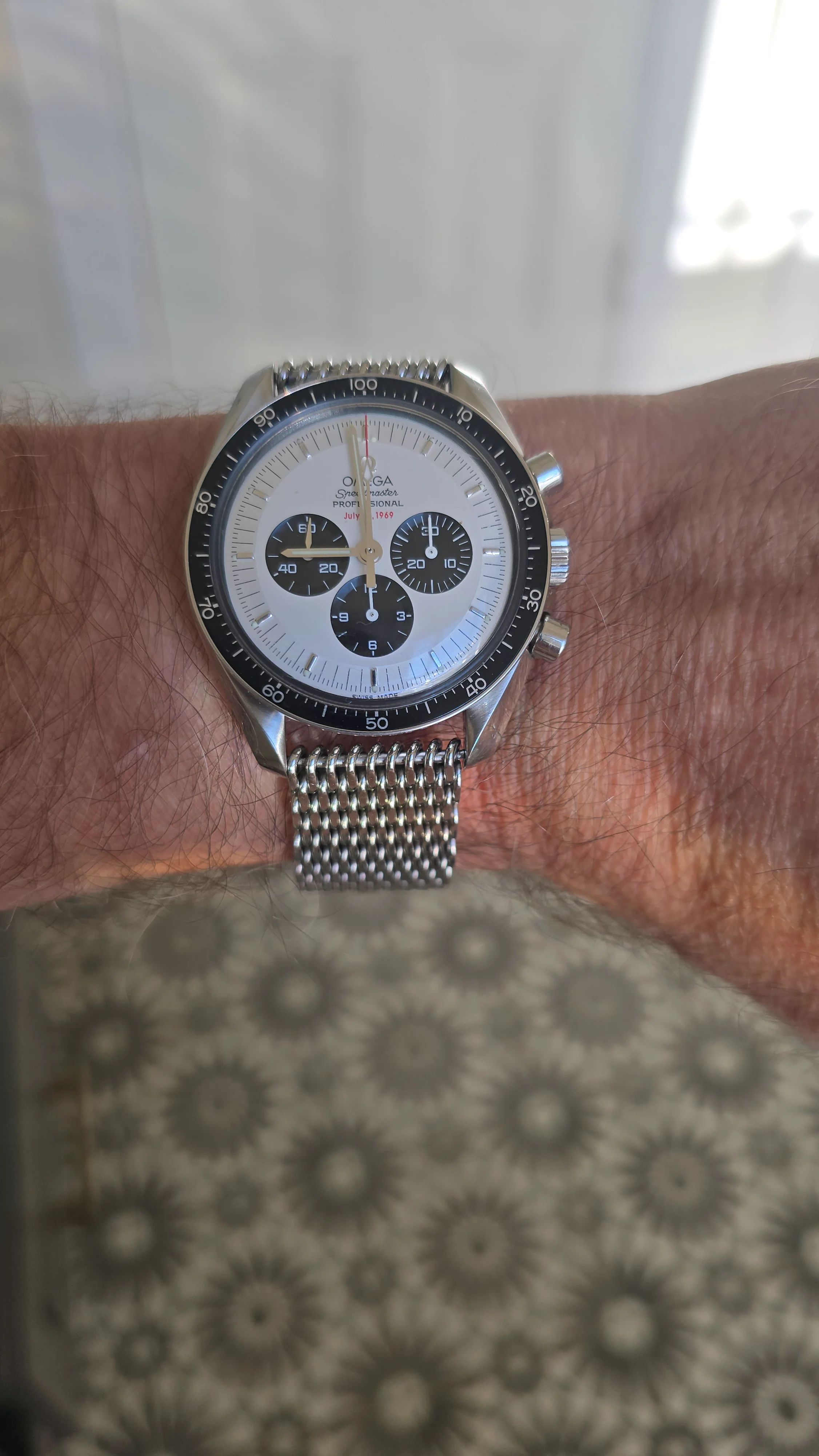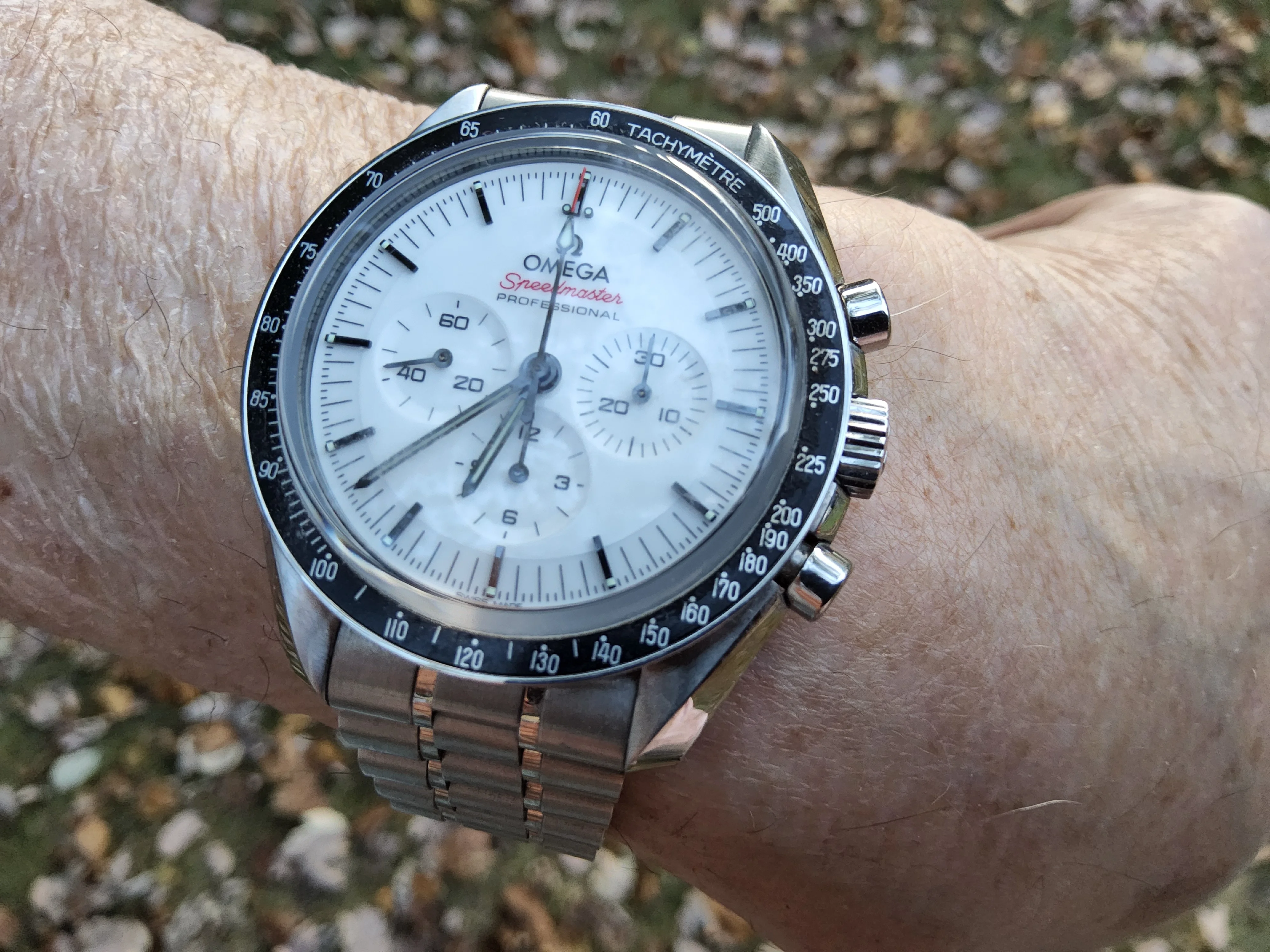 The standard moonwatch wears a bit better with it's slightly shorter lug-to-lug distance, thinner case and the additional crown guard actually makes it more balanced on the wrist. The Ed White wears taller, the movement is technically inferior to the 3861 and I personally prefer the Nixon bracelet with smaller links and on-the-fly adjustment clasp on the 3861 moonwatch.