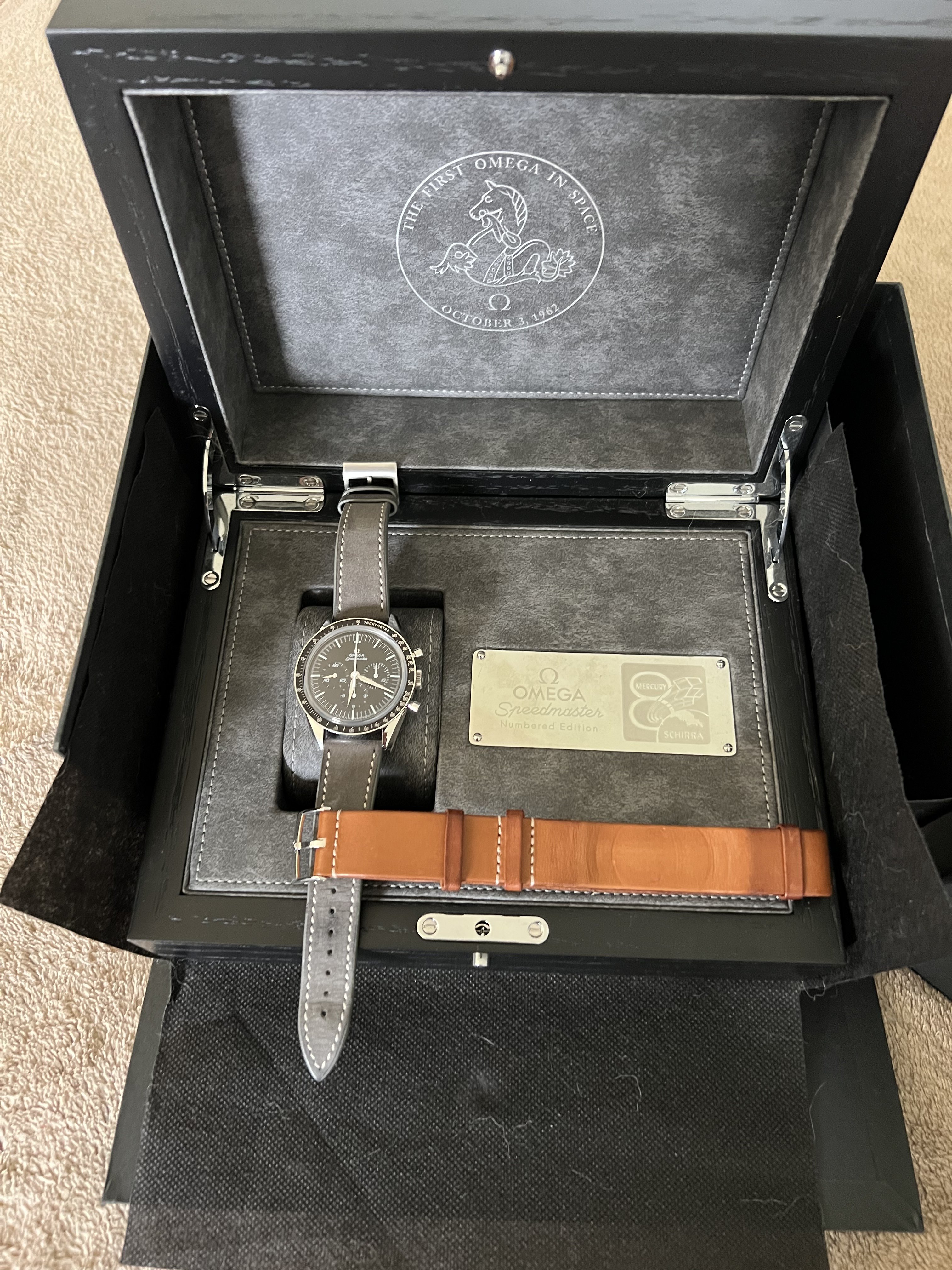 ·For sale is my First Omega in Space (FOIS) numbered edition complete package with box, cards, hangtag, strap, outer box, black sleeve, card holder, instructions, cardboard box, etc.