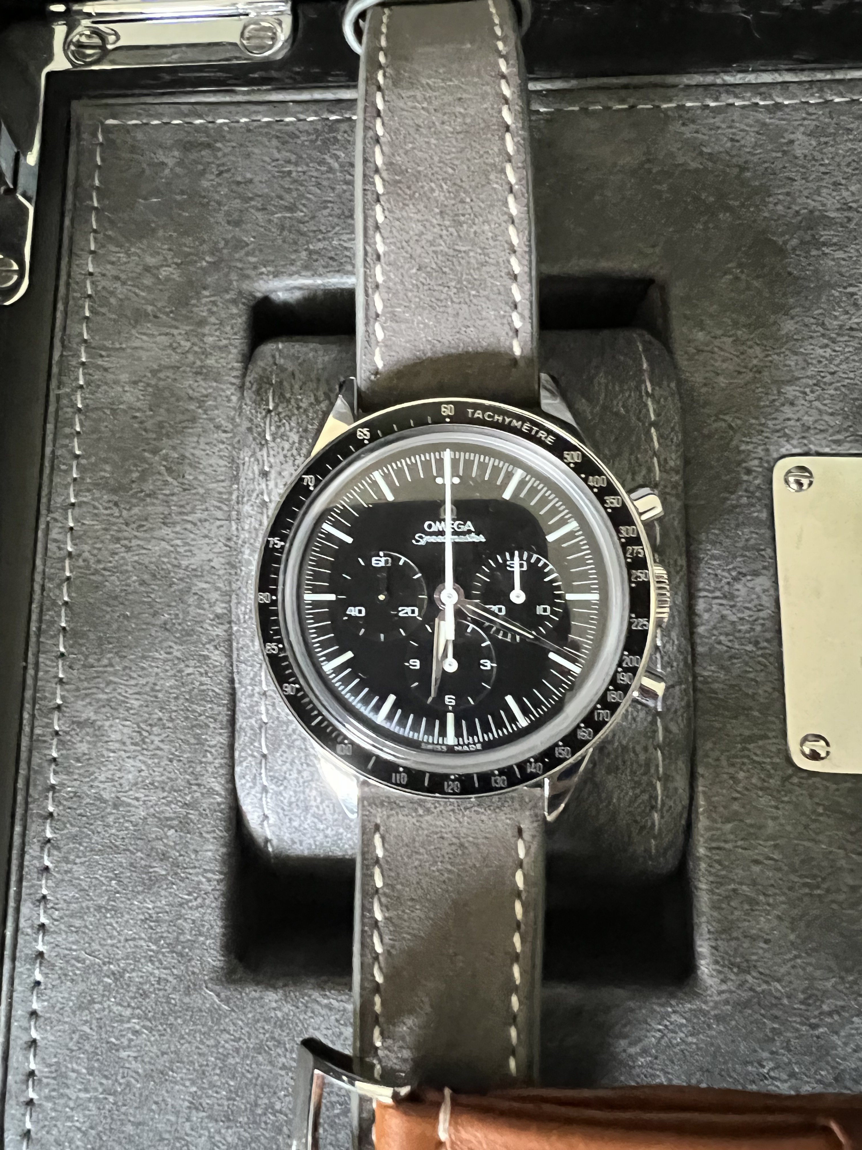 Bracelet: Original 19mm Omega Leather Band included; watch comes on granite Molequin leather band with quick-release springbars as pics show