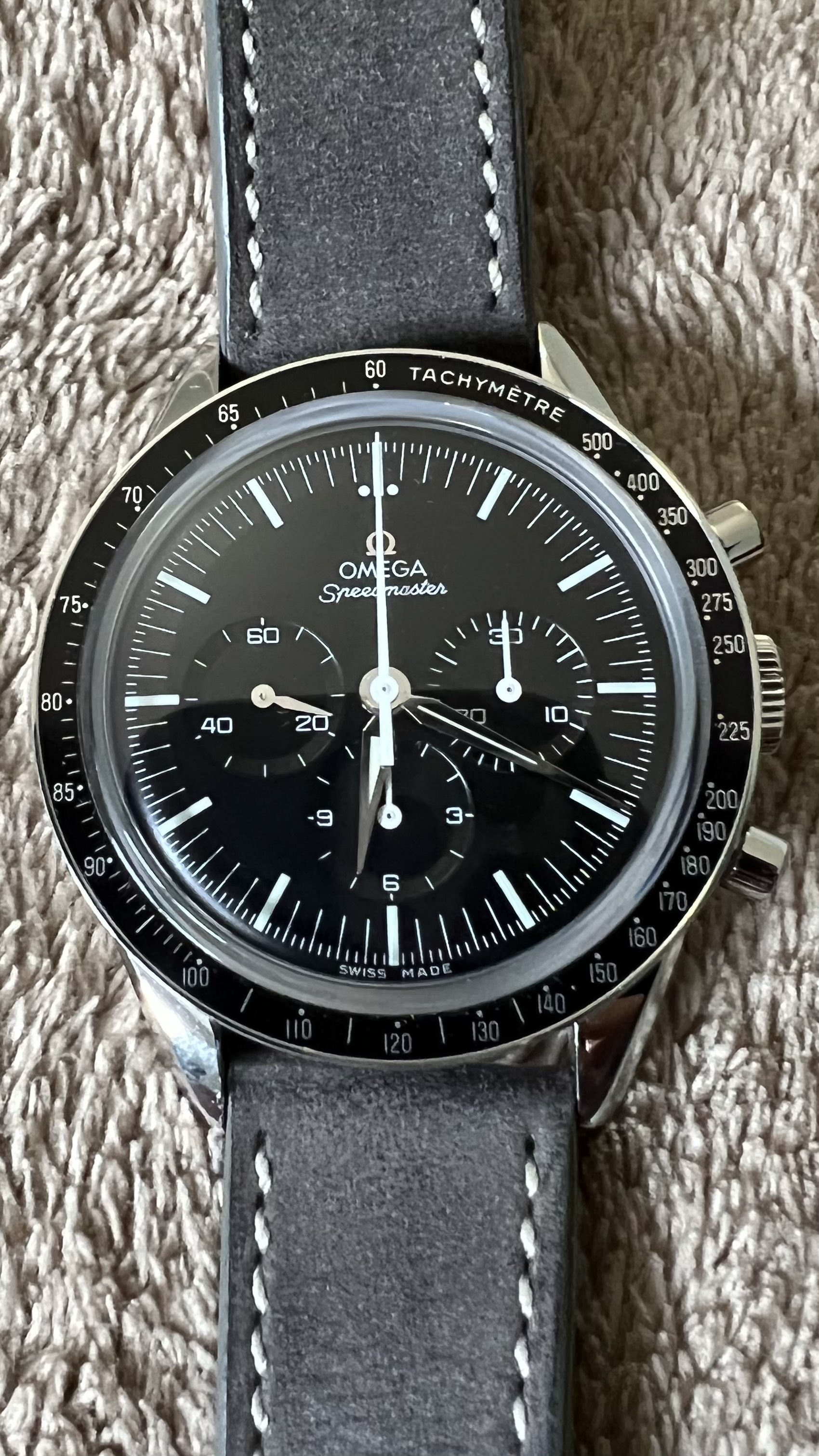 The watch comes paired with a Granite Molequin (short) leather strap - originally €115 - that fits my 7" wrists and the original Omega factory strap is also included as shown in pics. I had got his watch in a trade and am letting this go since I've had too many incoming pieces. Need to trim the waistine of my watch budget by letting go of some beauties.