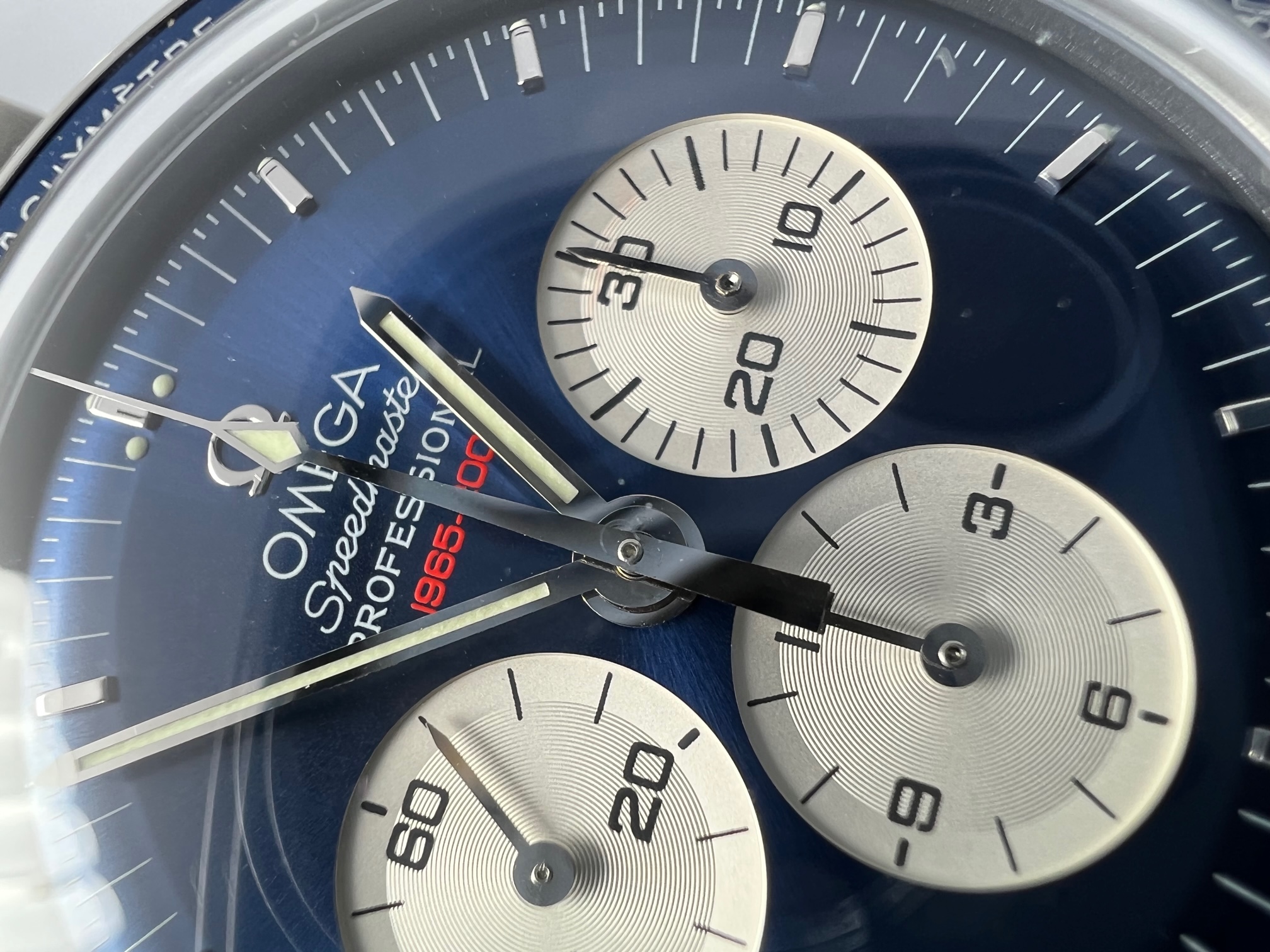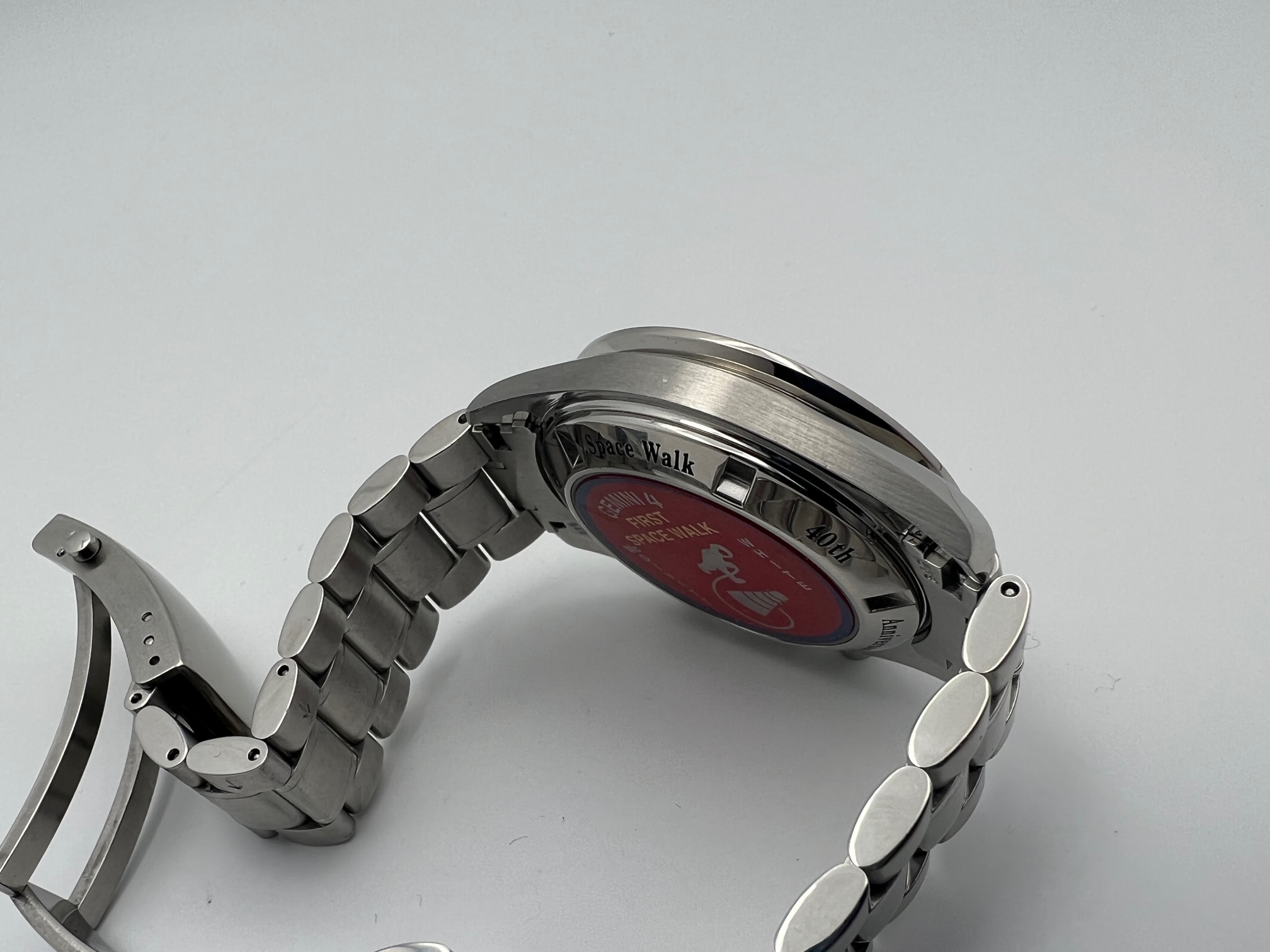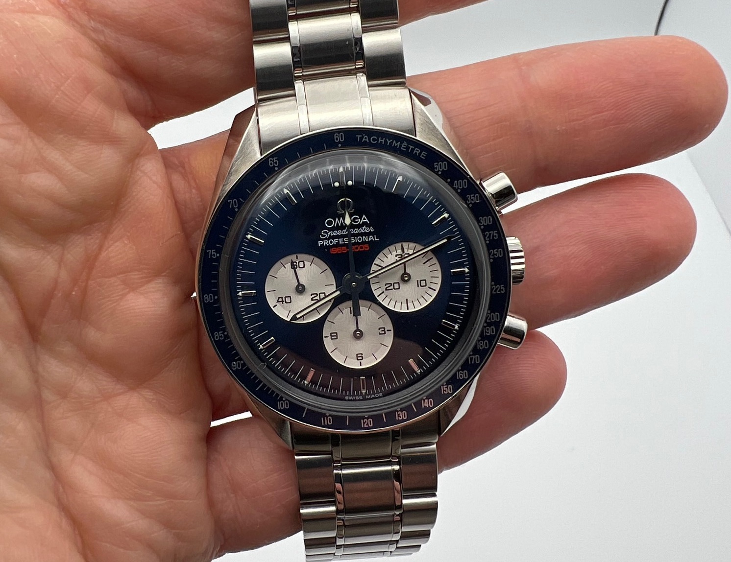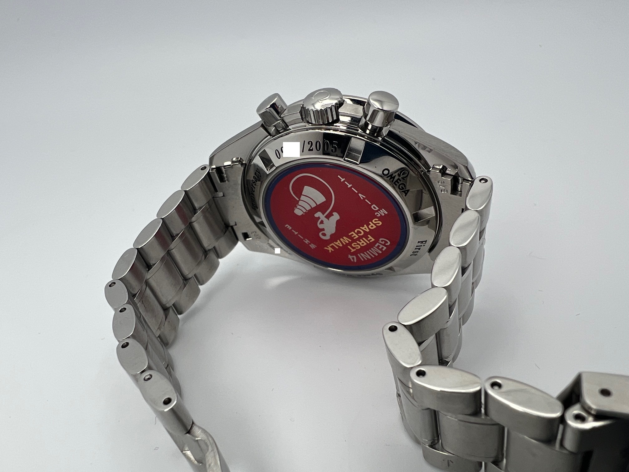 This is a genuine limited edition Gemini IV Speedmaster featuring “panda style” blue dial / countersunk silvered counters with special 1965-2005 engraving in red at 12 o'clock in commemoration of the first space walk and individually numbered case back. Also features the 1861 movement w/ Hesalite sapphire.