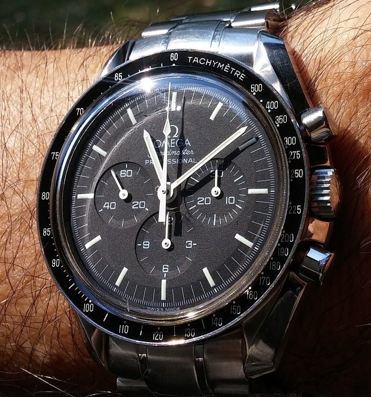 ·For sale is an Omega Speedmaster Professional "Moon Watch" 3572.50.00. It has an integral stainless steel Omega link bracelet with a double deployant push-release clasp, and a Hesalite crystal. There is a sapphire display back engraved with "FIRST WATCH WORN ON THE MOON" "SPEEDMASTER PROFESSIONAL". This watch is known as the “Hesalite Sandwich” and the caliber 1863 is more ornately decorated than the variant in the regular version (caliber 1861), as it is constantly on display through the watch’s sapphire caseback.