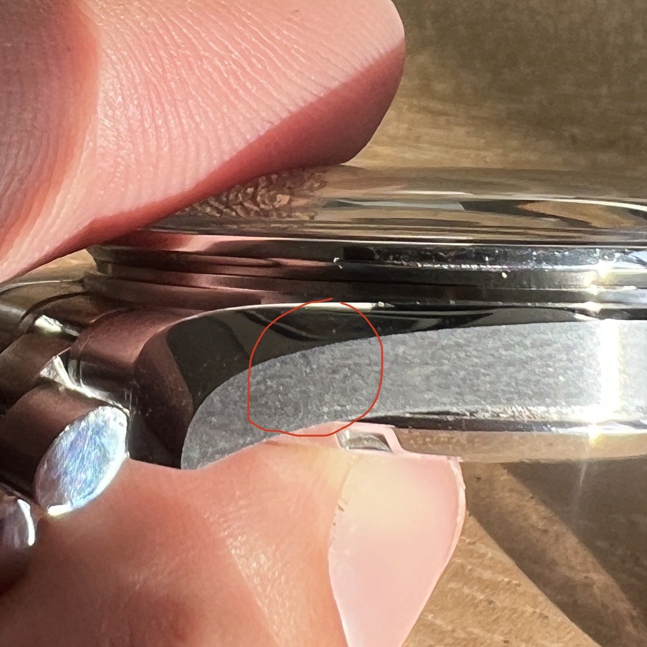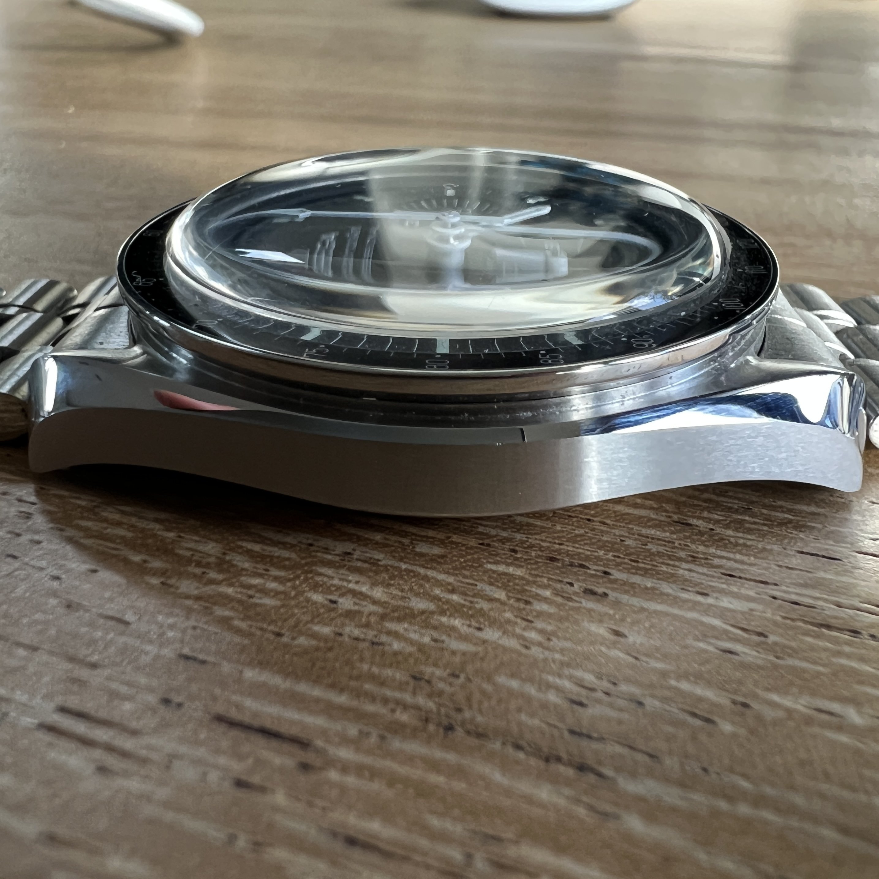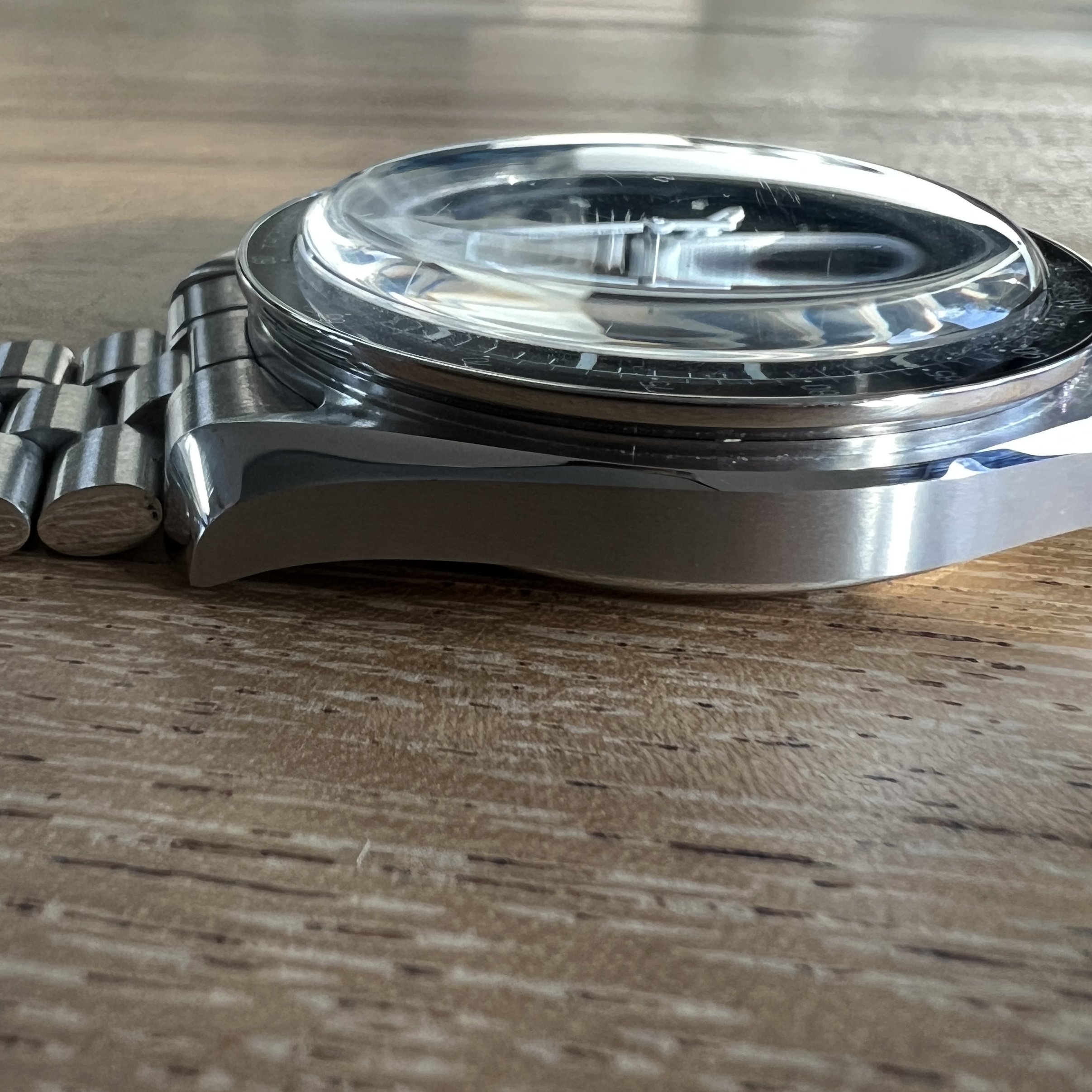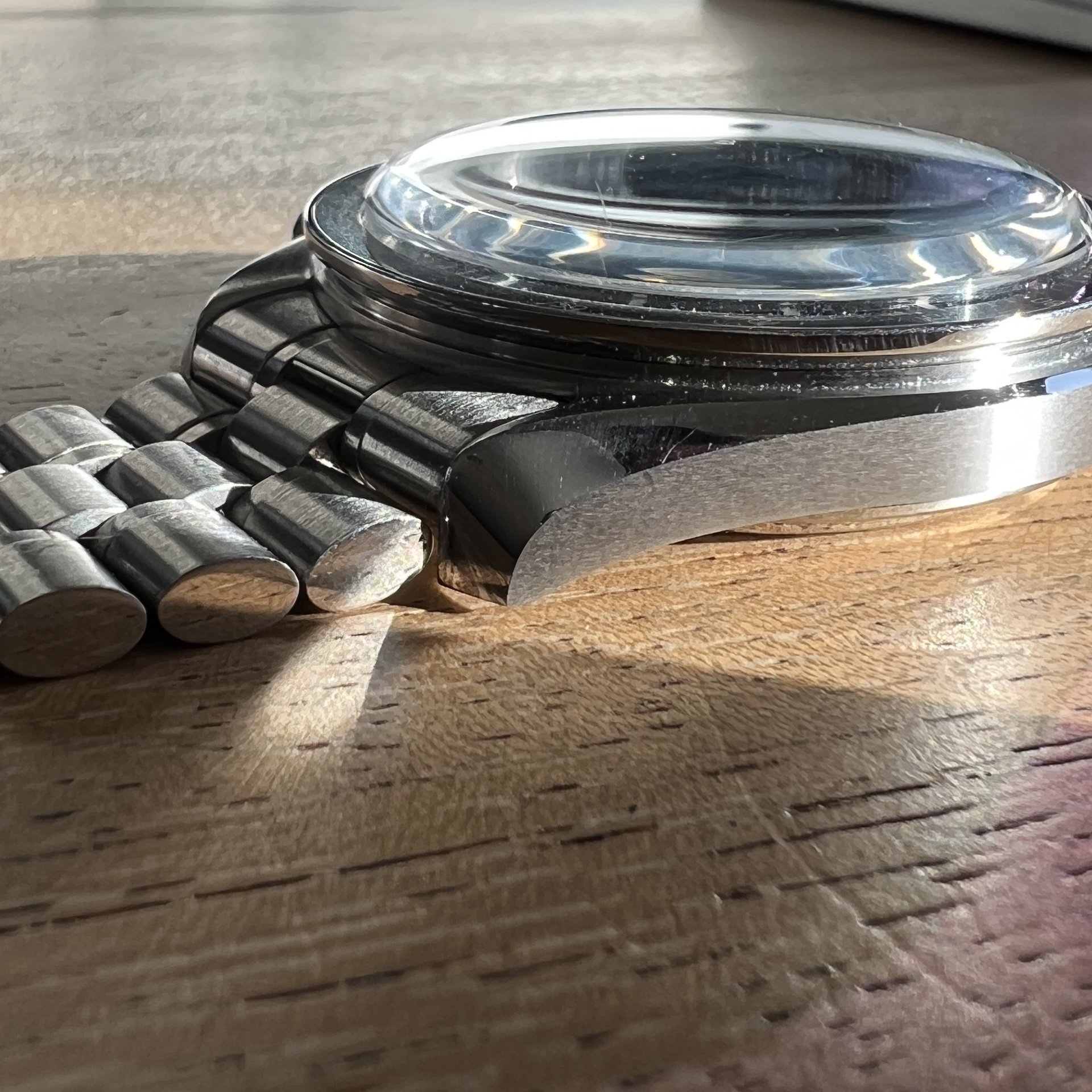 The bad: The tiniest dent in the case, which I have highlighted in the pictures below. Next to that, some hairline scratches on the clasp and case back. Of course the hesalite has taken some micro scratches too, but nothing that a little bit of Polywatch couldn't resolve. I've left them in there for the next owner. Of course I'd be happy to polish them out for you, but perhaps it could be your bonding experience with your great new watch instead? 😁