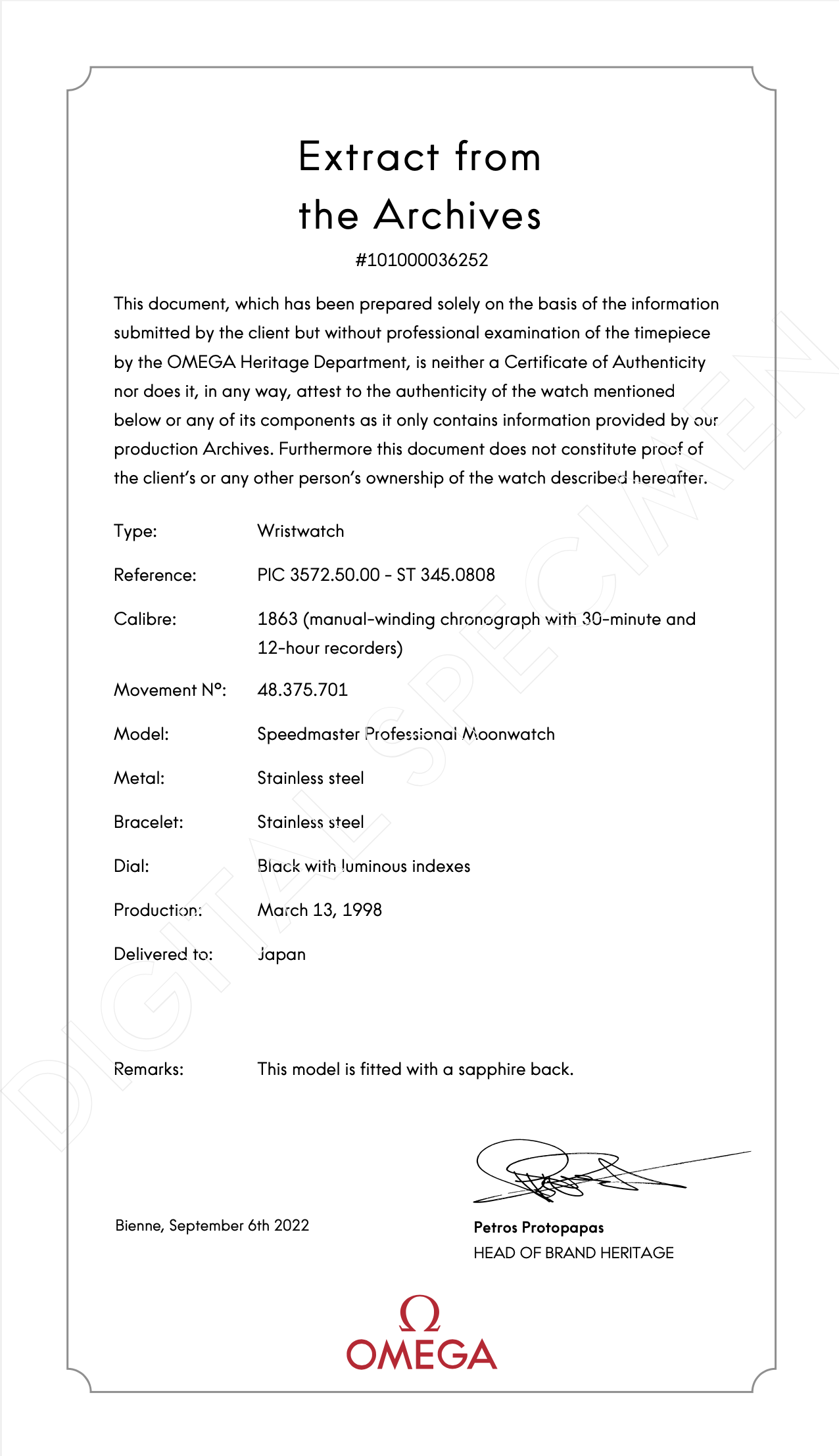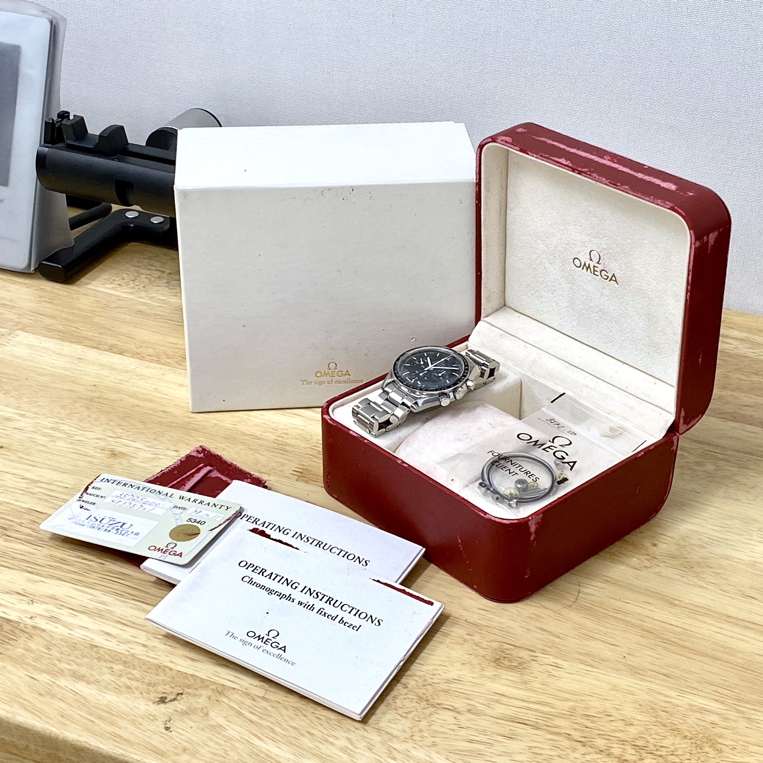 Included - Almost full set - box, booklets and card. Missing swing tag. The original red box is in poor condition as most are. Original parts removed during service. Pressure Test printout. Extract of the Archives from OMEGA.