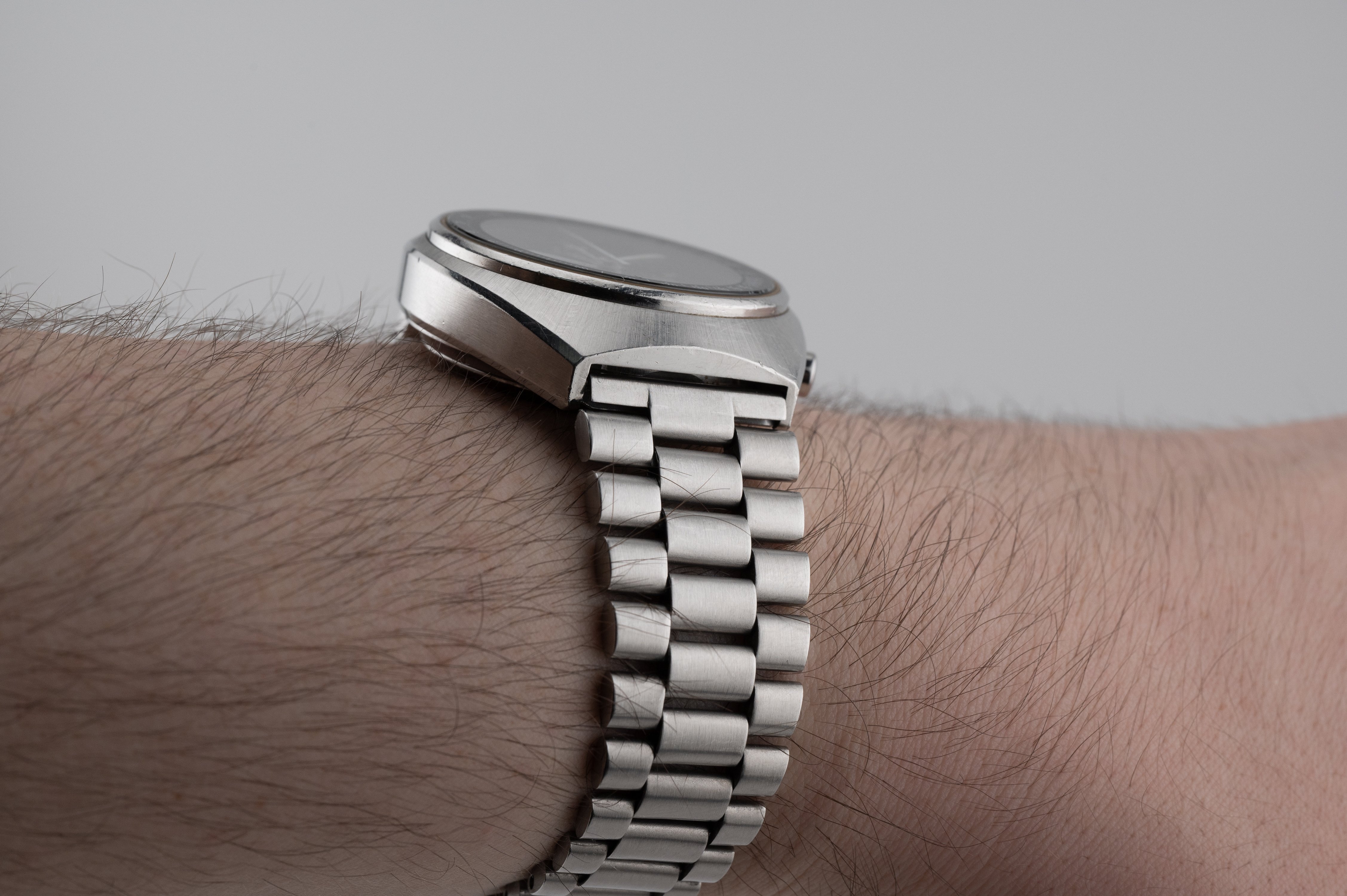 Bracelet has signs of use and is flexy. Apart from being used for the past few decades, I believe these had flex even brand new. It wears great on my 19cm (7.5") wrist and has 2 extra positions on the clasp. I believe it should fit wrists of 19.5 - 20cm.