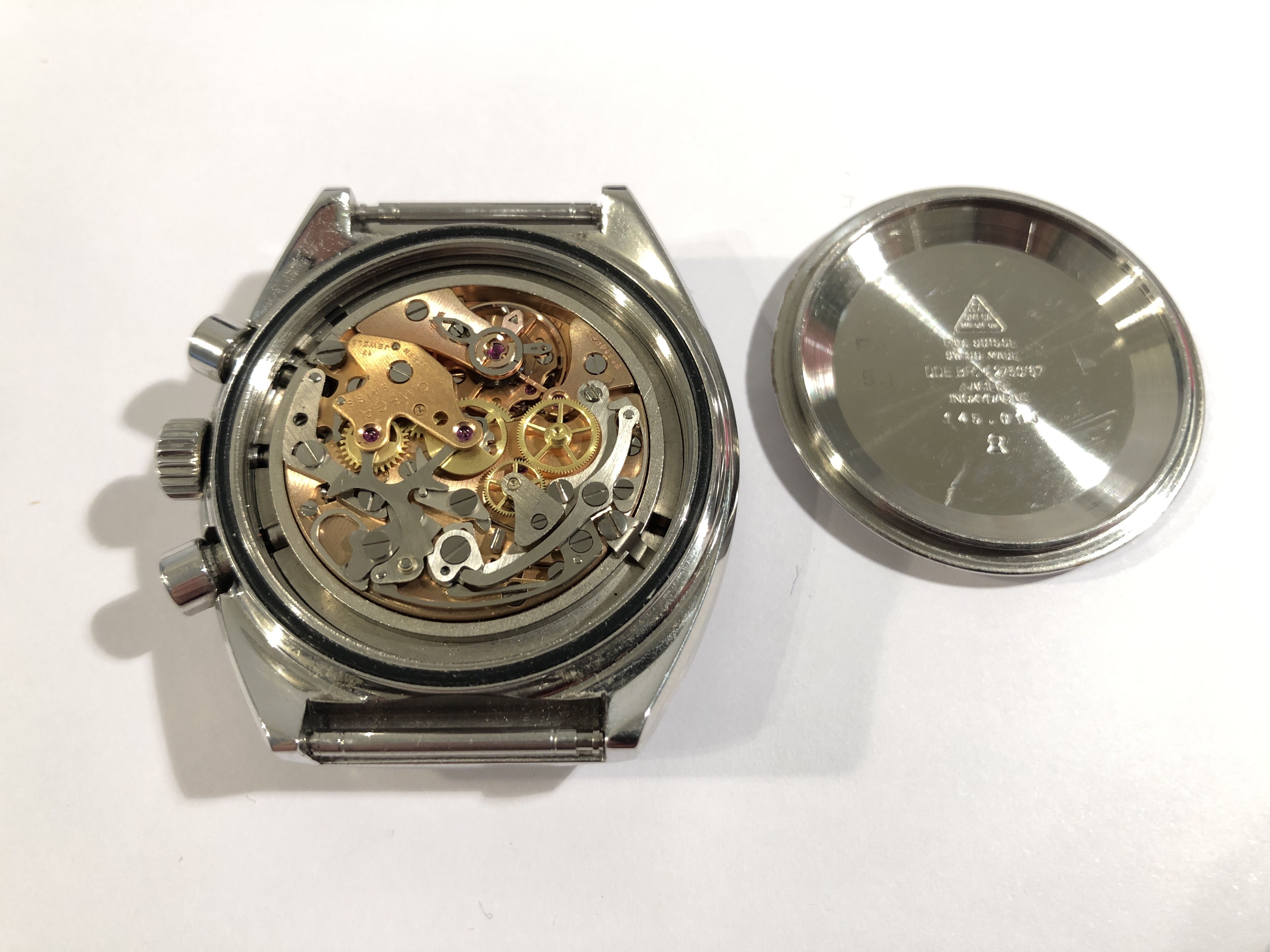 Movement: Of course an 861. Serial in the 3131xxxx range, hence one of the earlier Mark II’s. Runs and winds smoothly, no jumpstart on the chrono. All buttons working properly. Screw heads in clean condition, as is the movement overall. Service history unknown.