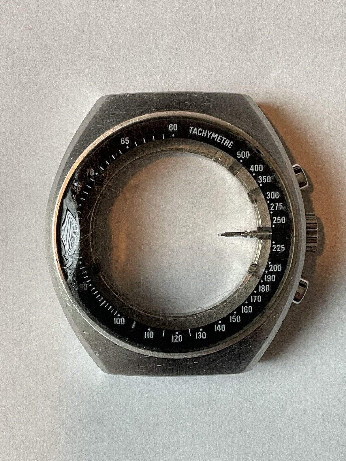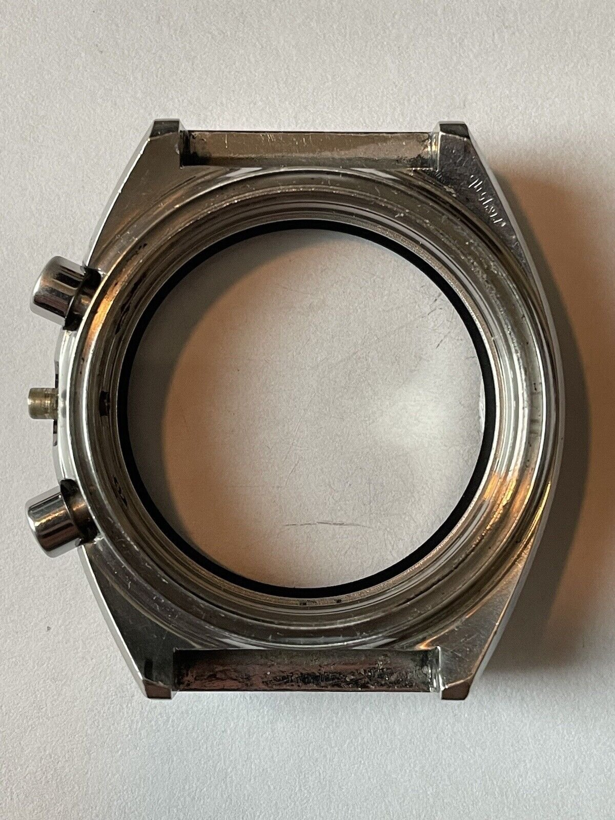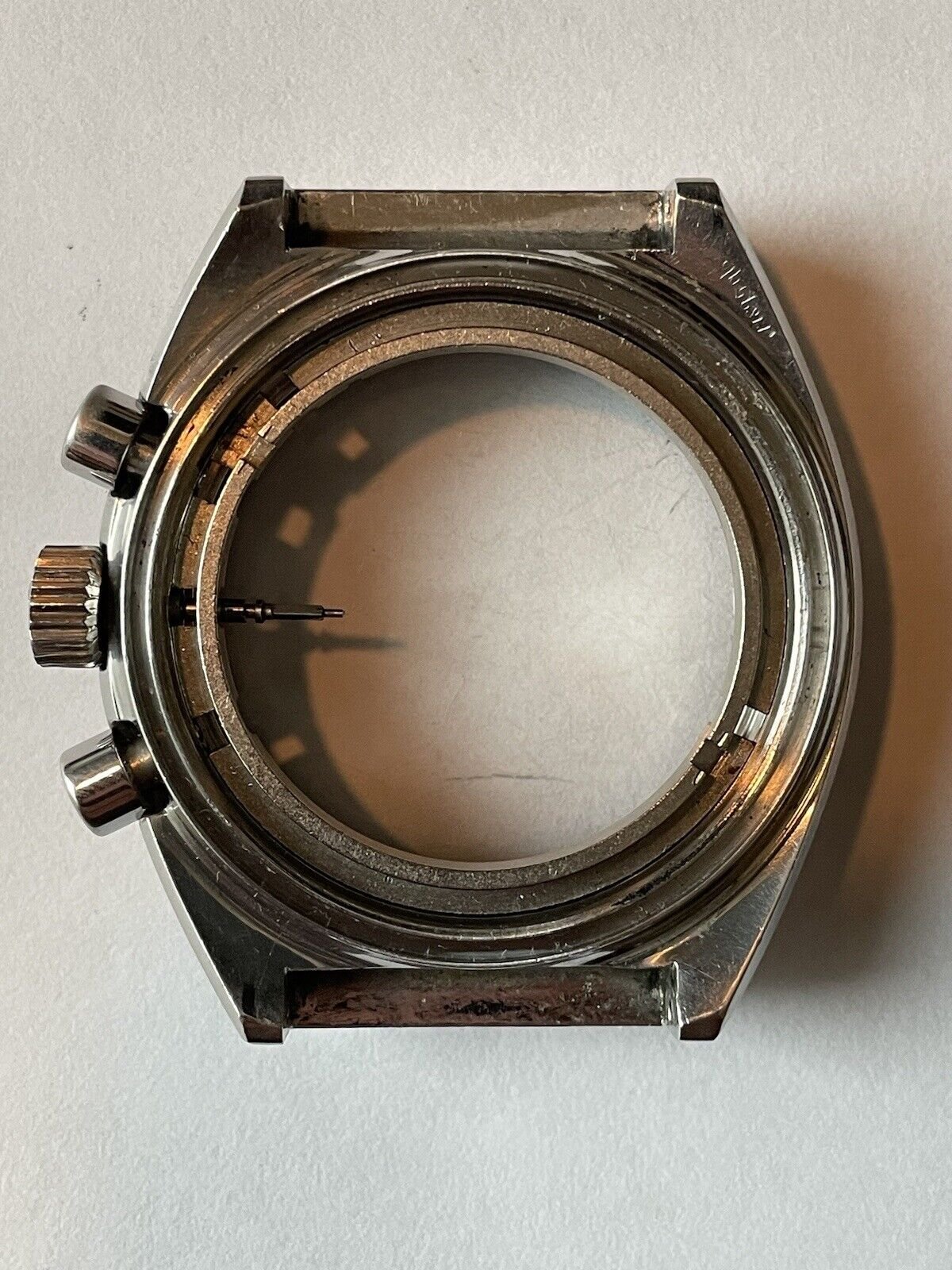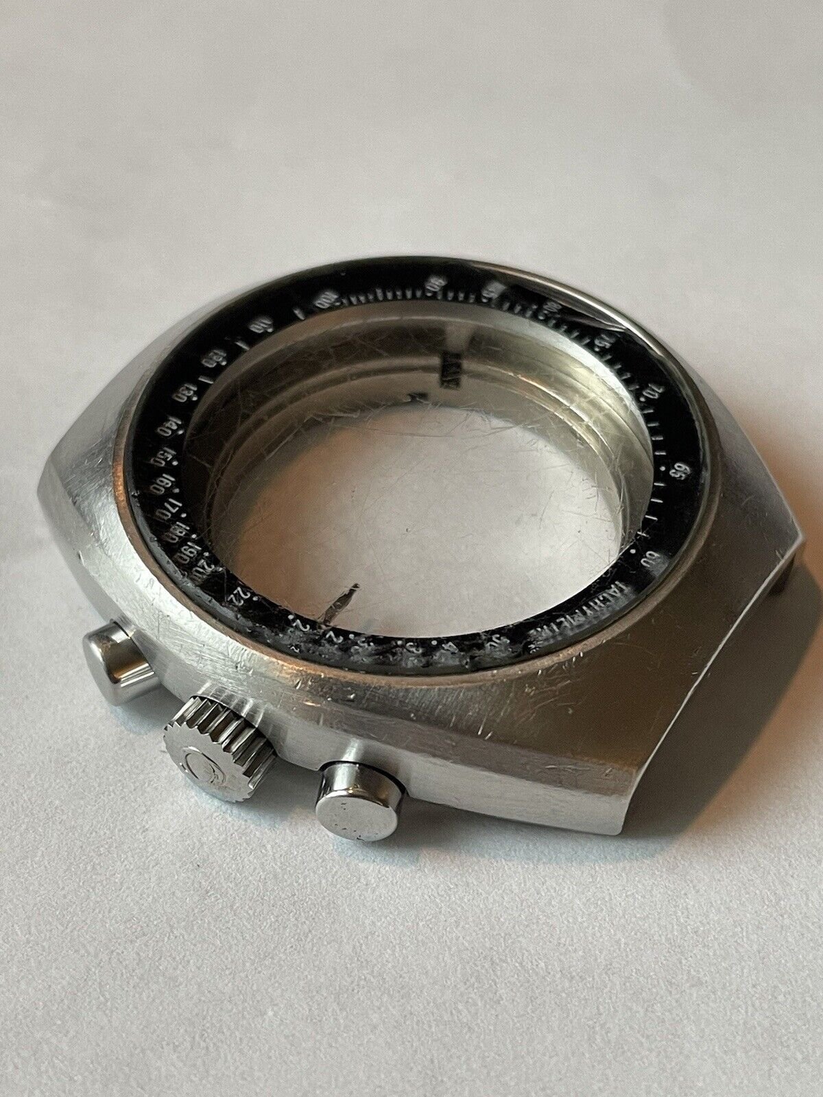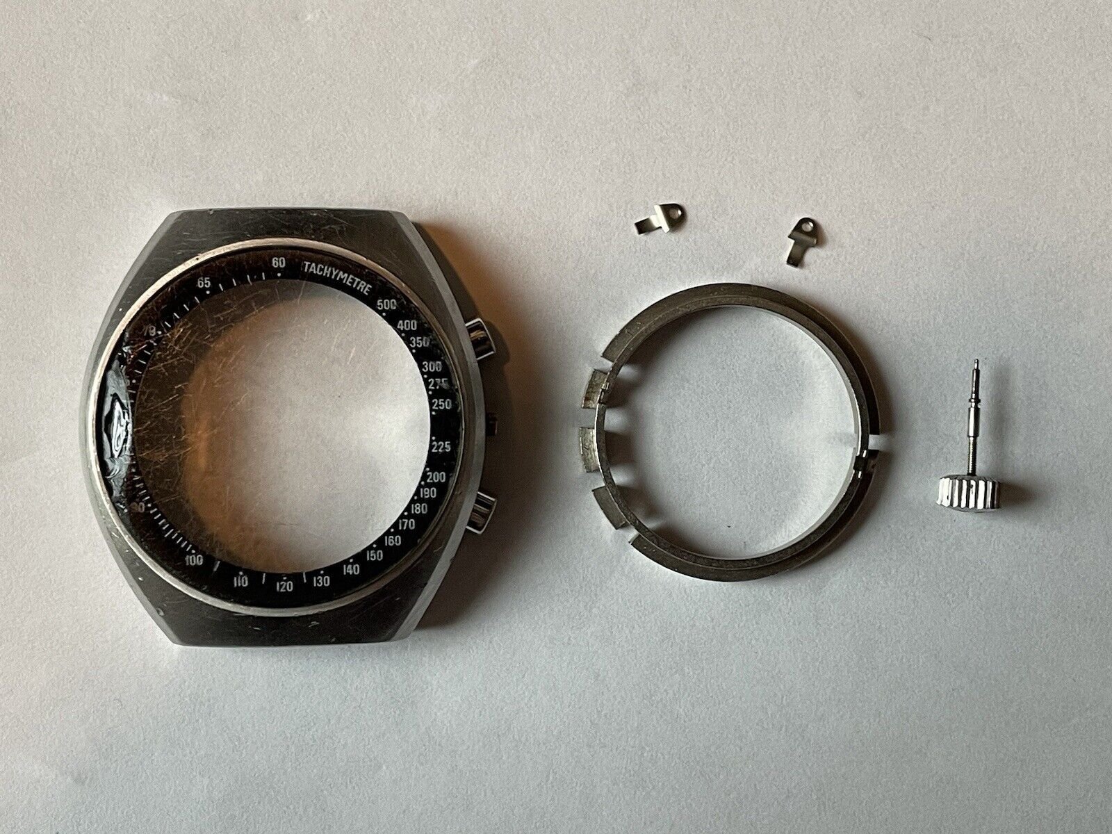 The case and rest of the parts came from a non-working Speedmaster Mark ii reference 145.014 that I purchased for a project but no longer have need of the case, chronograph pushers, crown, winding stem, movement holder clamps or movement holder. Could be some great parts for a Speedmaster Mark ii project.