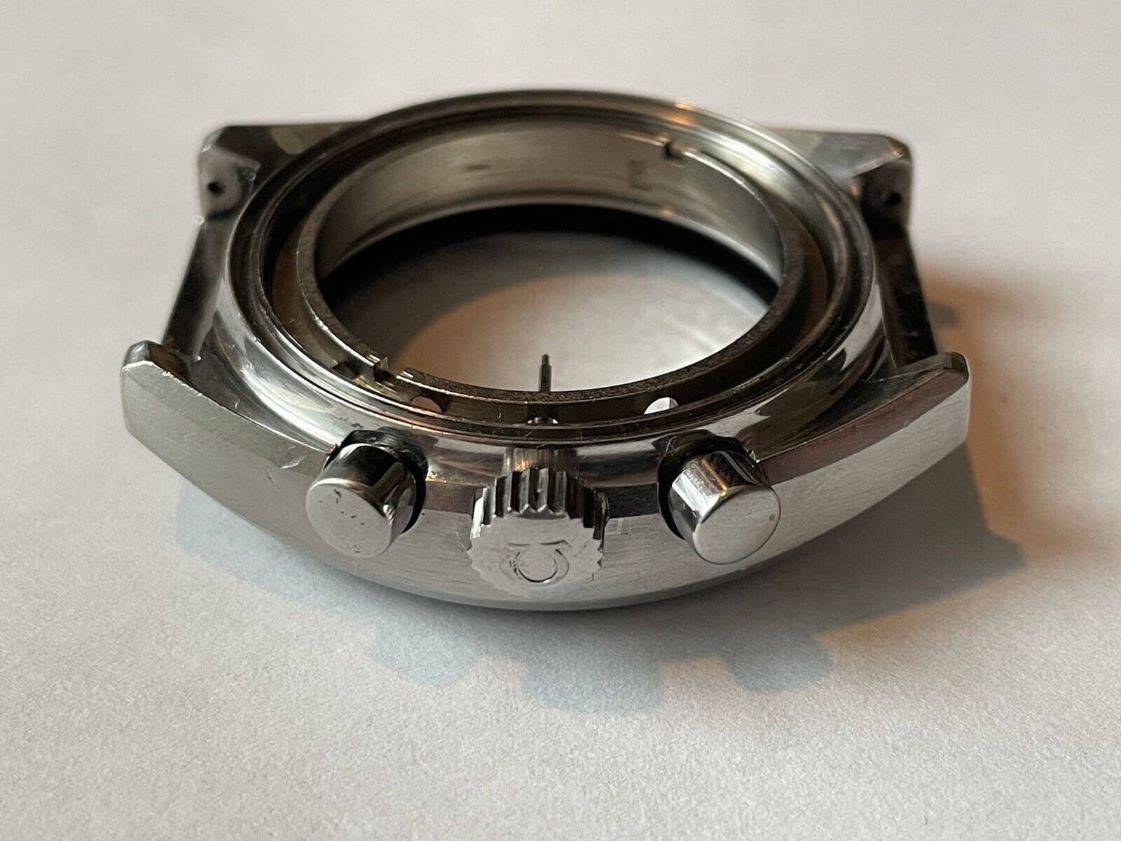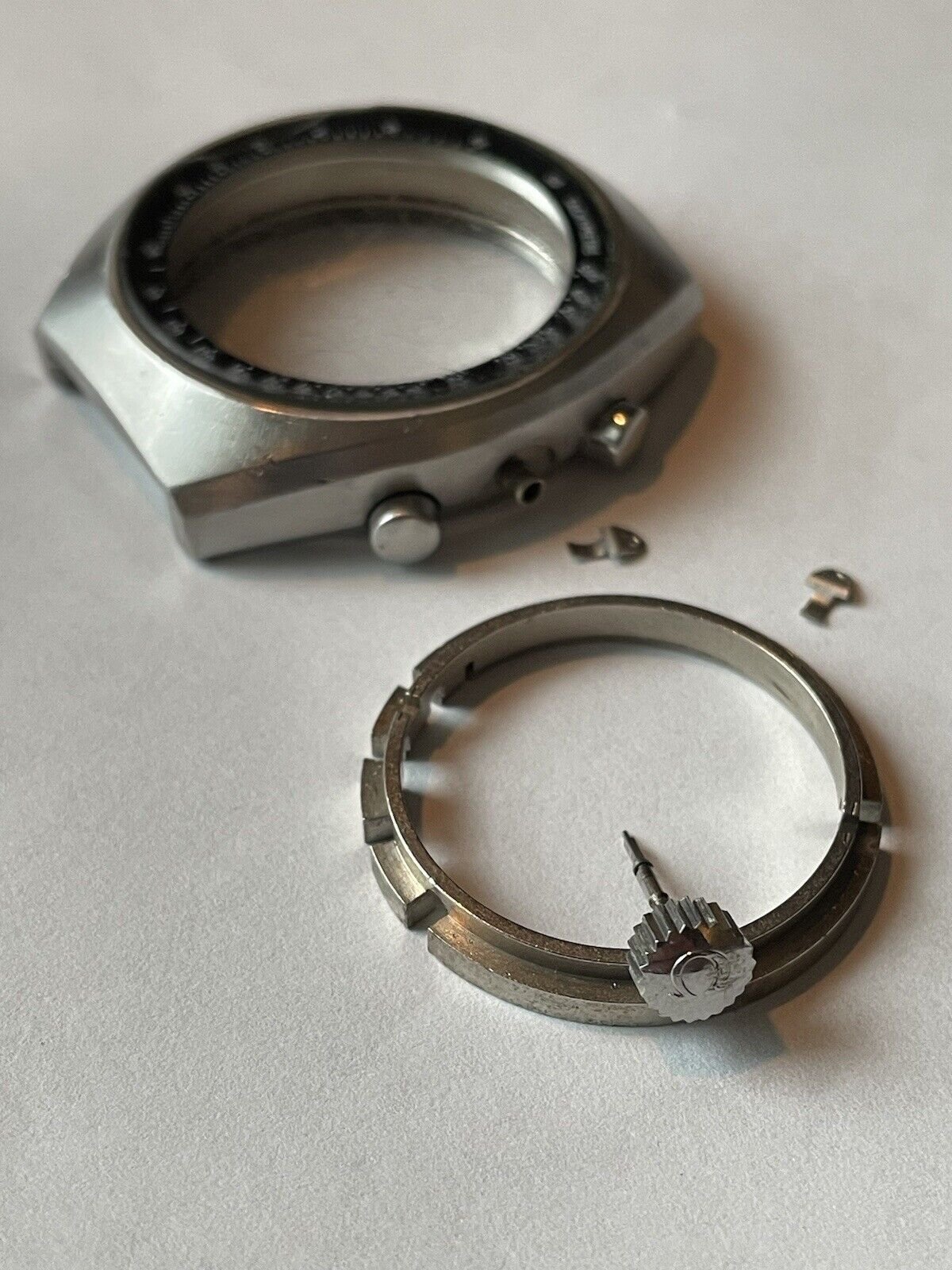 Offering for sale a pre-owned vintage Omega Speedmaster Mark ii Case, Pushers, Crown with Winding Stem, movement holder clasps & Movement Holder. Does not come with caseback as when the watch came to me it was fitted with a Seamaster 176.002 reference caseback, which I understand to be incorrect for the case itself.